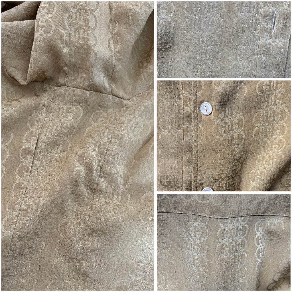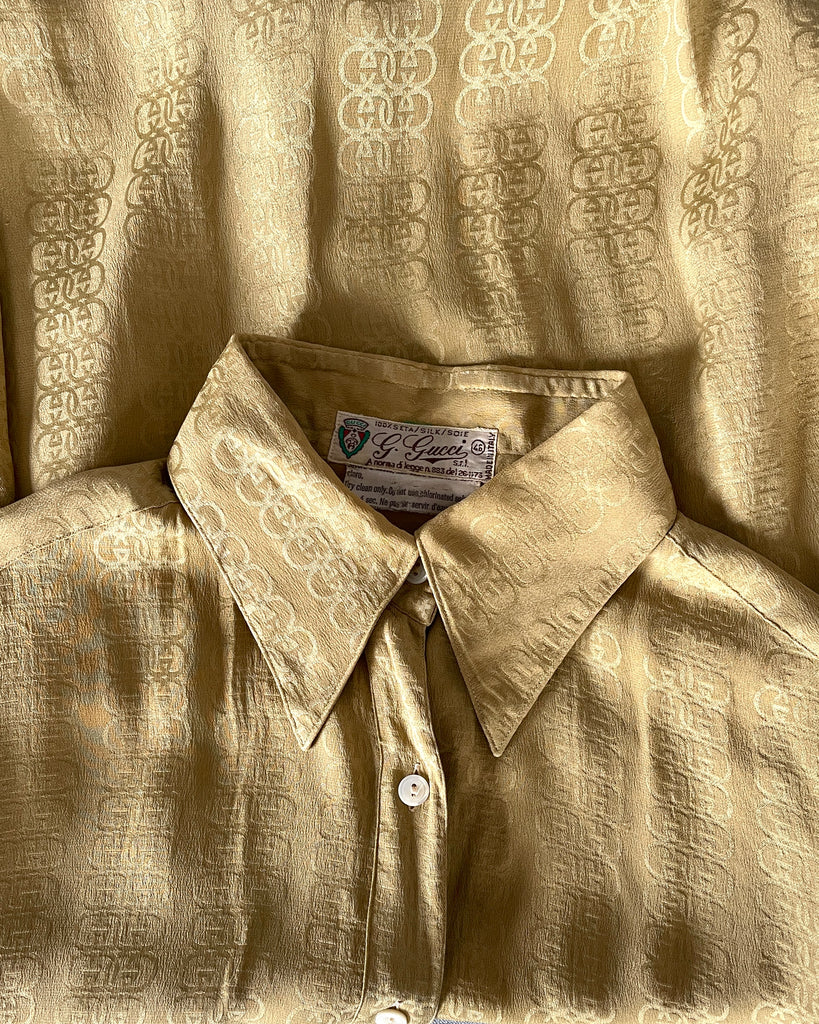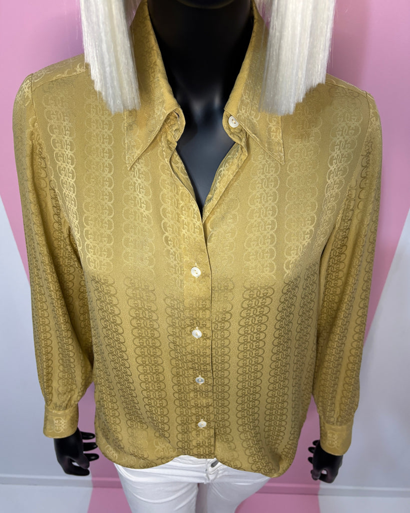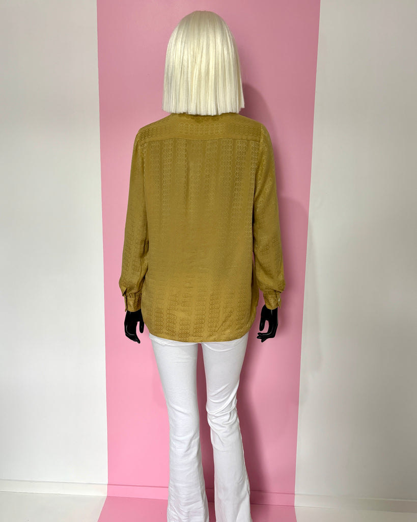 Chemisier en soie façonnée du monogramme de la maison de couleur dorée. Coupe droite, col en pointe et fermeture par simple boutonnage. Manches avec jeu de plis aux poignets fermés par 1 bouton.