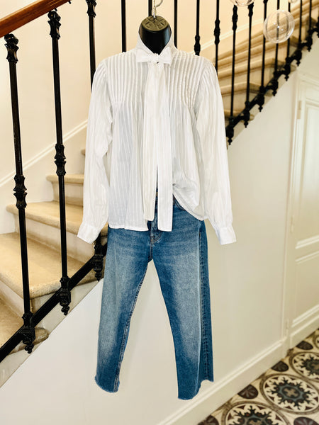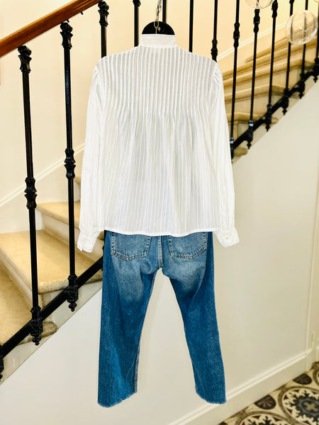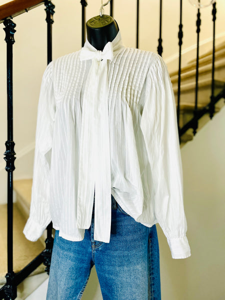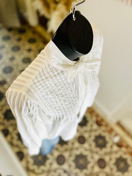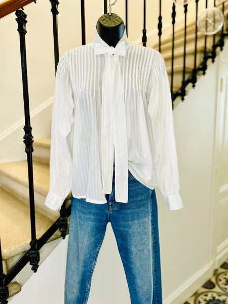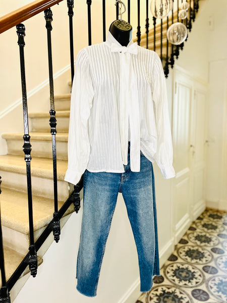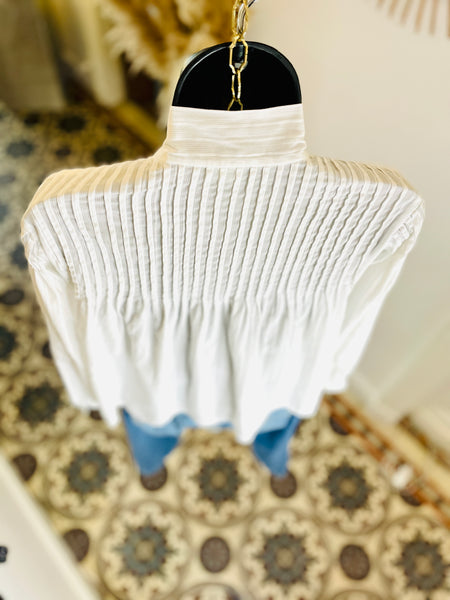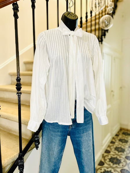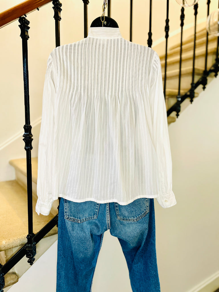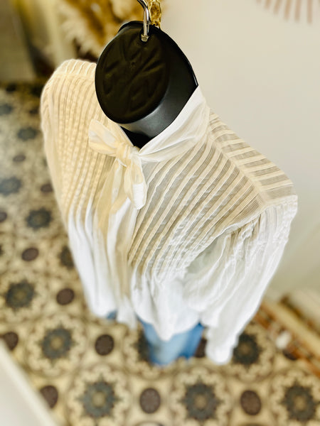 Chemisier en coton blanc avec jeu de rayures fines et plus épaisses ton sur ton. Col lavallière, plis plats sur la poitrine, les épaules et dans le dos. Coupe évasée et manches bouffantes. Fermeture simple boutonnage et poignets fermés par 1 bouton. Légèrement transparente.