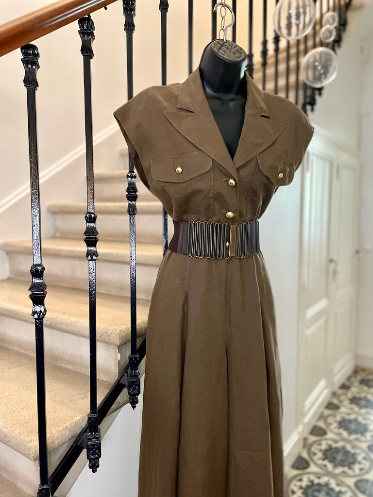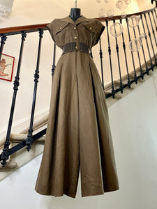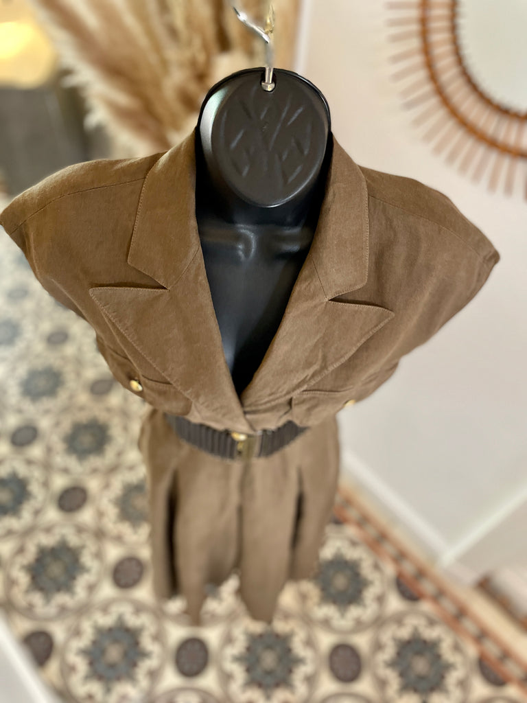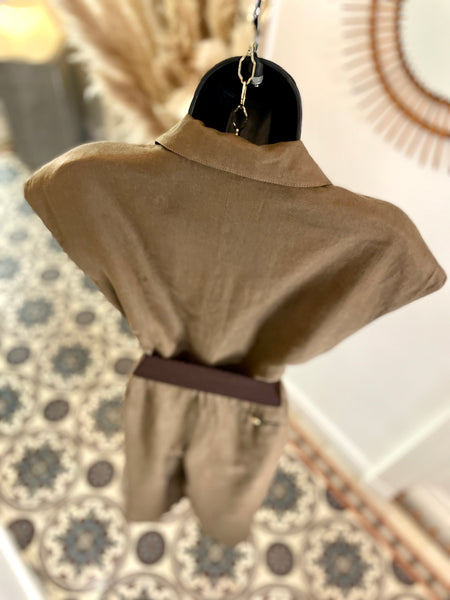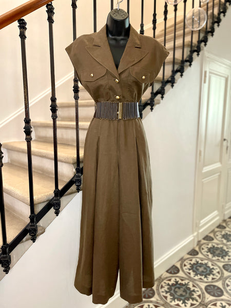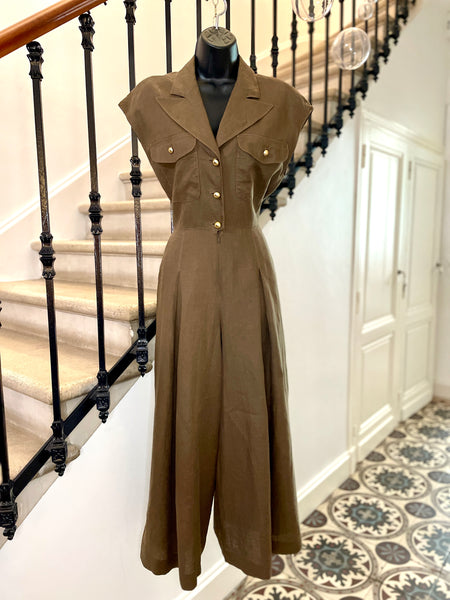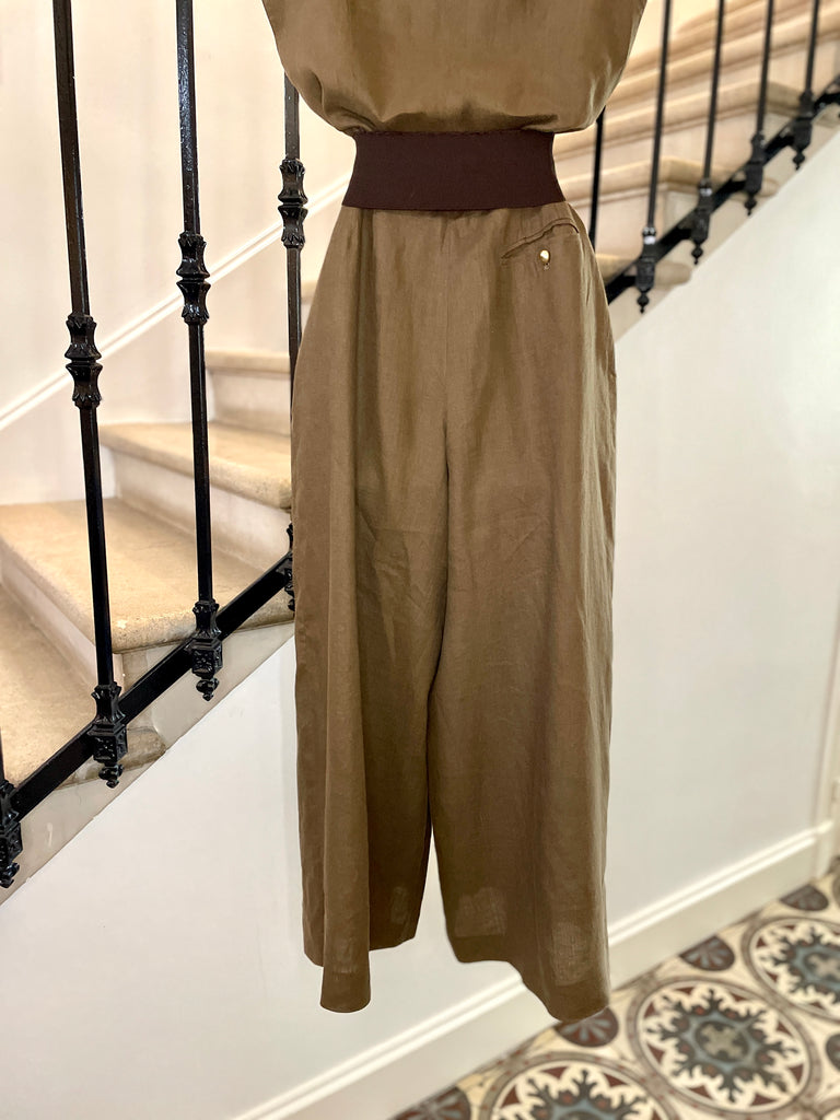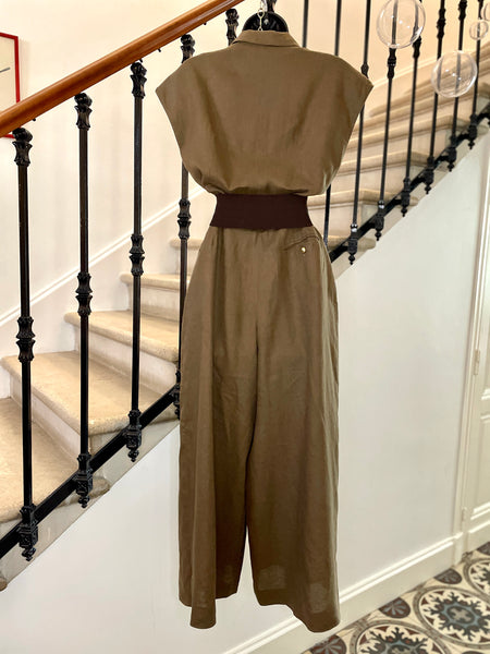 Combi-pantalon en lin de couleur chocolat au lait avec boutons dorés. Buste avec décolleté en V, col plat et revers en pointe, sans manches mais épaules couvertes par une découpe en arrondi avec de très légères épaulettes, 2 poches poitrine avec rabat et 1 bouton et fermeture par 3 boutons. Pantalon taille haute et marquée, fermé par un zip masqué et jambes extra larges avec pli creux. 2 poches latérales masquées et 1 poche passepoilée avec 1 bouton sur la fesse droite. Doublée uniquement sur la partie buste.