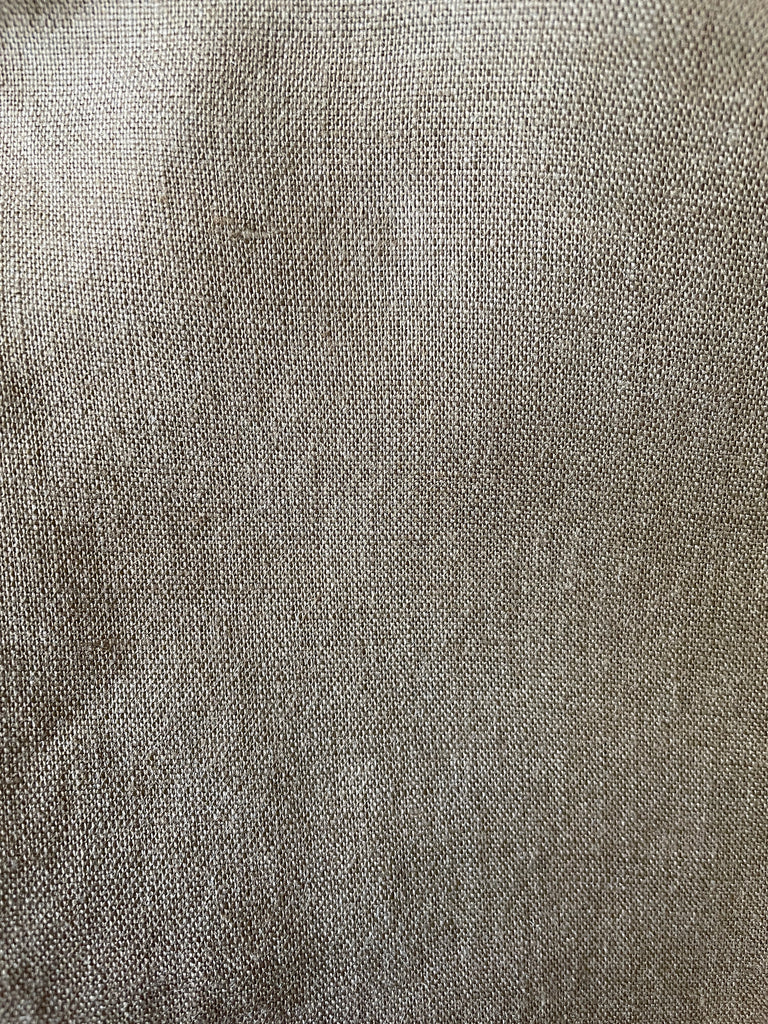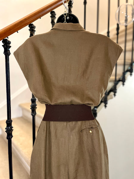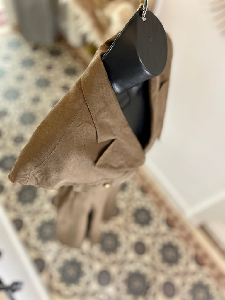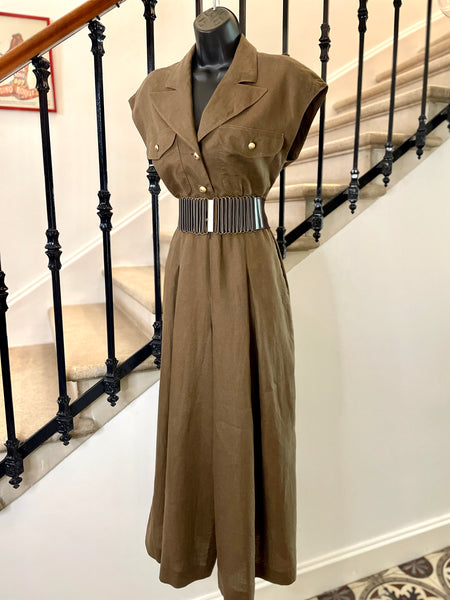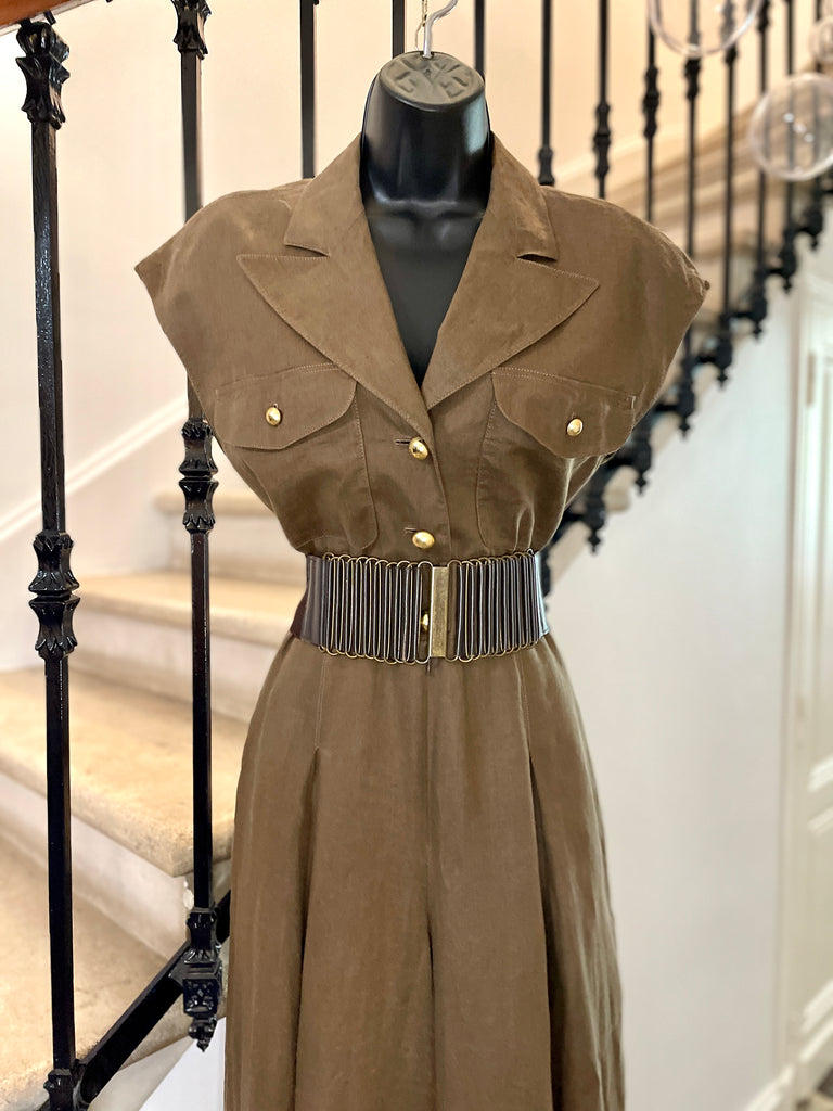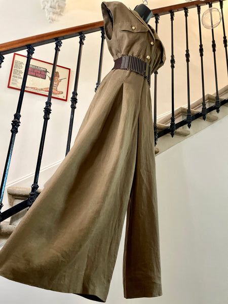 Combi-pantalon en lin de couleur chocolat au lait avec boutons dorés. Buste avec décolleté en V, col plat et revers en pointe, sans manches mais épaules couvertes par une découpe en arrondi avec de très légères épaulettes, 2 poches poitrine avec rabat et 1 bouton et fermeture par 3 boutons. Pantalon taille haute et marquée, fermé par un zip masqué et jambes extra larges avec pli creux. 2 poches latérales masquées et 1 poche passepoilée avec 1 bouton sur la fesse droite. Doublée uniquement sur la partie buste.