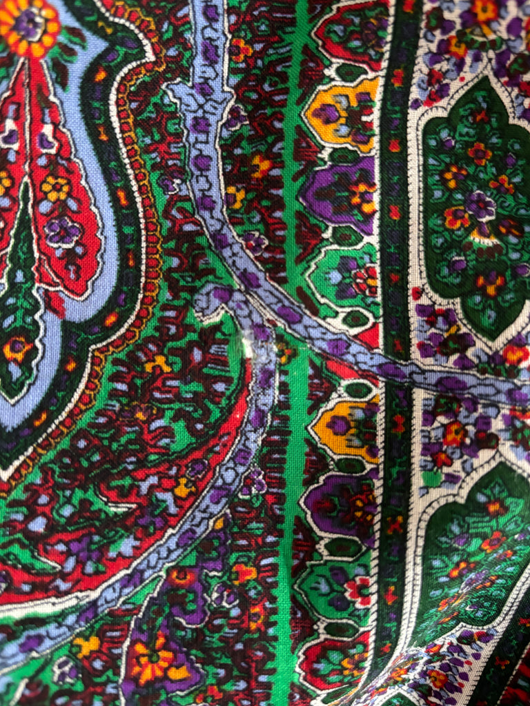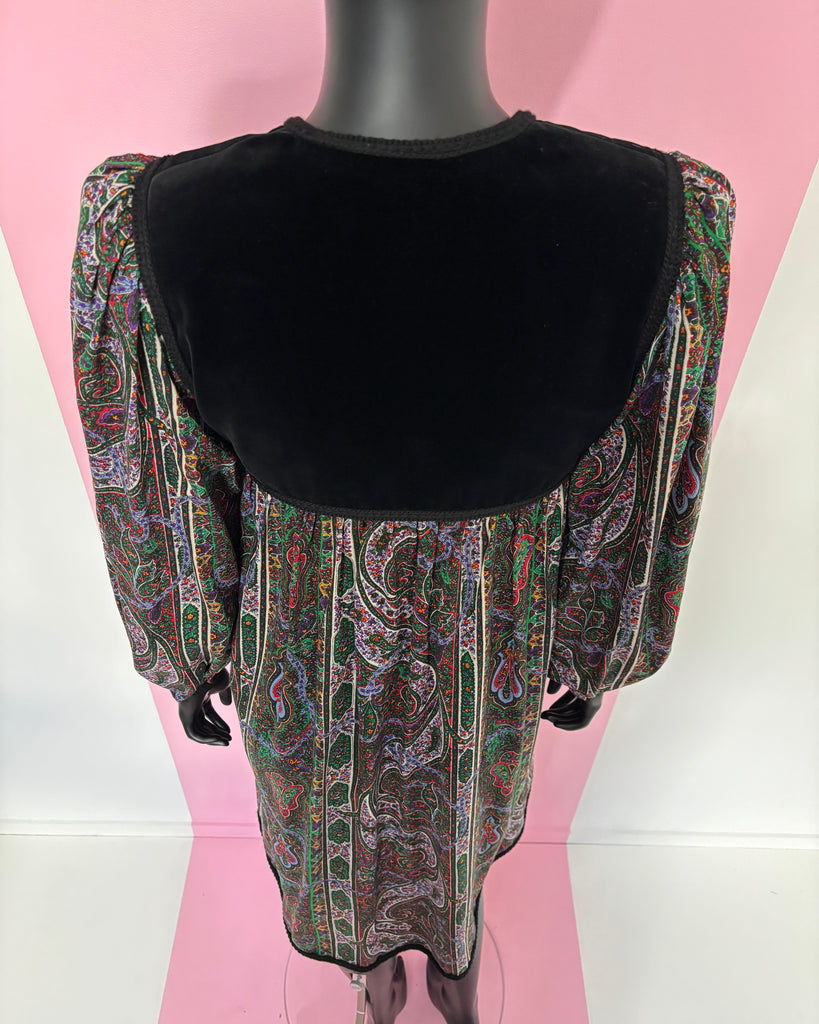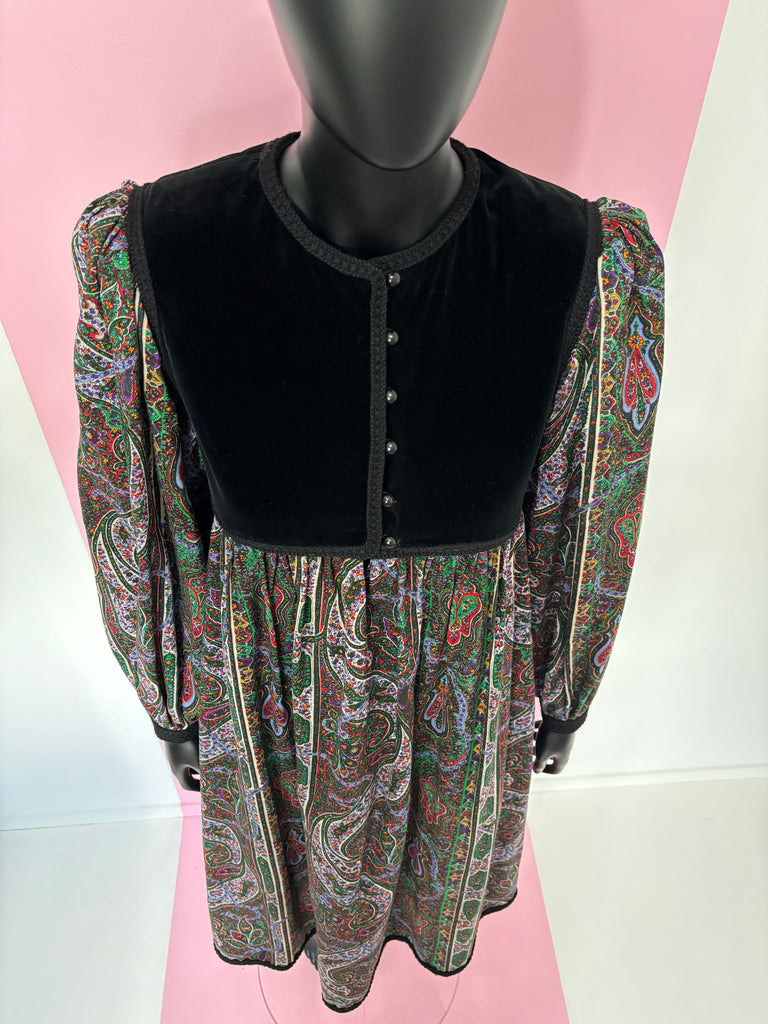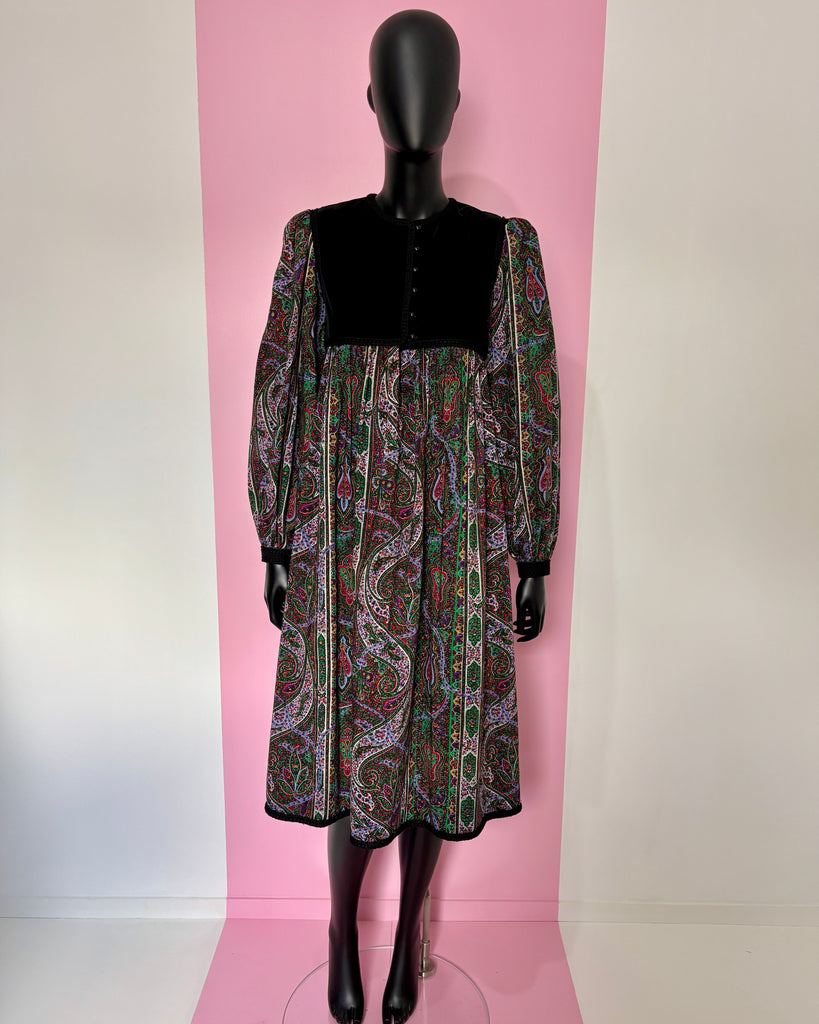 Robe bi-matière en velours noir et étamine de laine à l’imprimé cachemire dans des tons vert, violet et rouge, gansée d’un galon en laine noire. Coupe ajustée à la poitrine, puis ample. Plastron fermé par de petits boutons noirs et petite fente. Manches légèrement bouffantes par jeu de plis aux épaules (avec épaulettes qui peuvent être retirées) et poignets, fermées par 1 petit bouton. Doublée sur la partie plastron.