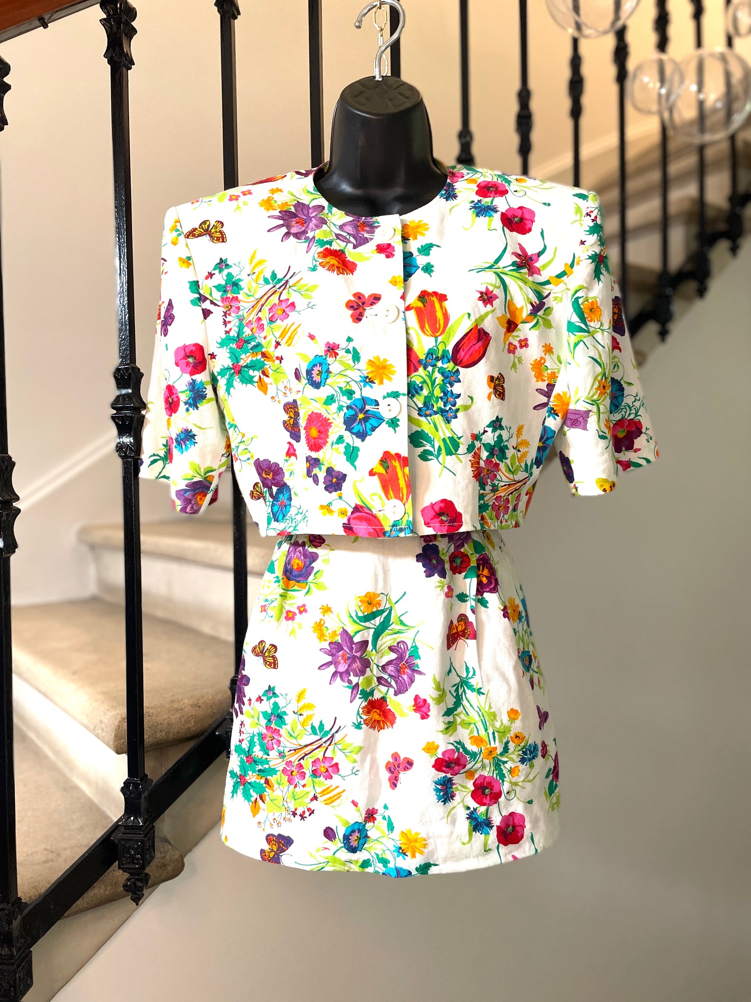 Ensemble veste et mini jupe en lin à l'imprimé Flora. Veste croped, encolure ronde, fermeture par simple boutonnage avec boutons blancs et maxi épaulettes. Mini jupe, coupe droite, 2 poches latérales, fermeture au dos par zip masqué et bouton. La veste et la jupe sont doublées.