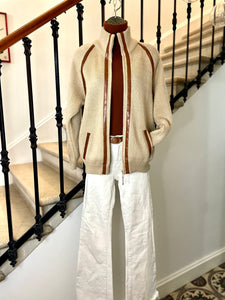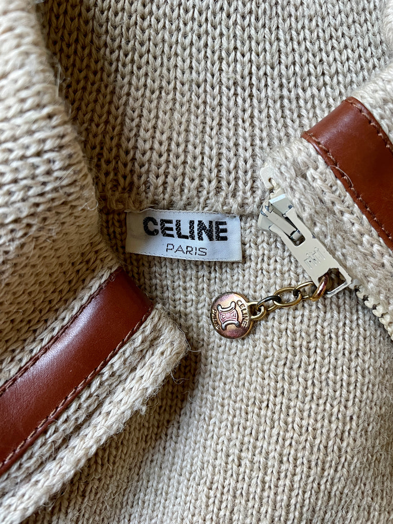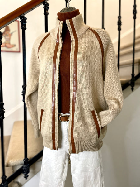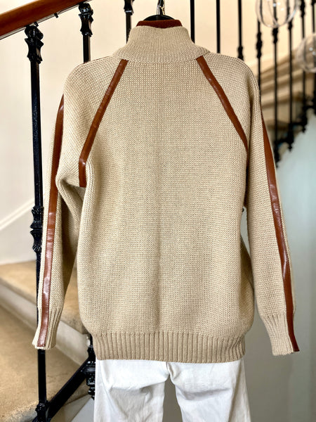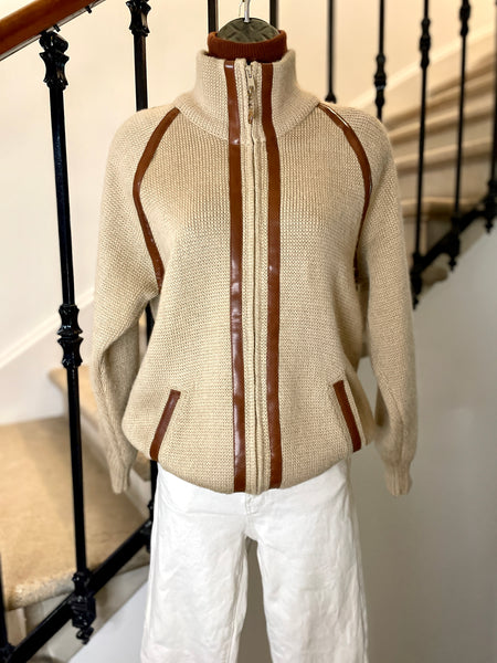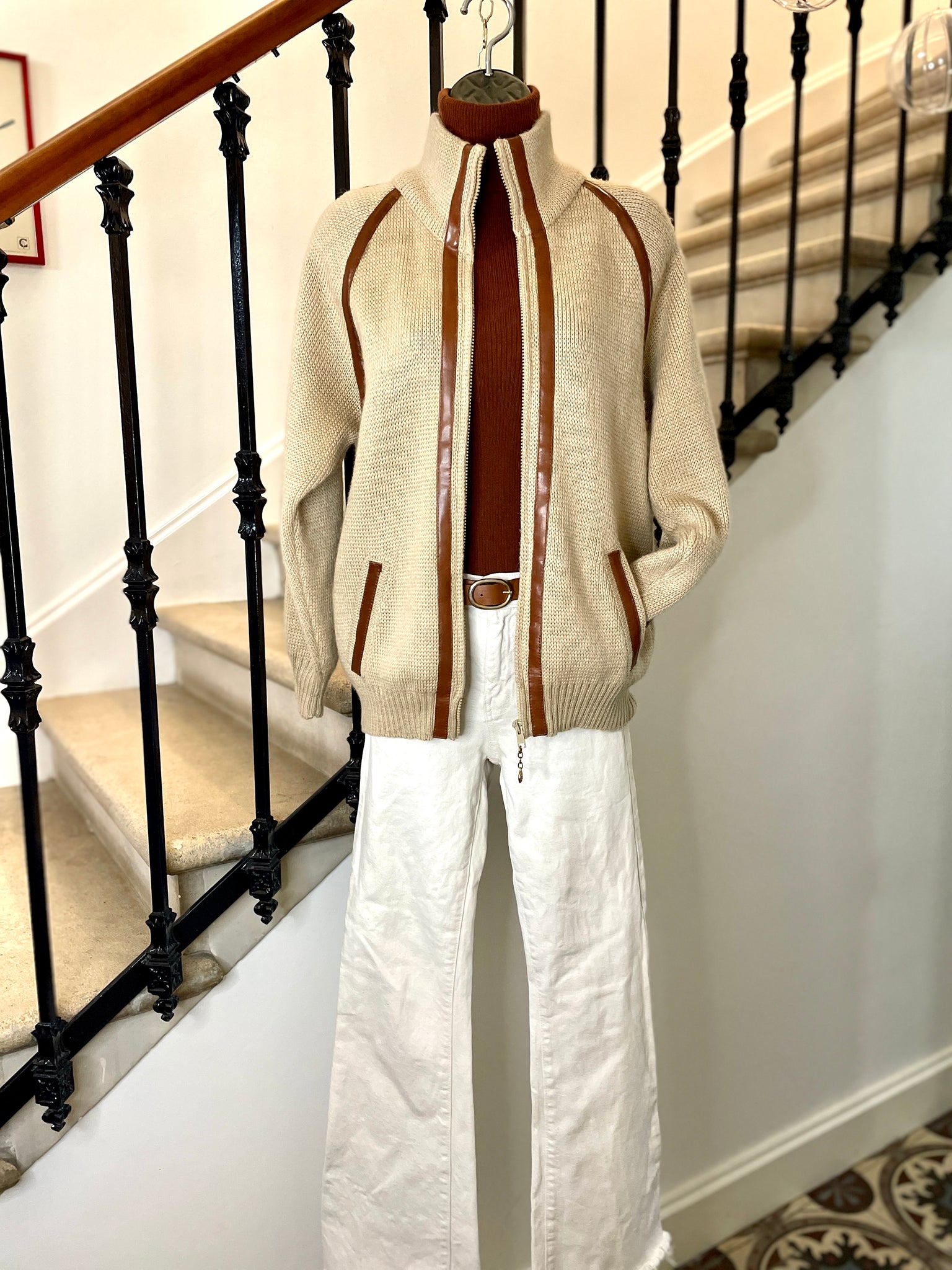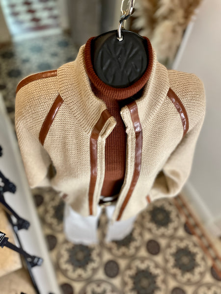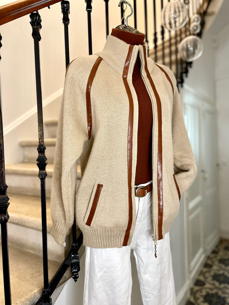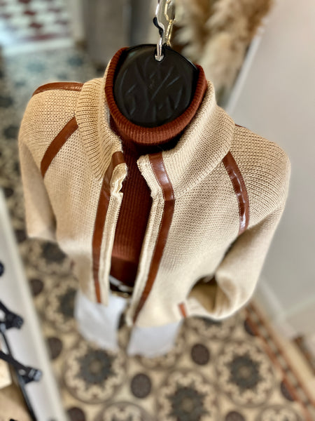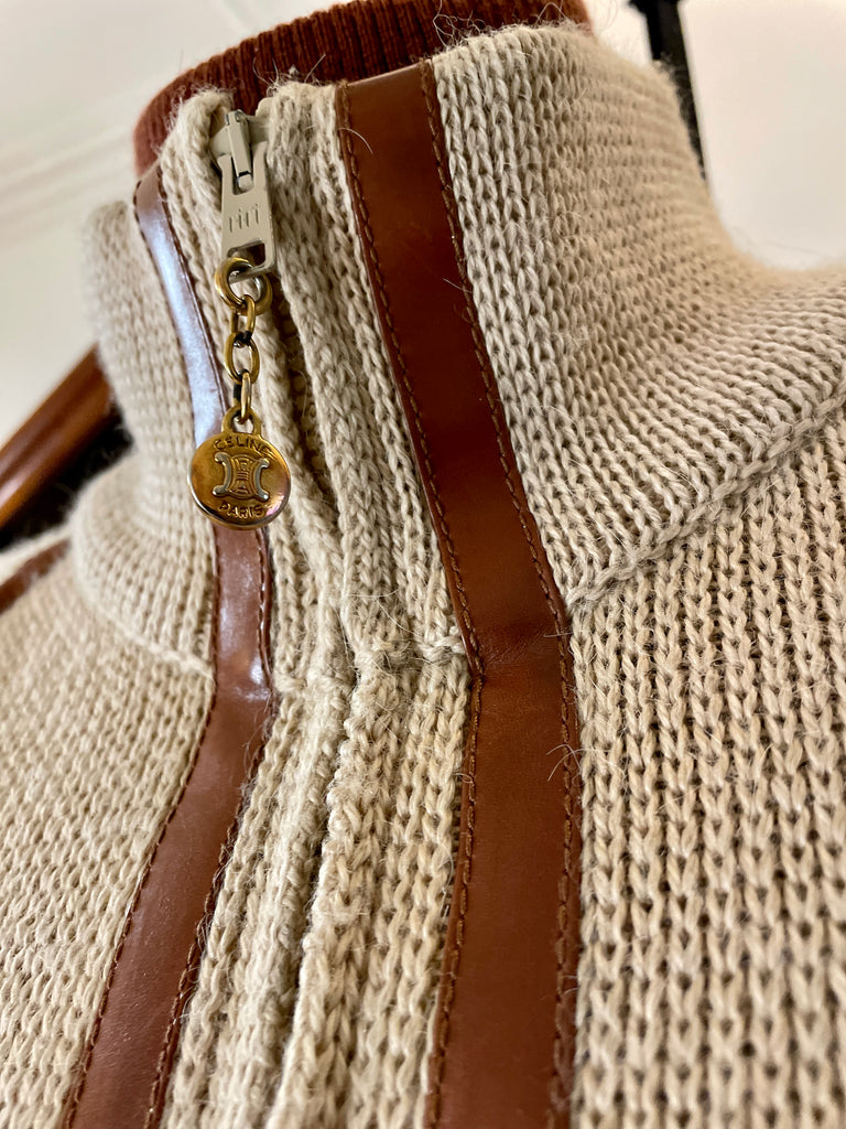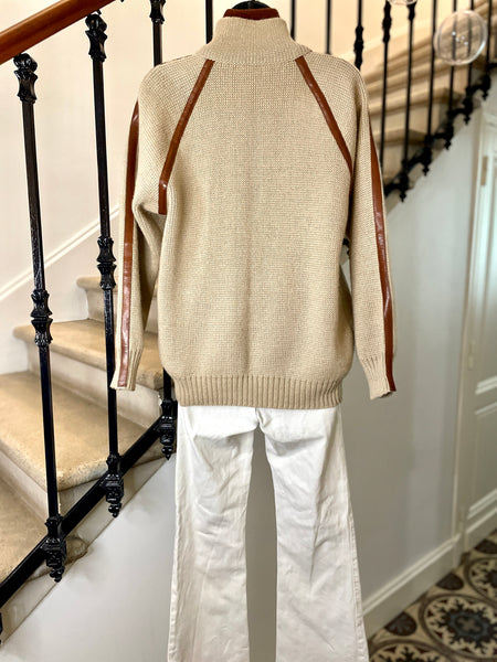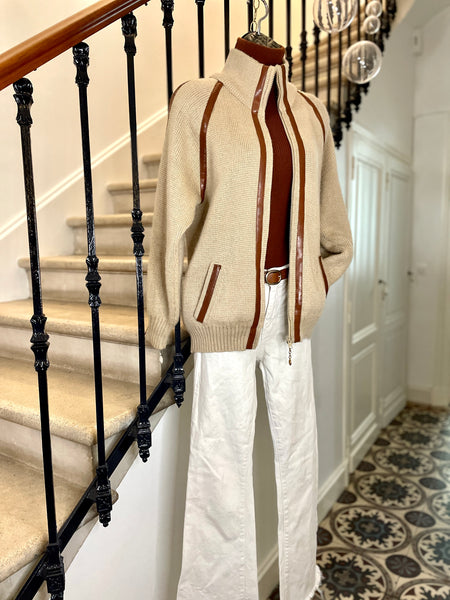 Gilet en laine de couleur beige avec bordures en cuir camel. Col montant, manches raglan et fermeture par zip avec tirette siglée et monogrammée Triomphe. 2 poches passepoilées. Ceinture et poignets légèrement resserrés.