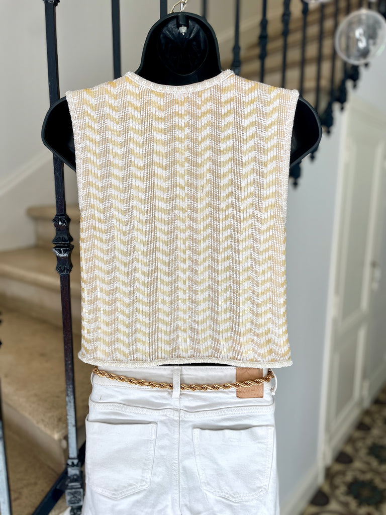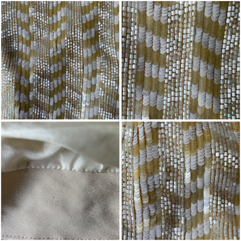 Gilet en perles et sequins de couleur blanc et crème irisé. Décolleté en V légèrement prononcé avec fermeture par boutons recouverts. Découpe en pointe arrondie sur l’avant. Doublé.