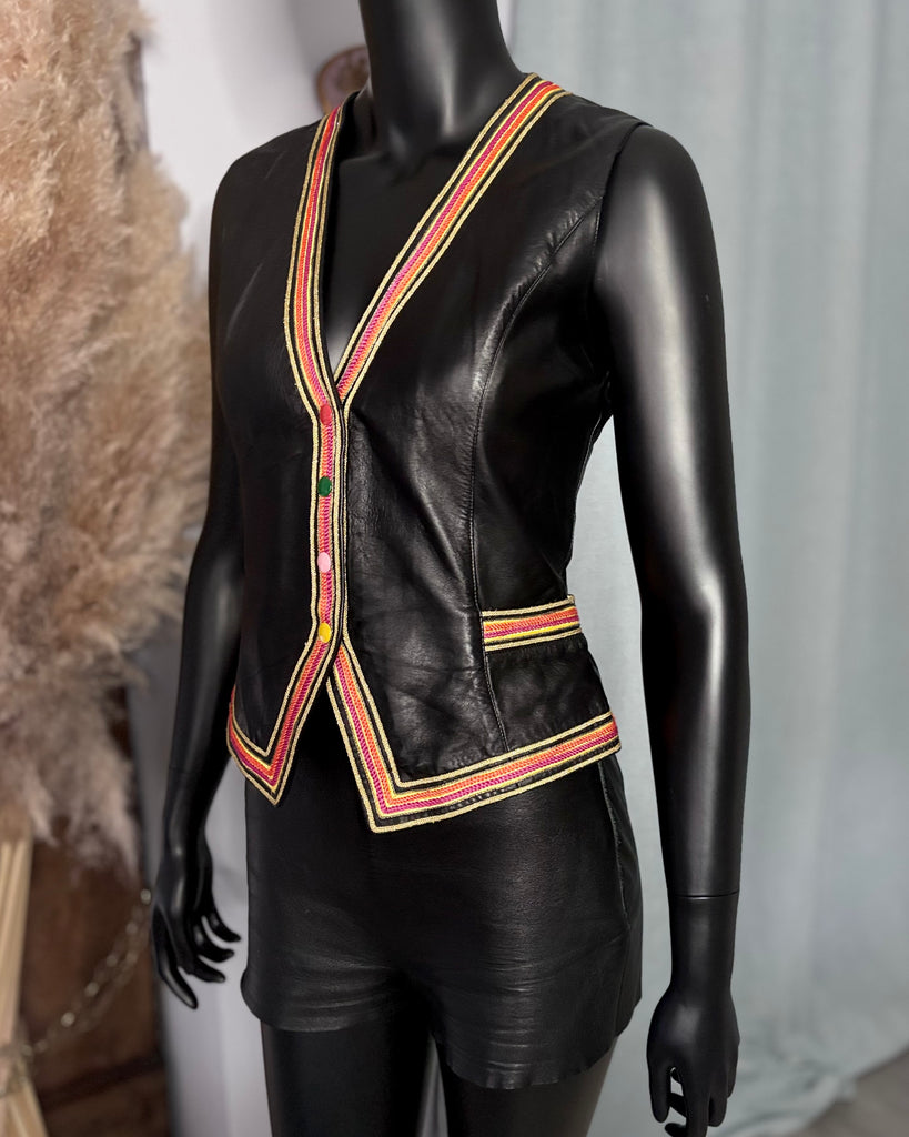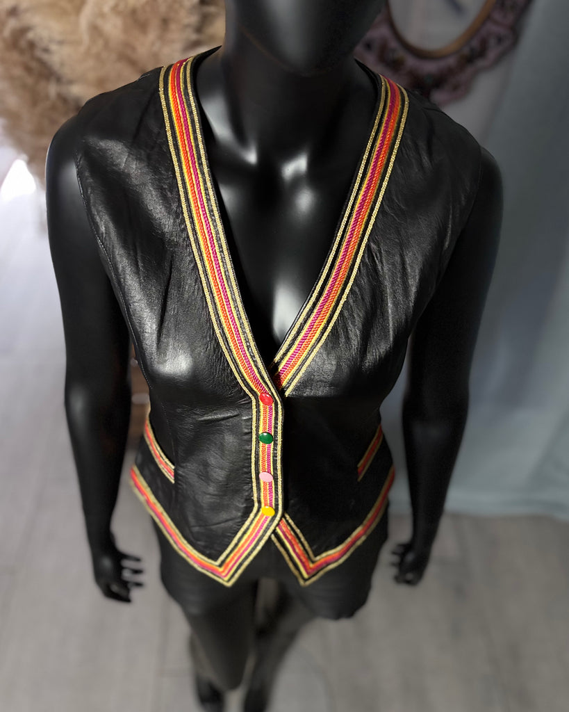 Gilet sans manches en cuir fin et souple de couleur noire, bordé d’un galon doré, orange et fuchsia. Coupe ajustée avec découpe en pointe sur l’avant. Fermeture par boutons pression rouge, vert, rose et jaune, 2 petites poches. Une martingale dans le dos fermée par un bouton pression vert. Doublé.
