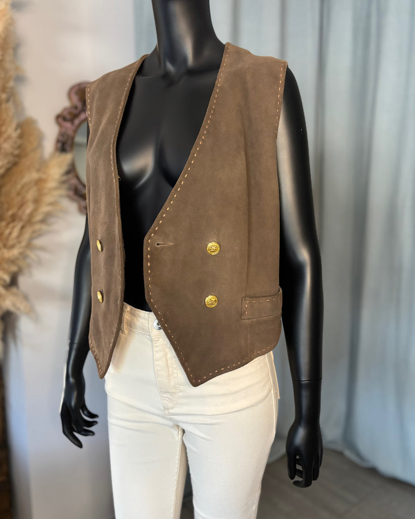 Gilet en peau effet velours de couleur taupe avec surpiqûres beiges dorées. Coupé ajustée, découpe en pointeset fermeture croisée avec boutons dorés monogrammées. Cordon de serrage décoratif avec bijouterie siglée et petite fente au bas du dos. 2 petites poches passepoilées. Doublé.