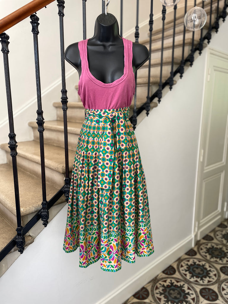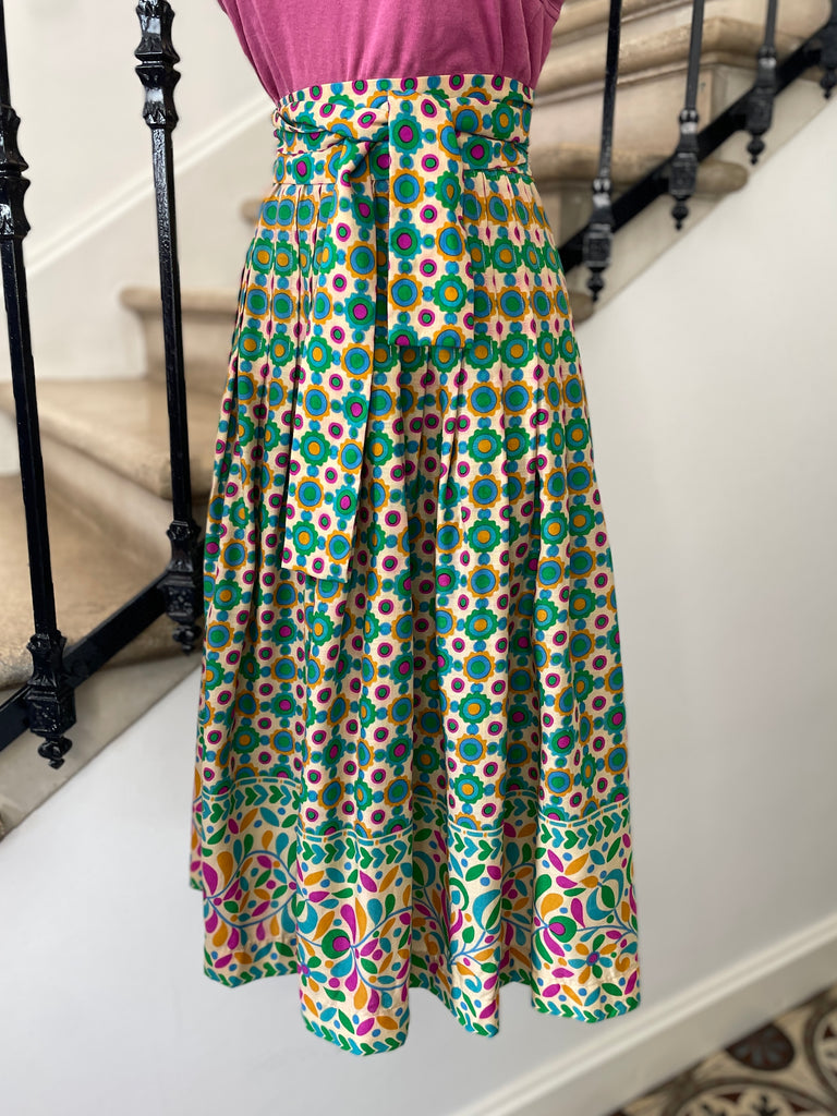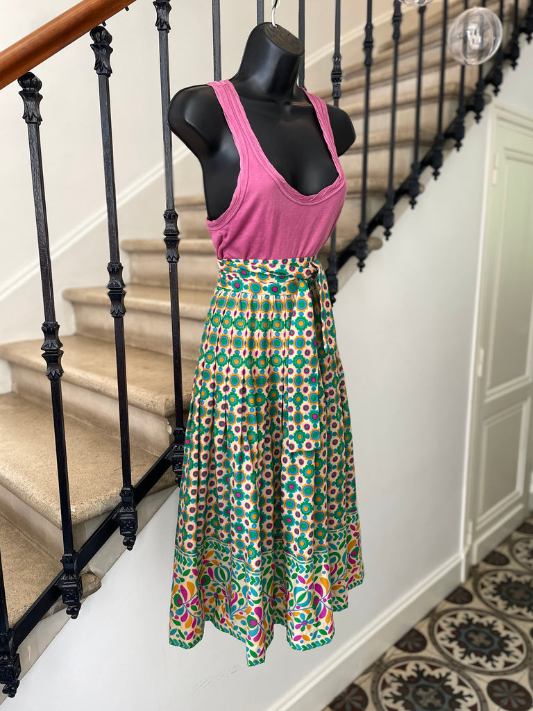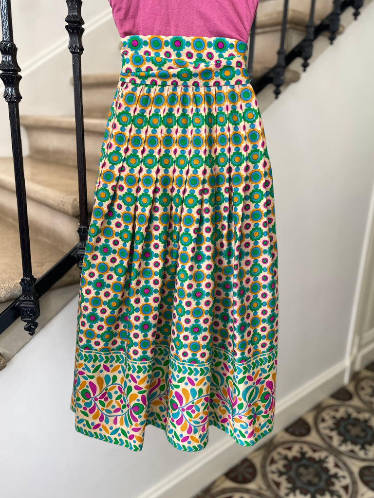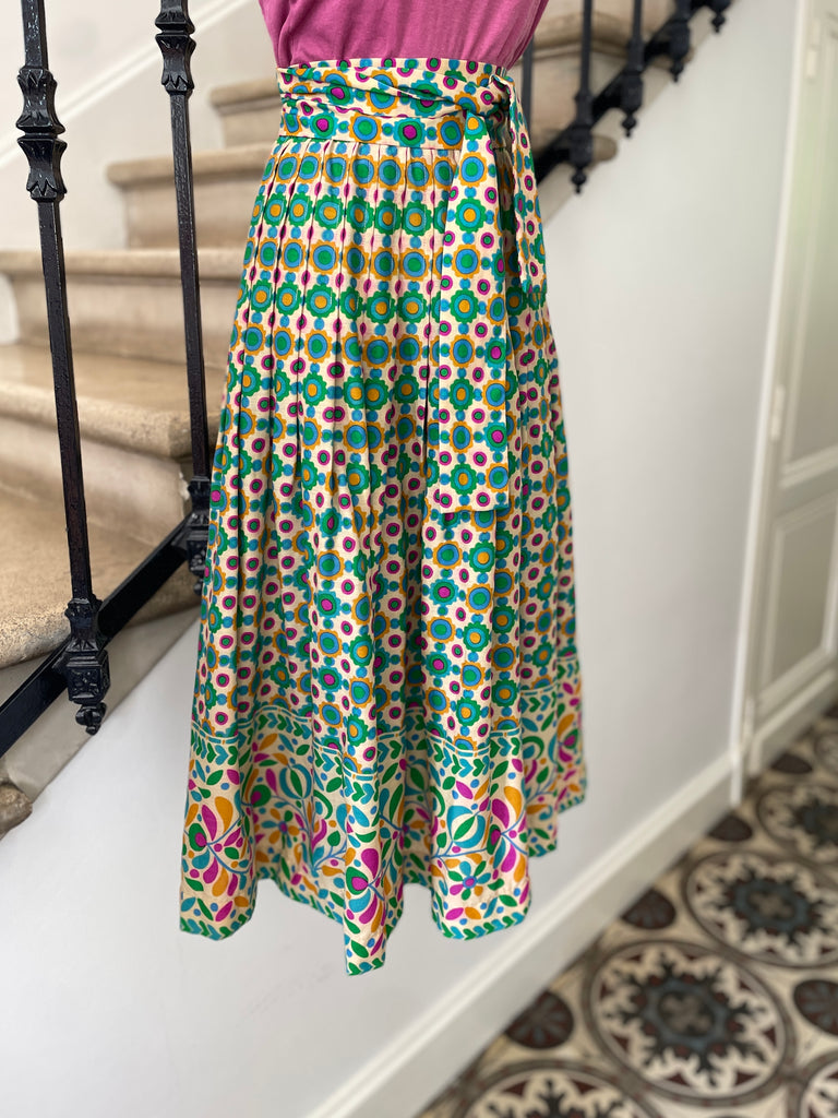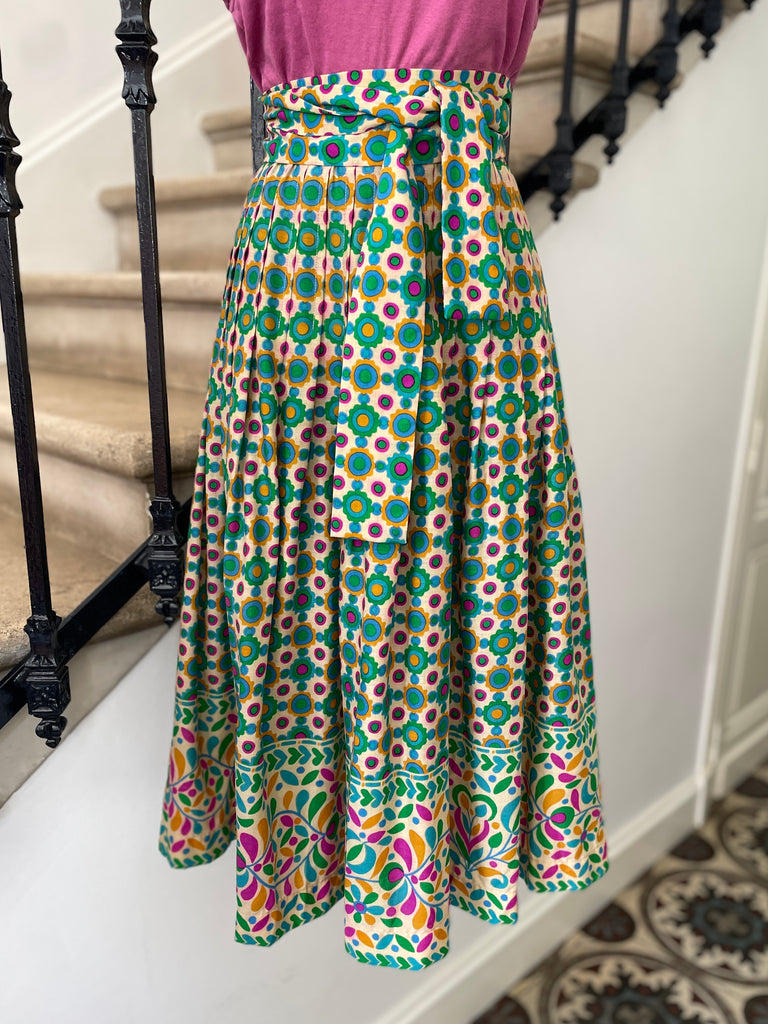 Jupe en étamine de laine à l’imprimé graphique multicolore sur fond beige soutenu. Taille haute avec plis surpiqués jusqu’au bas des hanches puis libres. Fermeture latérale par bouton et zip masqué avec longue ceinture amovible. Non doublé.