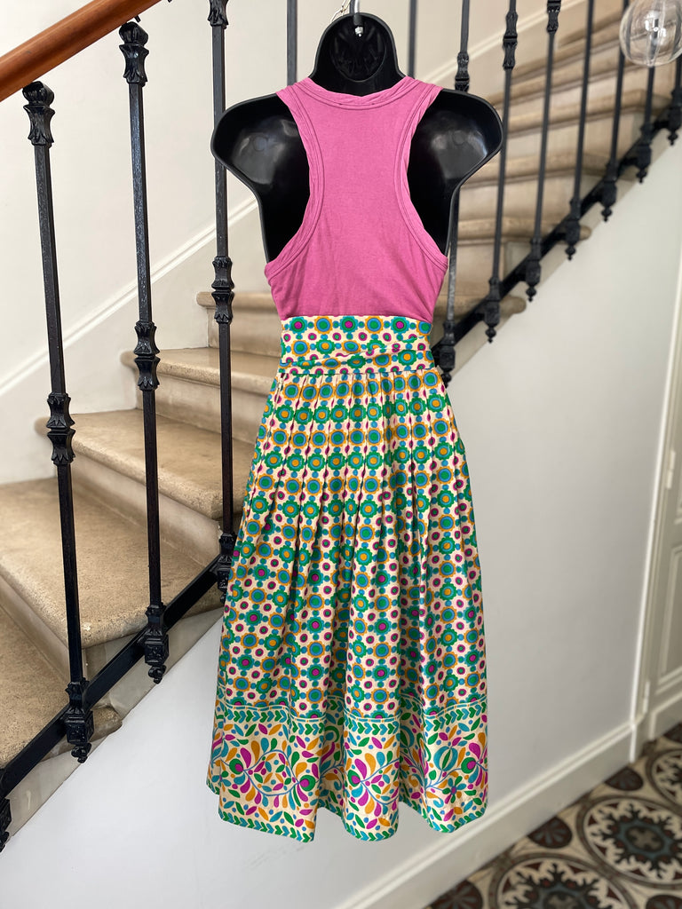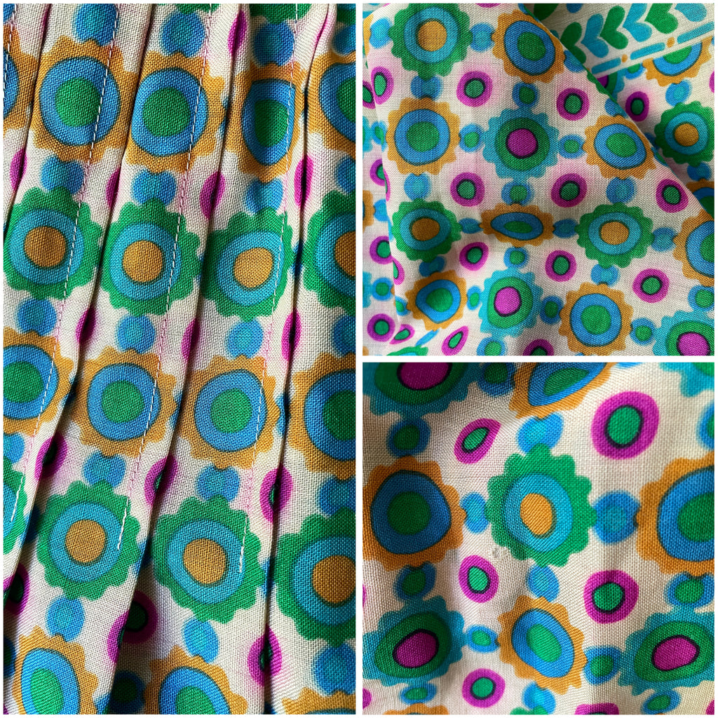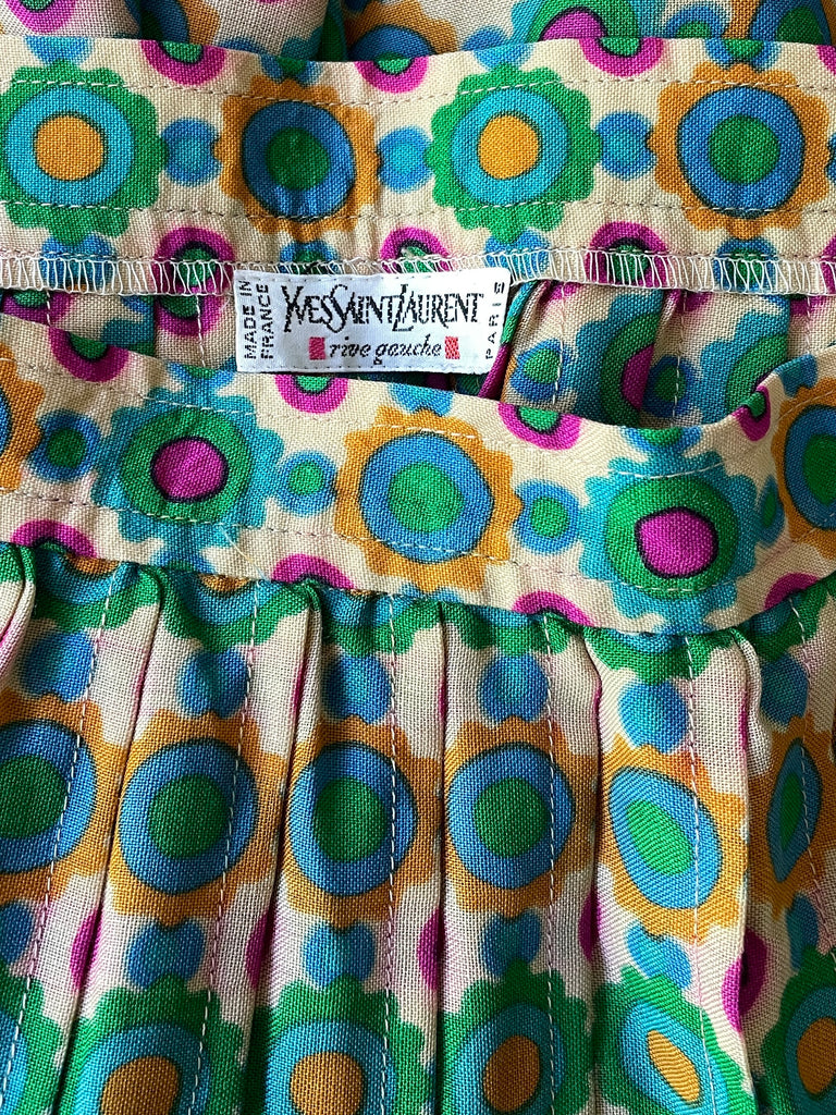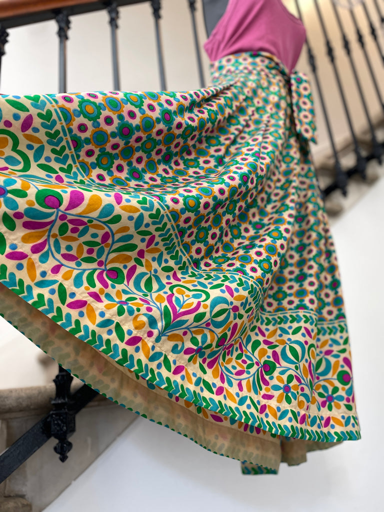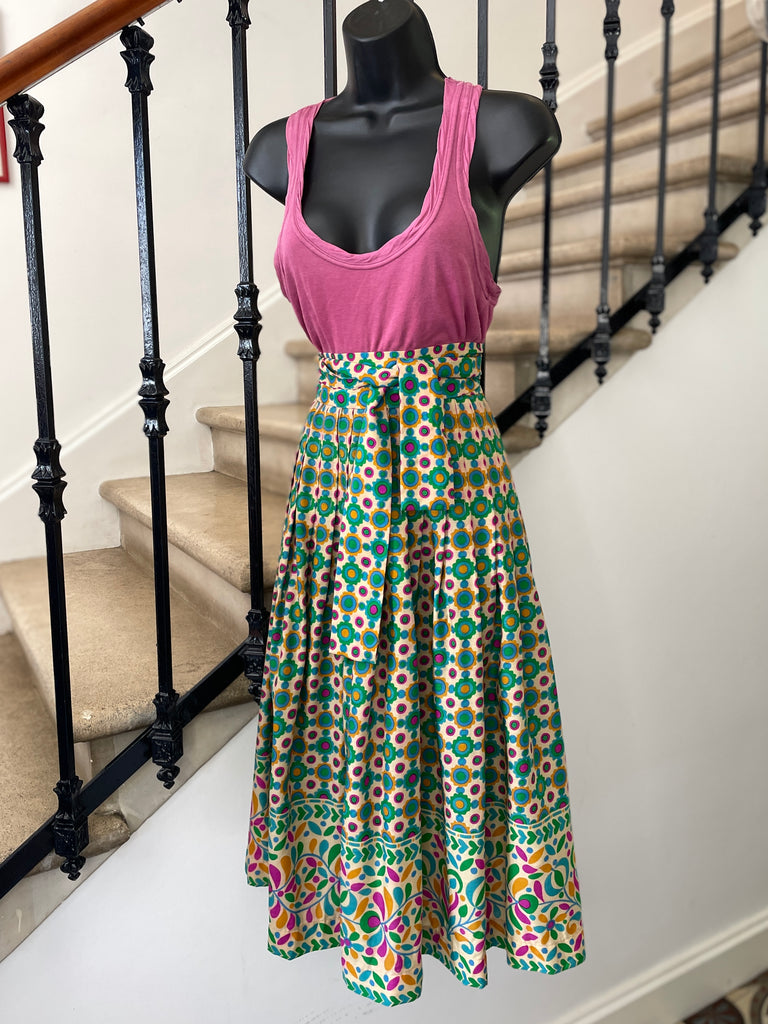 Jupe en étamine de laine à l’imprimé graphique multicolore sur fond beige soutenu. Taille haute avec plis surpiqués jusqu’au bas des hanches puis libres. Fermeture latérale par bouton et zip masqué avec longue ceinture amovible. Non doublé.
