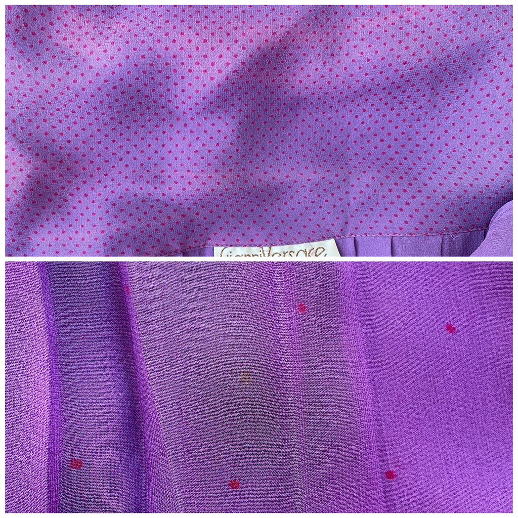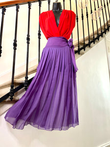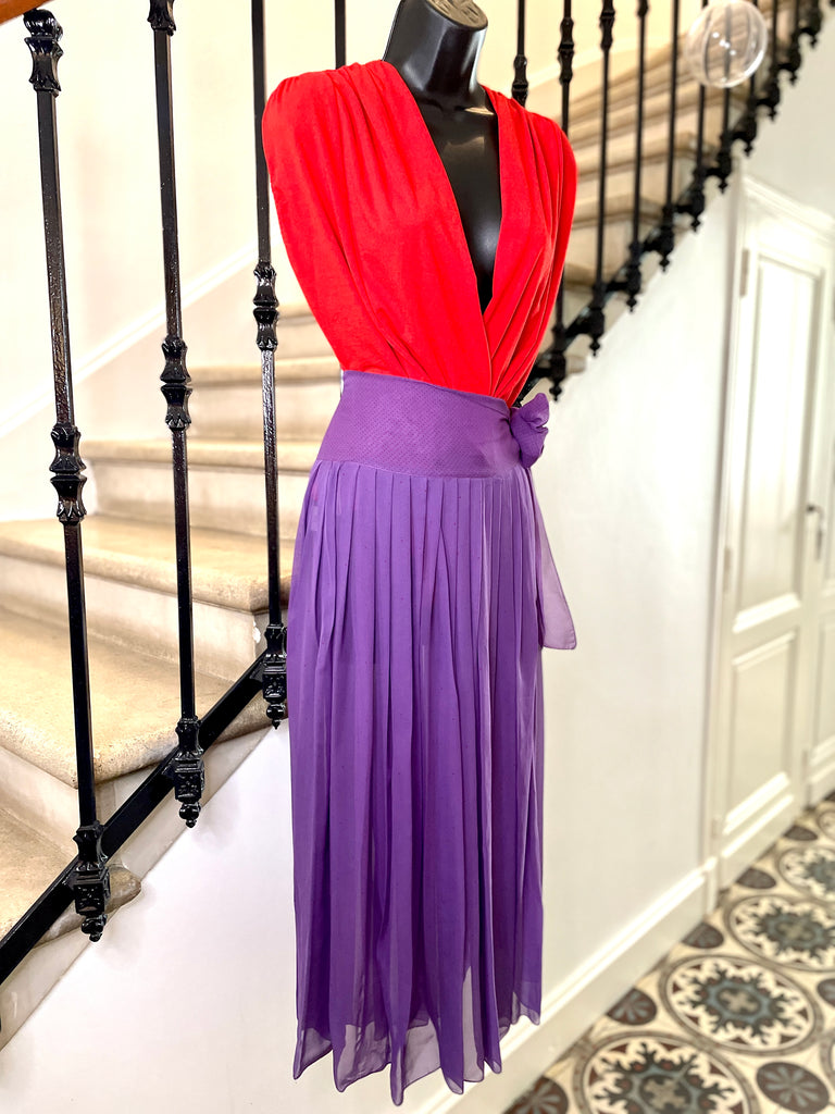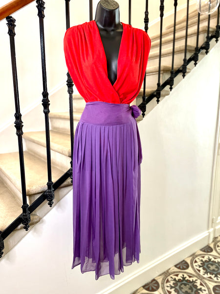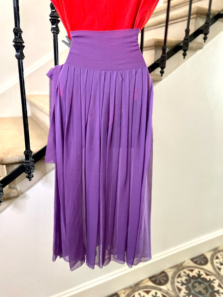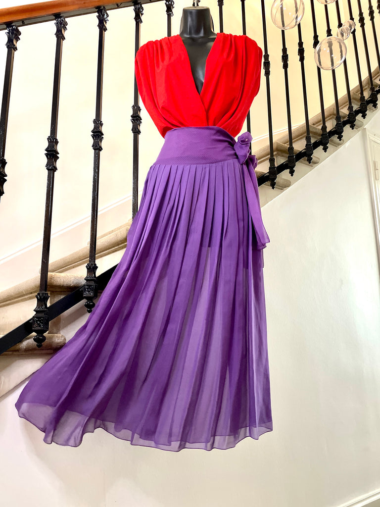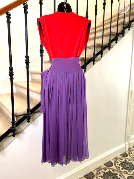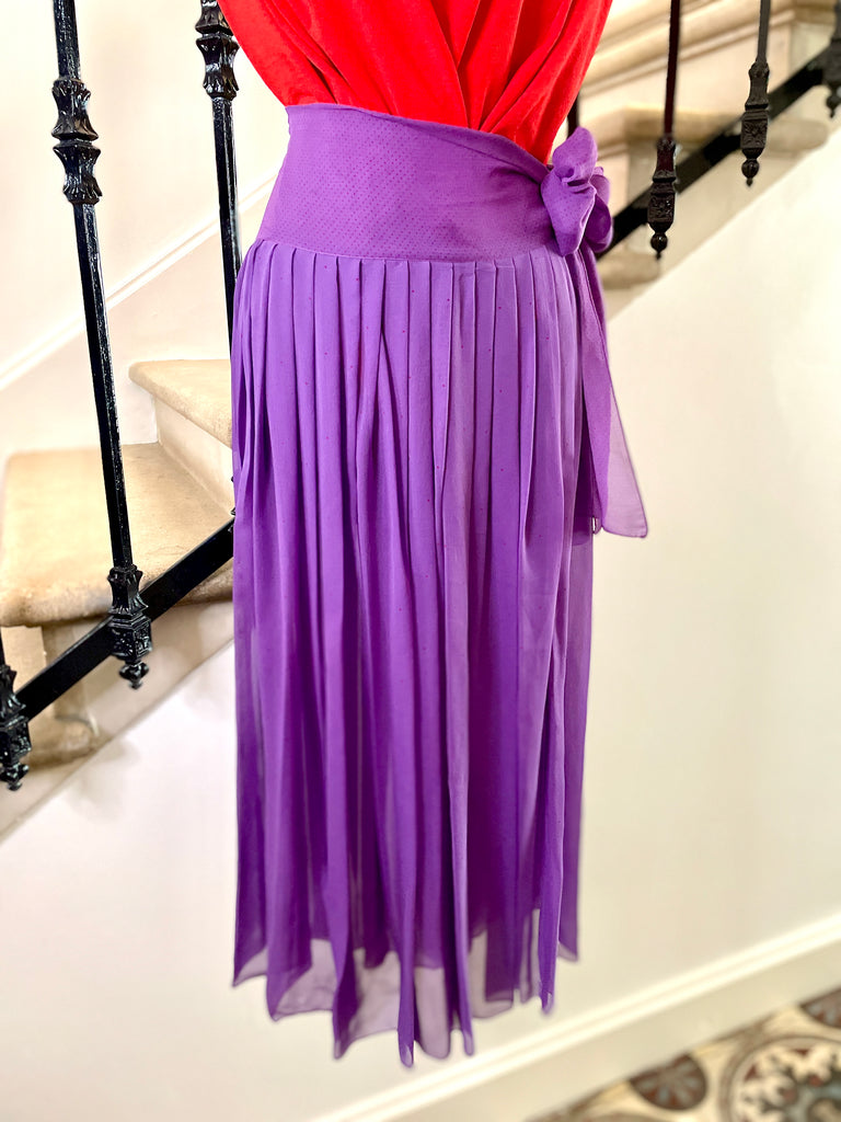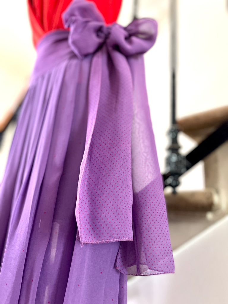 Jupe plissée en soie de couleur violet au motif pois rouge. Large ceinture doublée au motifs petits pois rouge (plus resserrés que sur le reste de la jupe) à nouer sur le côté. Fermeture sur le côté par 1 petit bouton pression et un petit crochet Jupe non doublée donc transparente.