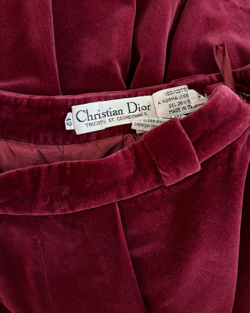Jupe culotte en velours bordeaux/ lie de vin. Taille haute avec 2 pinces à l’avant et petits plis à l’arrière et entrejambes avec pli creux à l’avant et à l’arrière. Fermeture latérale par zip masqué et un bouton. 2 poches dans le biais et passants à la ceinture. Doublée.