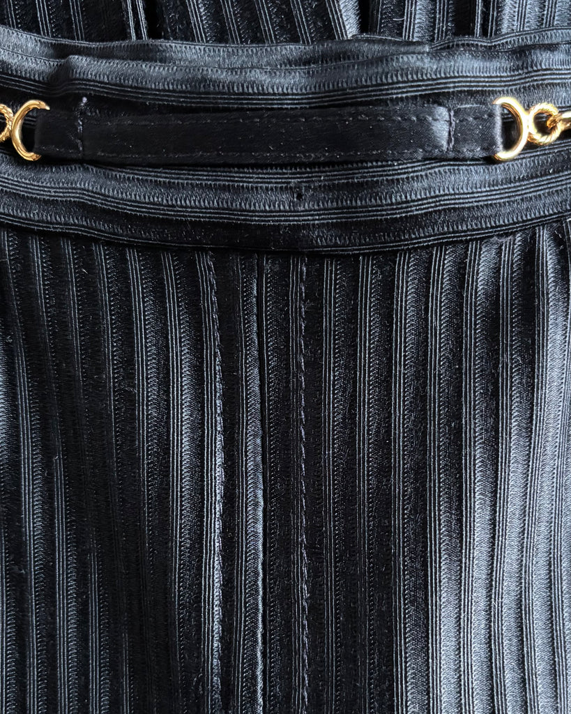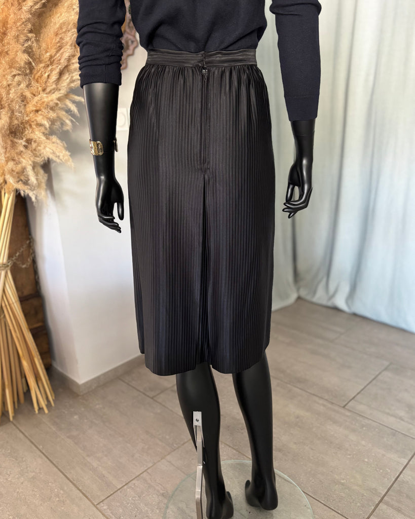 Jupe culotte en soie épaisse au tissage côtelé de couleur noir. Taille haute avec ceinture décorée de bijouterie dorée et fermeture à l’arrière par zip masqué et un crochet intérieur. Jeu de plis à la taille et entrejambe façon pli creux à l’avant et l’arrière. 2 poches dans le biais. Non doublée.