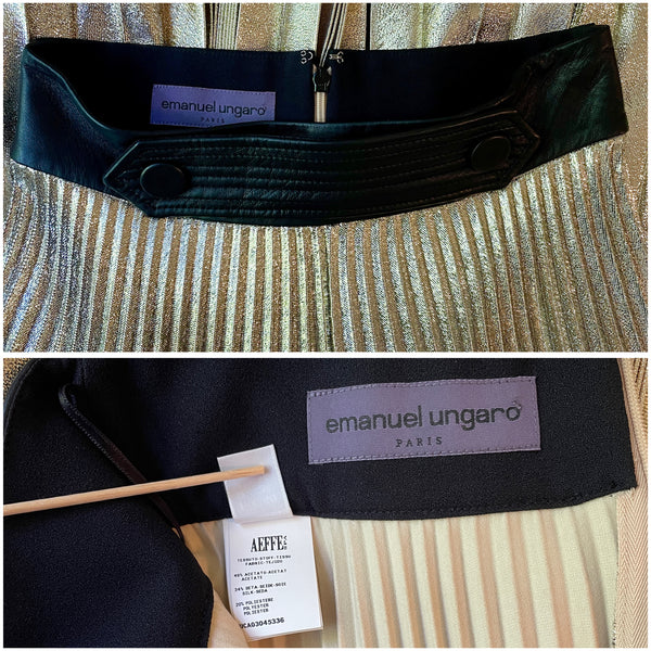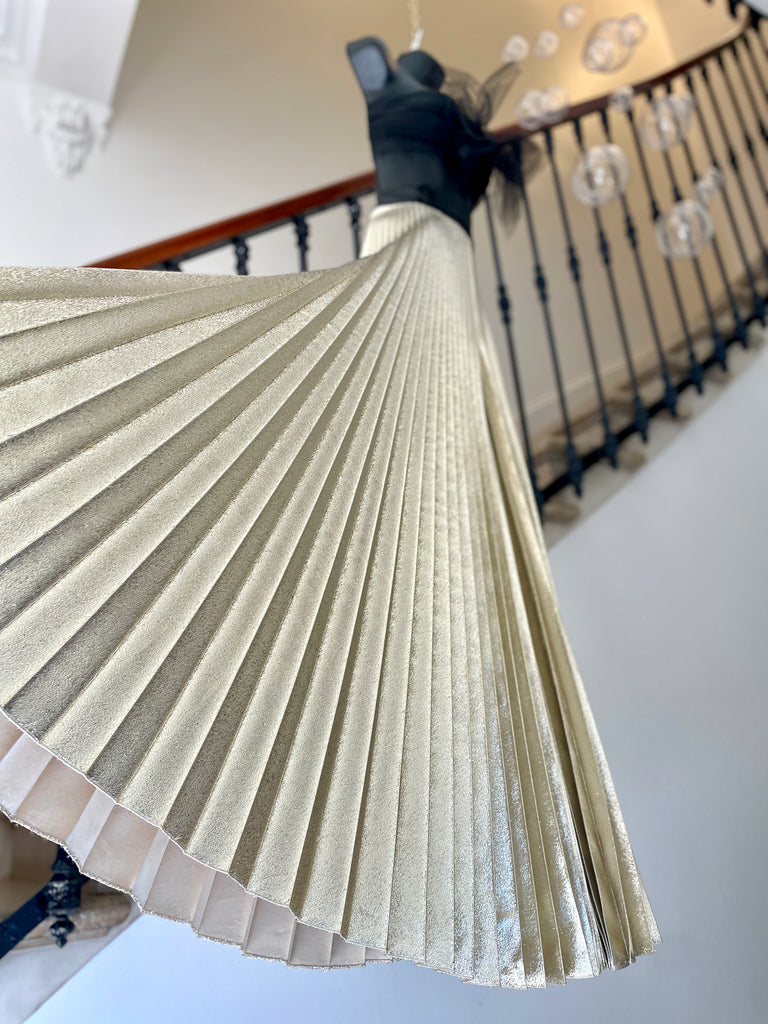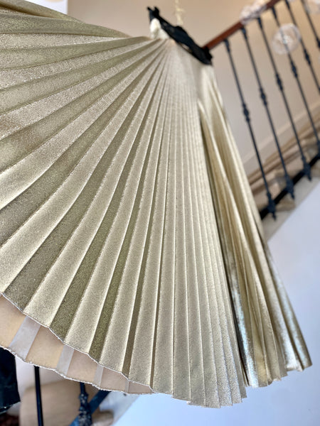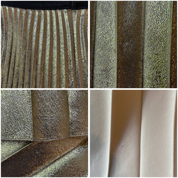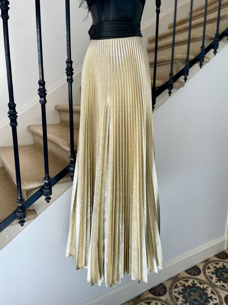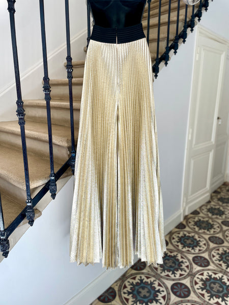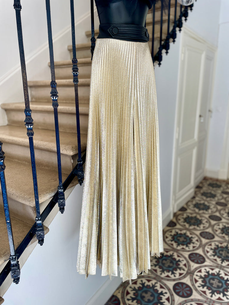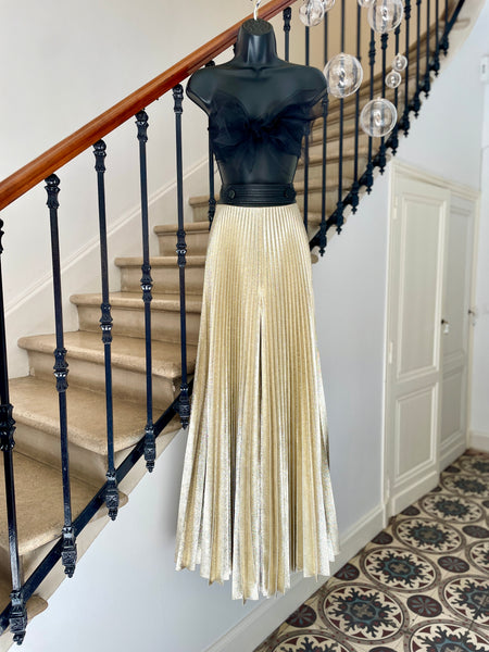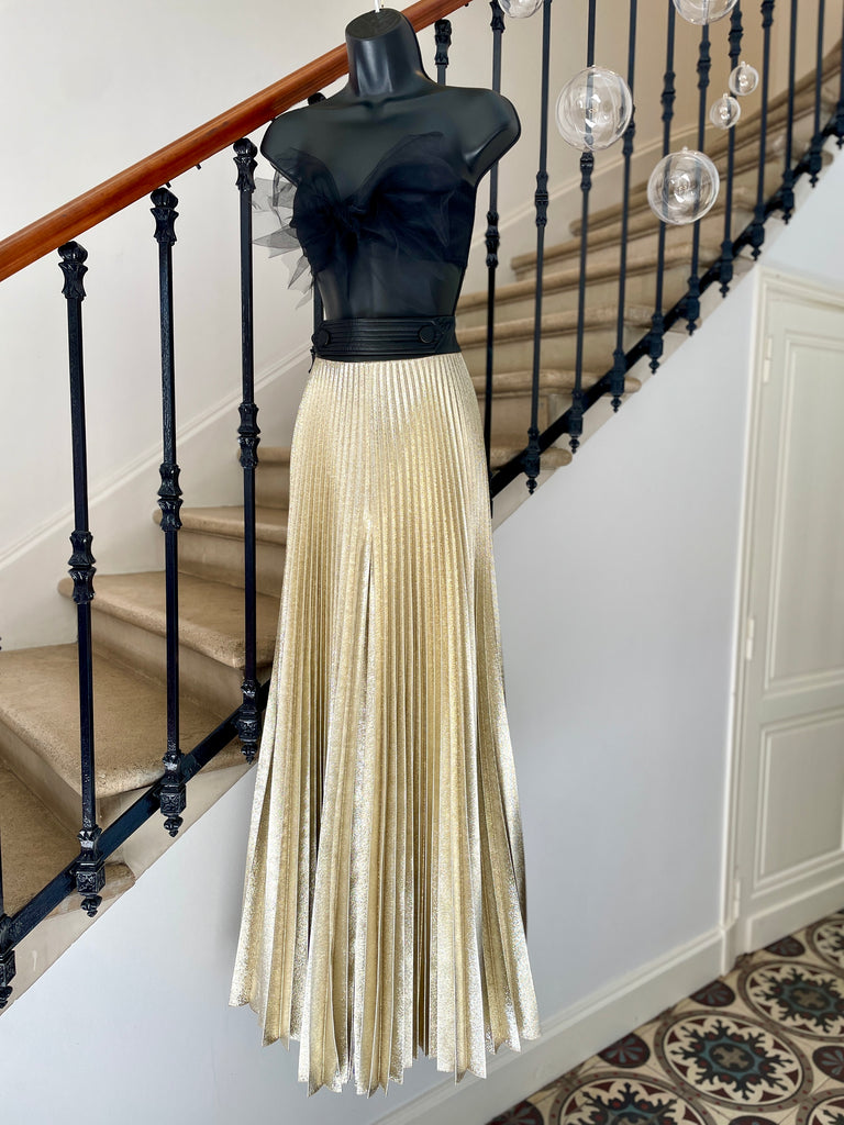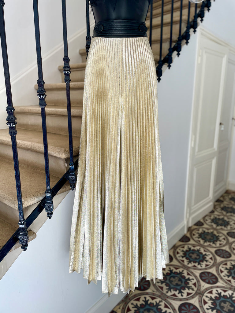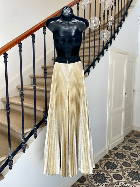 Jupe culotte au plissé soleil de couleur dorée. Taille haute avec ceinture en cuir sur l’avant (la partie matelassée est amovible par boutons pression). Fermeture au dos par zip masqué et petit crochet intérieur. Très grande amplitude sur la largeur des jambes et très grande longueur. Non doublé mais matière douce à l’intérieur.