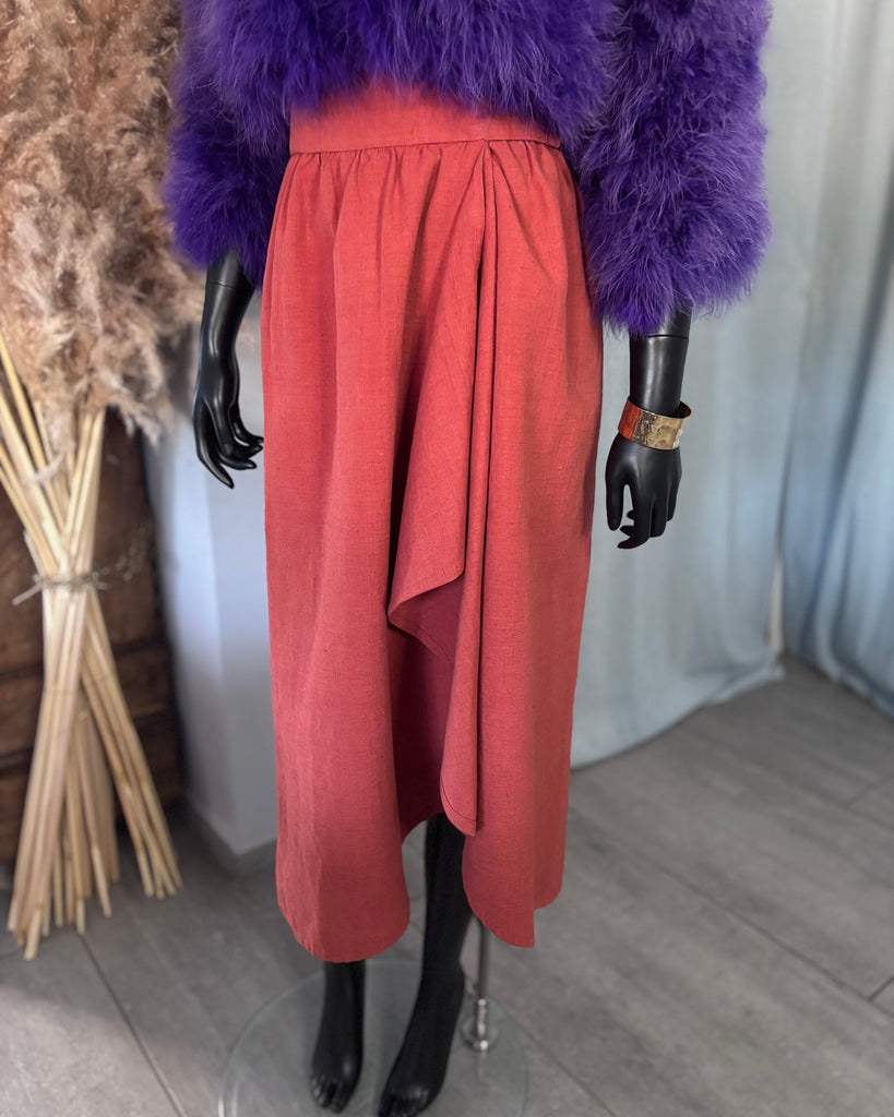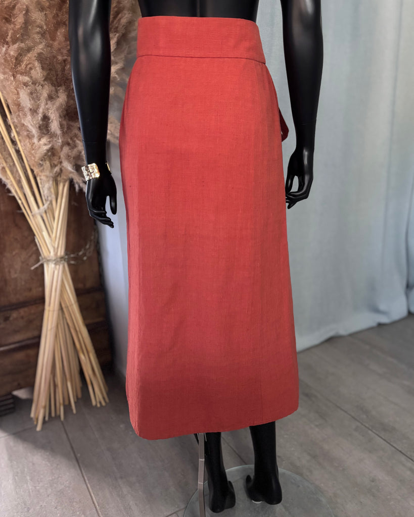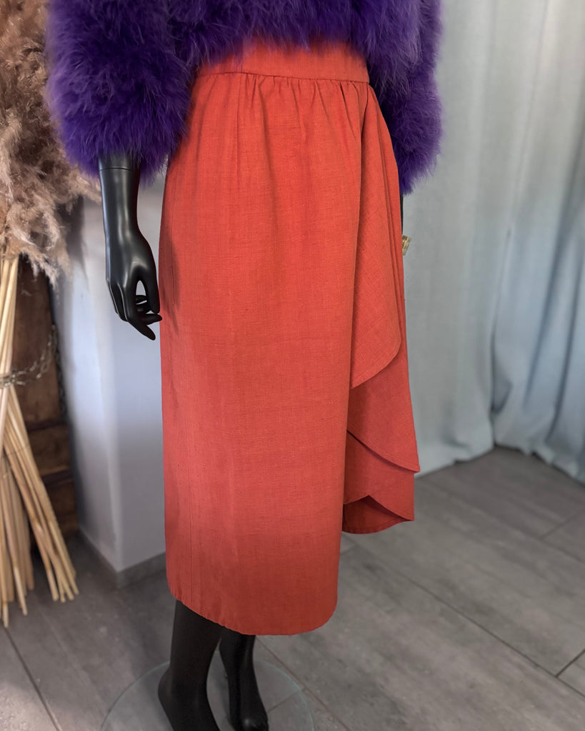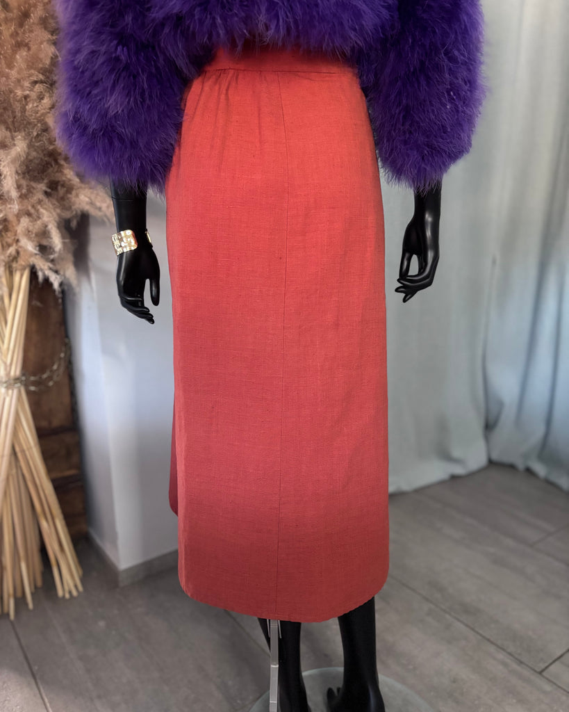 Jupe mi-longue en lin très épais (mélangé ?) de couleur orange-terracota (couleur poudrée). Coupe portefeuille avec magnifique drapé, taille très haute avec large ceinture, fermée par double crochets et double boutons. Non doublée