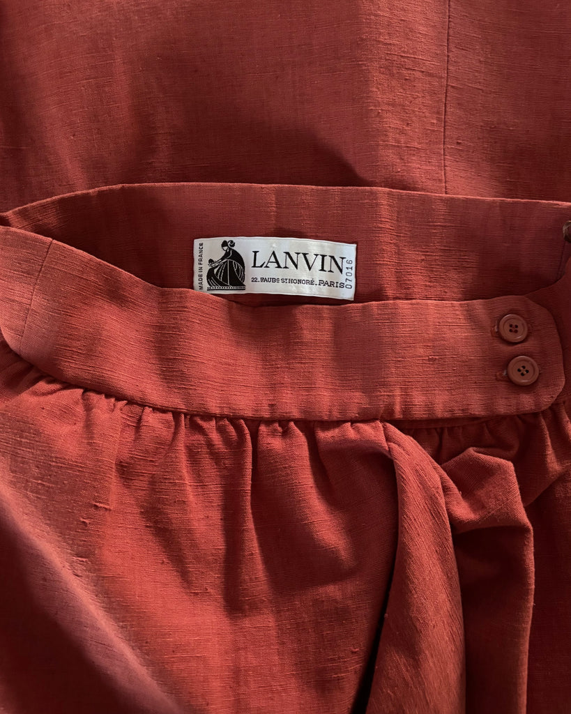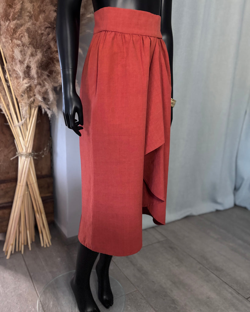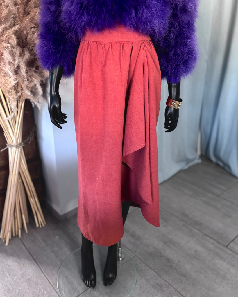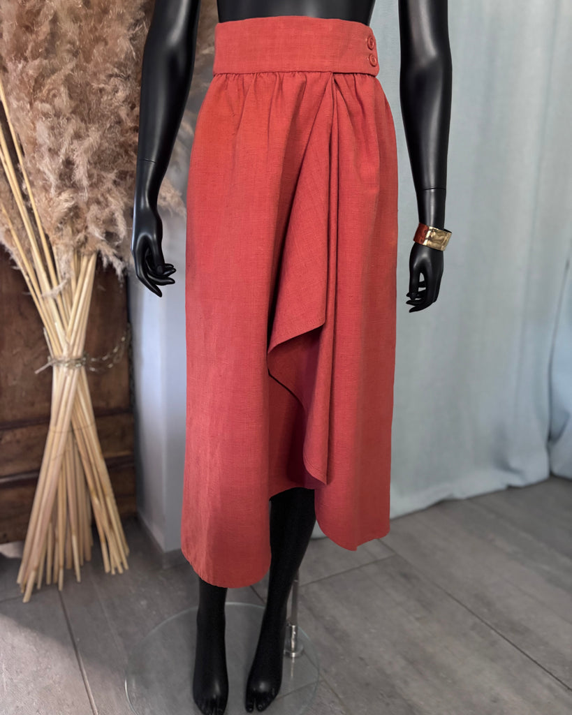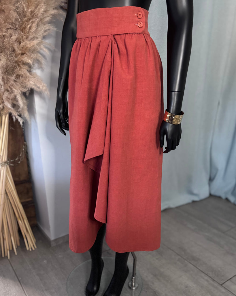 Jupe mi-longue en lin très épais (mélangé ?) de couleur orange-terracota (couleur poudrée). Coupe portefeuille avec magnifique drapé, taille très haute avec large ceinture, fermée par double crochets et double boutons. Non doublée
