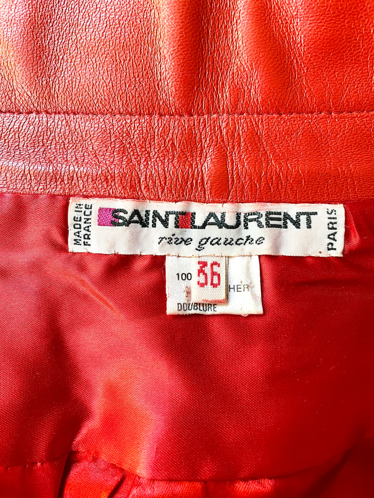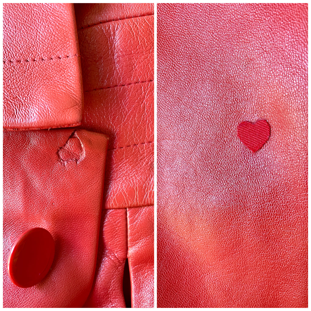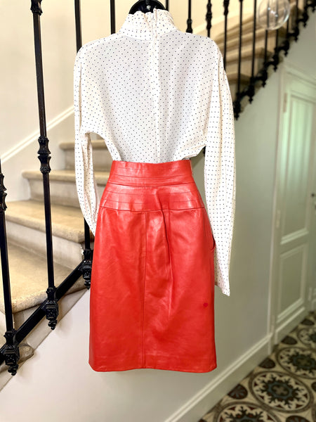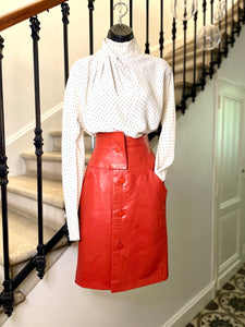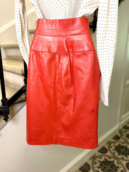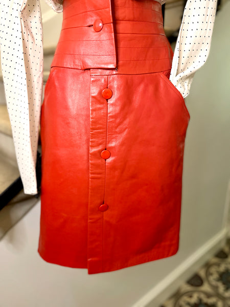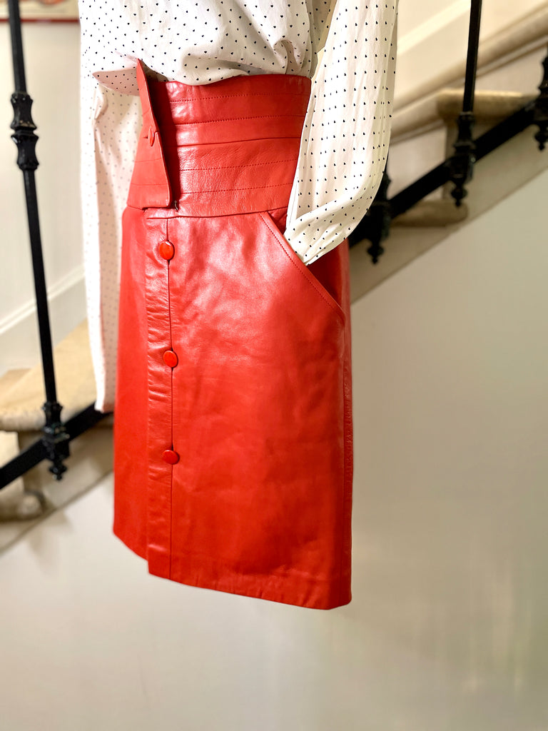 Jupe en cuir agneau de couleur rouge. Coupe droite, taille haute avec large ceinture à l'effet graphique. Fermeture de la ceinture par 1 bouton rouge et 1 crochet. Fermeture de la jupe par boutons rouges. 2 poches plaquées en biais. Doublure en satin rouge.