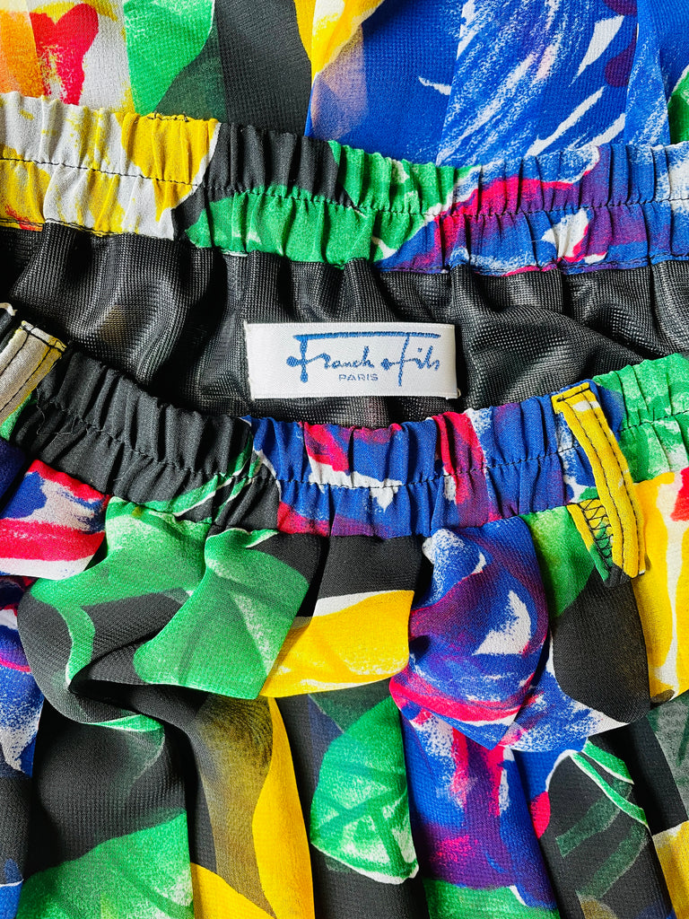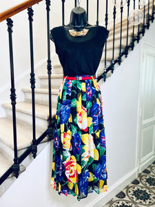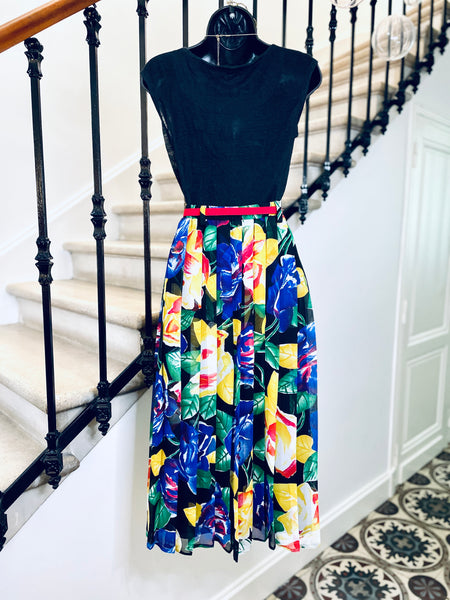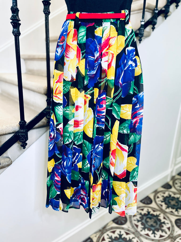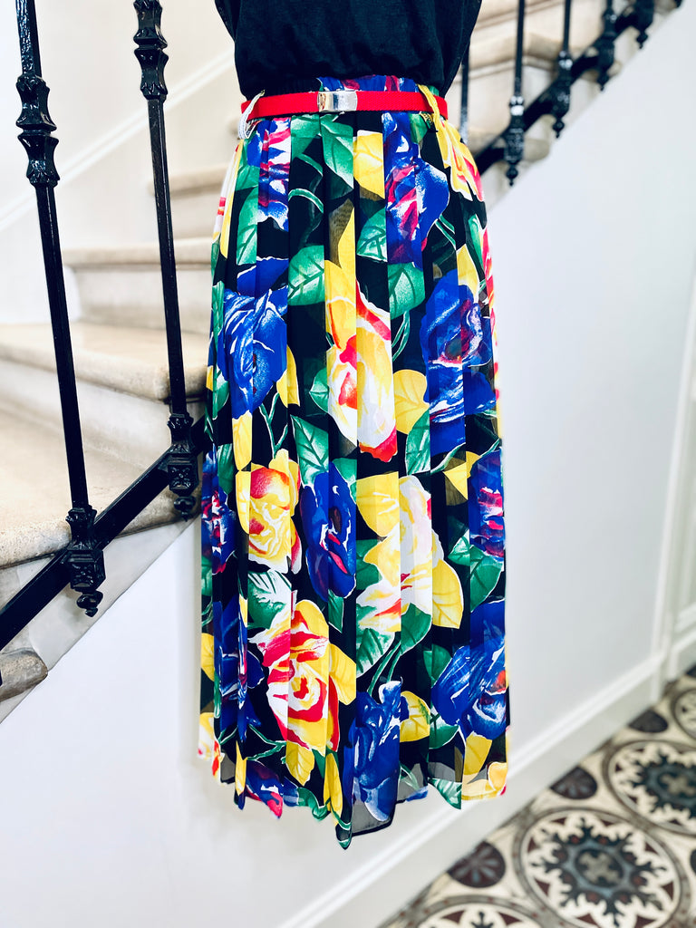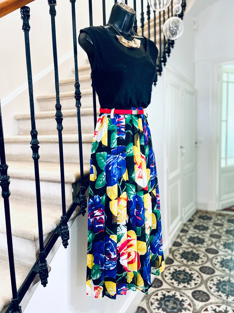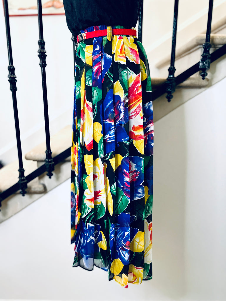 Jupe longue plissée en polyester à l’imprimé floral dans des couleurs bleu, jaune, rouge, vert, blanc et noir. Taille elastiquée avec 4 passants. Doublée.