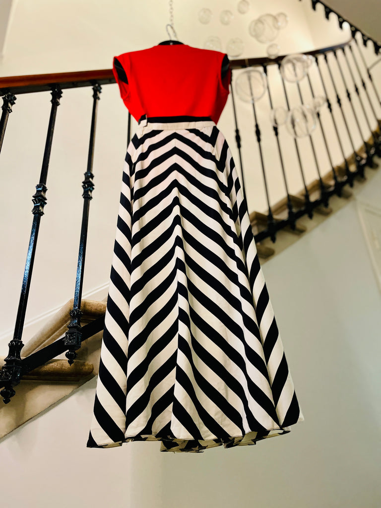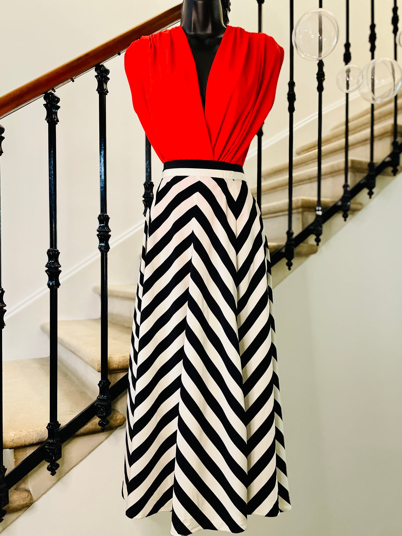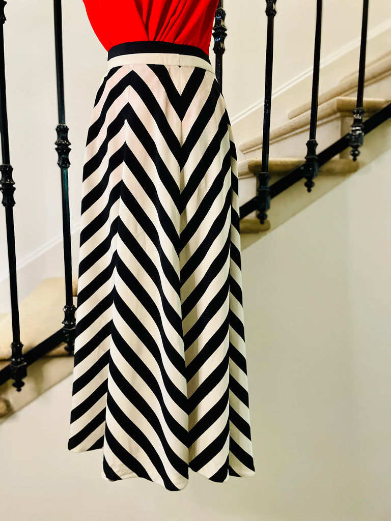 Jupe longue et fluide en polyester au motif chevron de couleur blanc cassé et noir. Fermeture latérale à la taille par zip masqué et bouton.