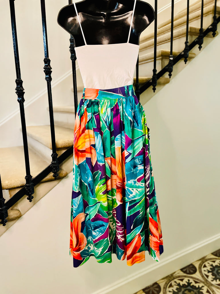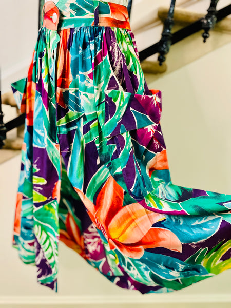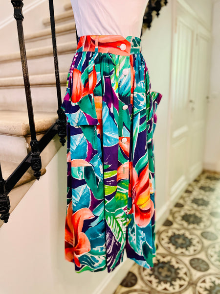 Jupe longue en coton à l'imprimé fleurs tropicales. Fermeture à l'avant par simple boutonnage avec boutons blancs. 2 grandes poches latérales avec revers.