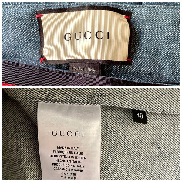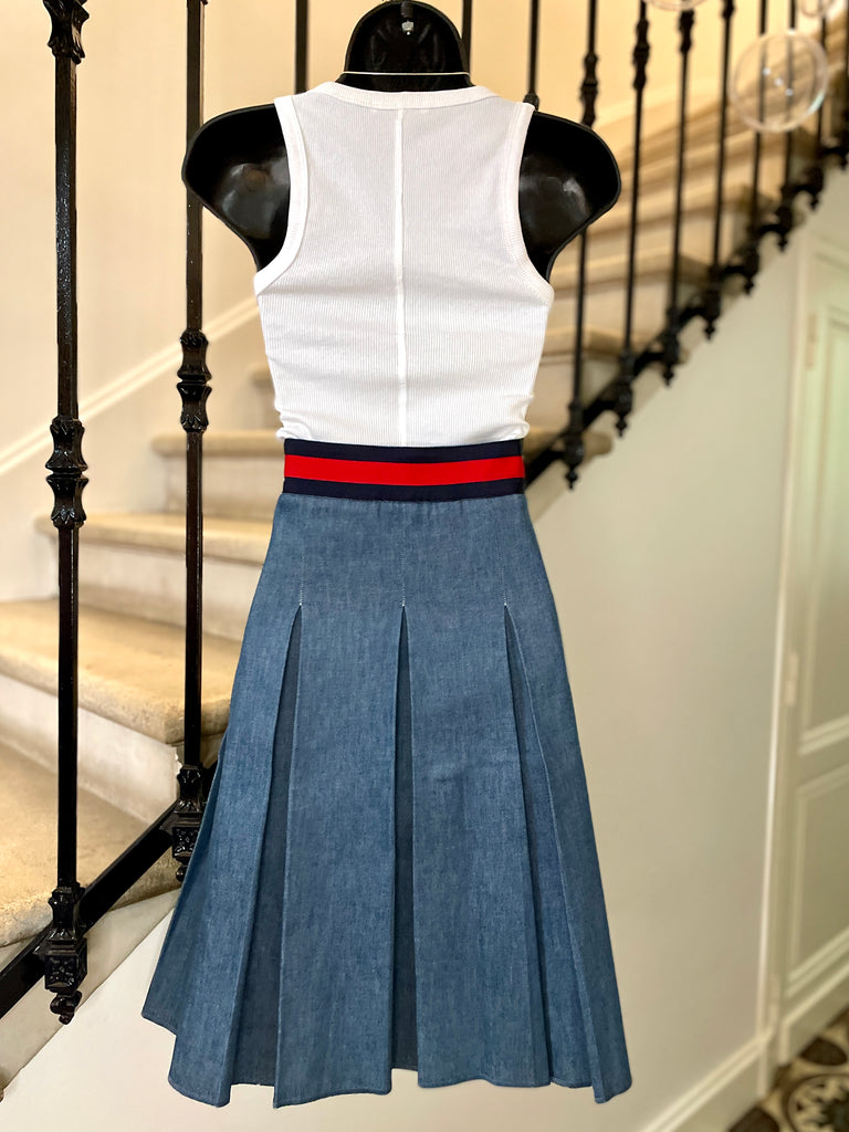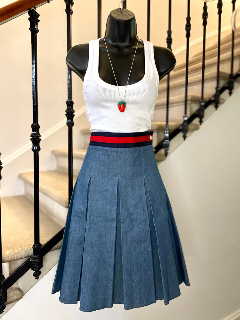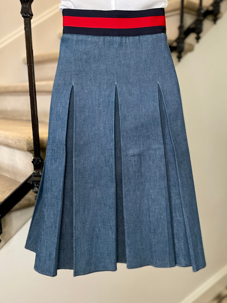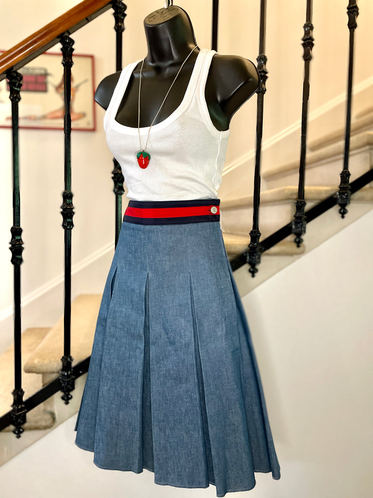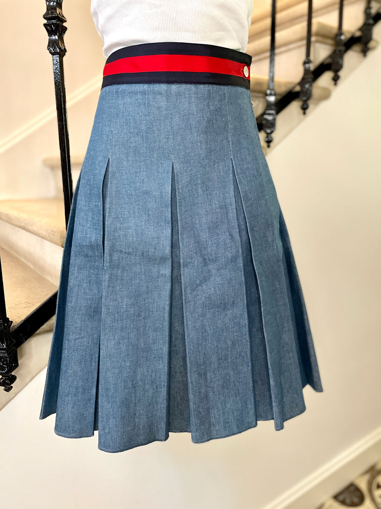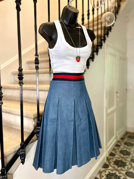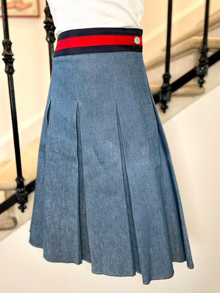 Jupe plissée en jeans de couleur bleue. Taille haute avec ceinture recouverte d’un ruban bleu marine et rouge et fermeture latérale par un bouton en métal siglé. Coupe ajustée sur les hanches puis trapèze par jeu de larges plis plats. Longueur midi. Finition du bas de la jupe par surfilage ton sur ton. Non doublée.