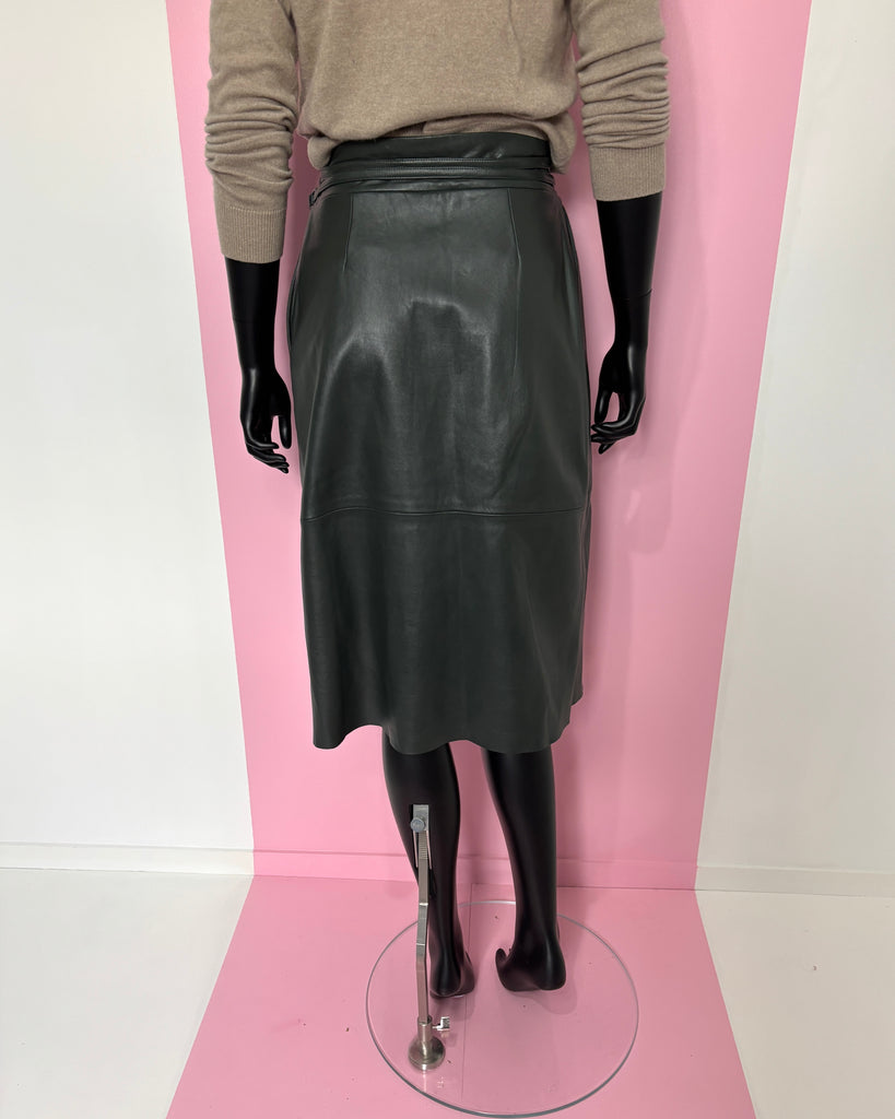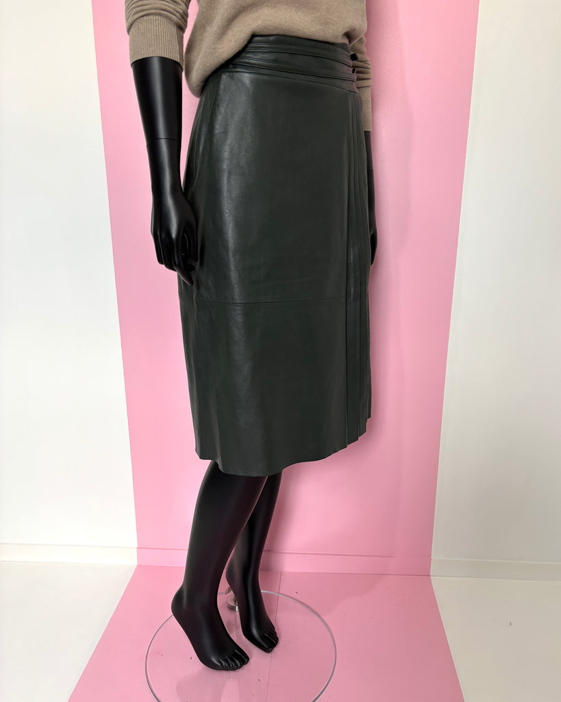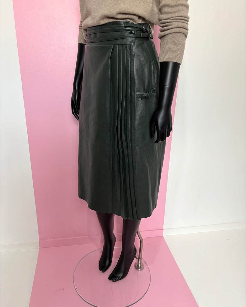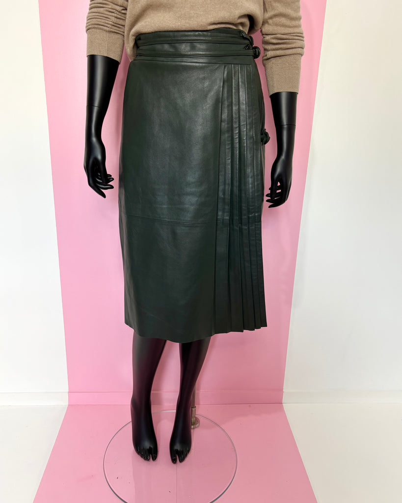 Jupe portefeuille en cuir souple de couleur vert foncé. Taille haute avec fermeture par boutons recouverts et 2 liens en cuir avec anneaux recouverts. Jeu de plis plats sur le pan du dessus retenu par une petite patte de serrage. 2 poches dans le biais. Doublée.