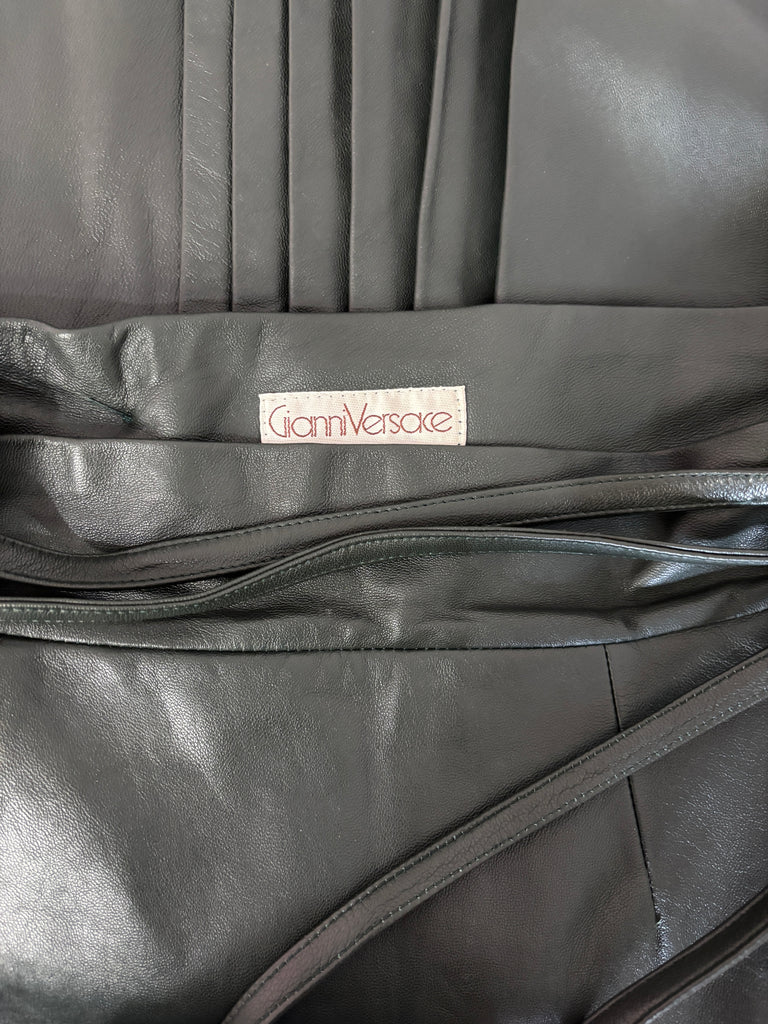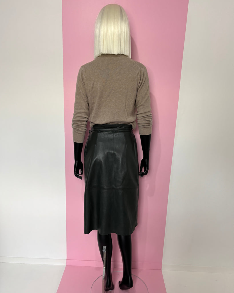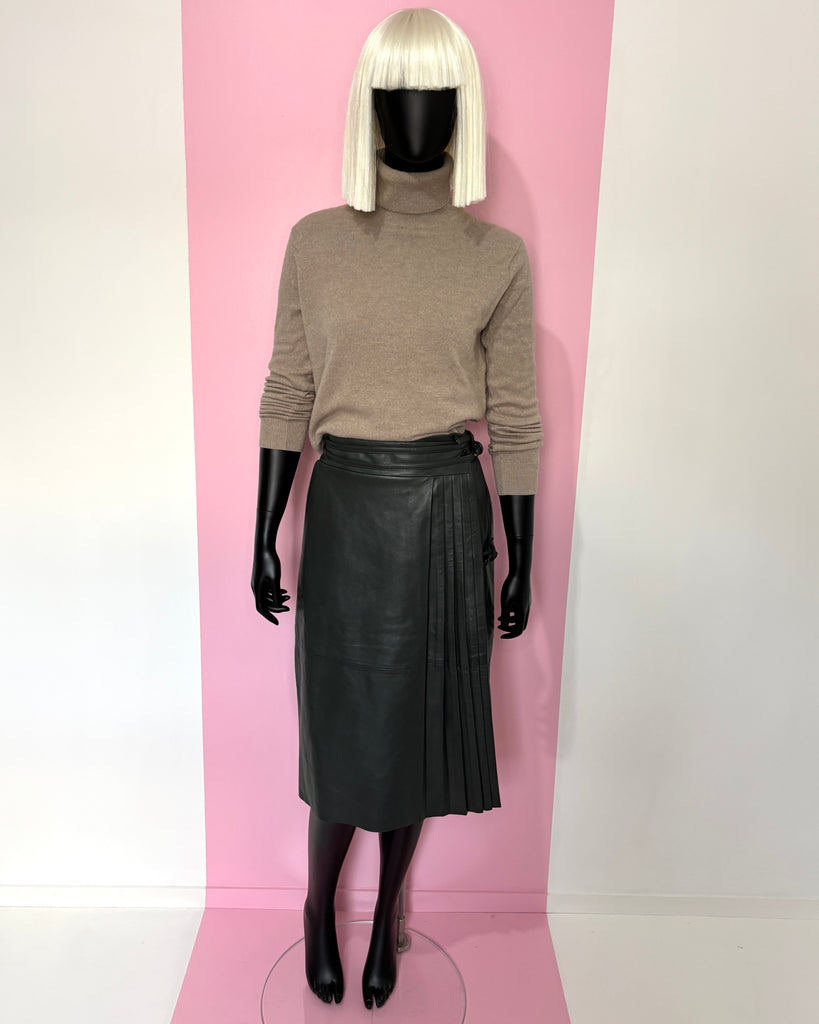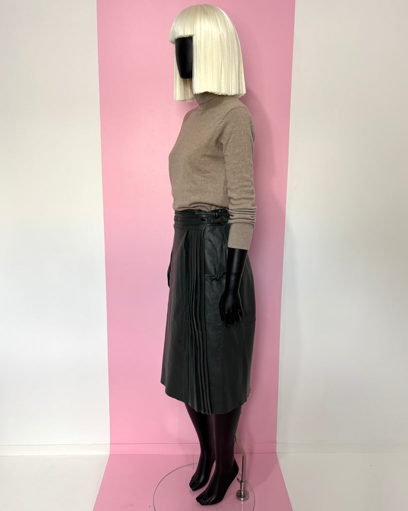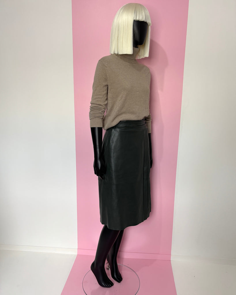 Jupe portefeuille en cuir souple de couleur vert foncé. Taille haute avec fermeture par boutons recouverts et 2 liens en cuir avec anneaux recouverts. Jeu de plis plats sur le pan du dessus retenu par une petite patte de serrage. 2 poches dans le biais. Doublée.