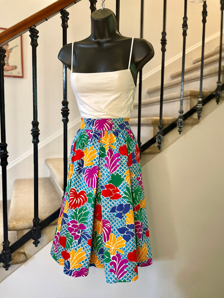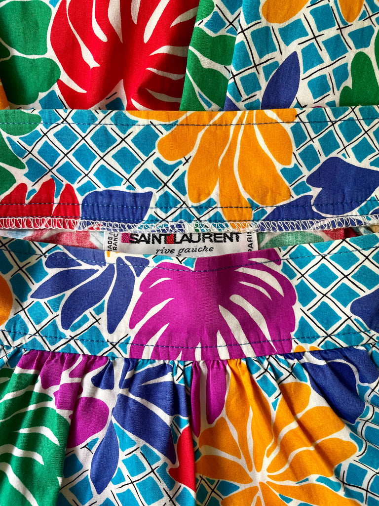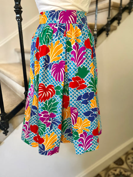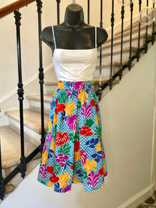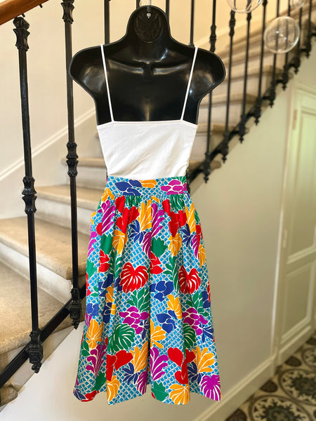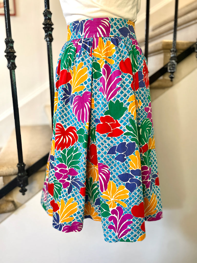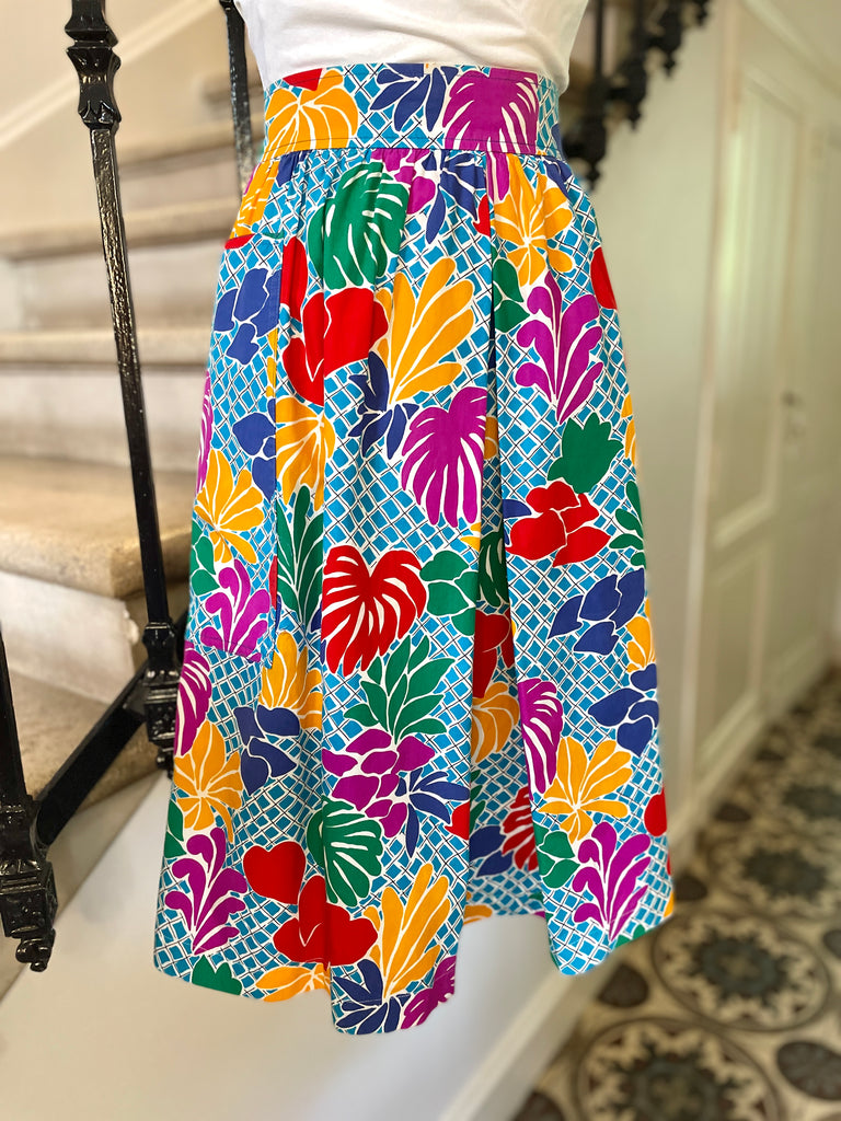 Jupe en coton épais à l’imprimé feuillage tropical dans des couleurs fuchsia, violet, rouge, vert et jaune sur fond quadrillé bleu, blanc et noir. Taille haute fermée par 2 boutons blancs et un zip masqué. 1 grand pli creux à l’avant et à l’arrière et jeu de plis à la taille. 2 très grandes poches plaquées latérales. Non doublée.
