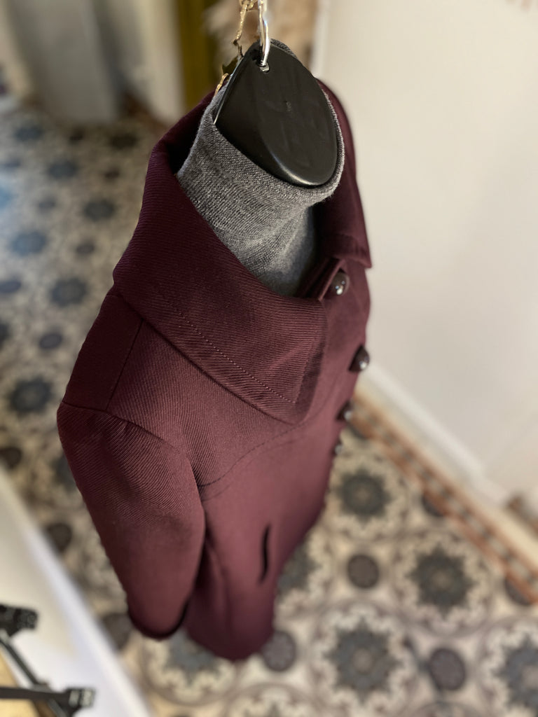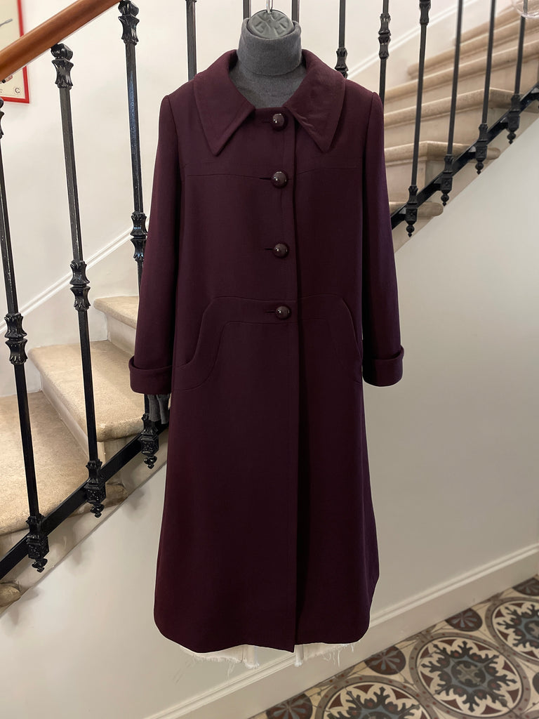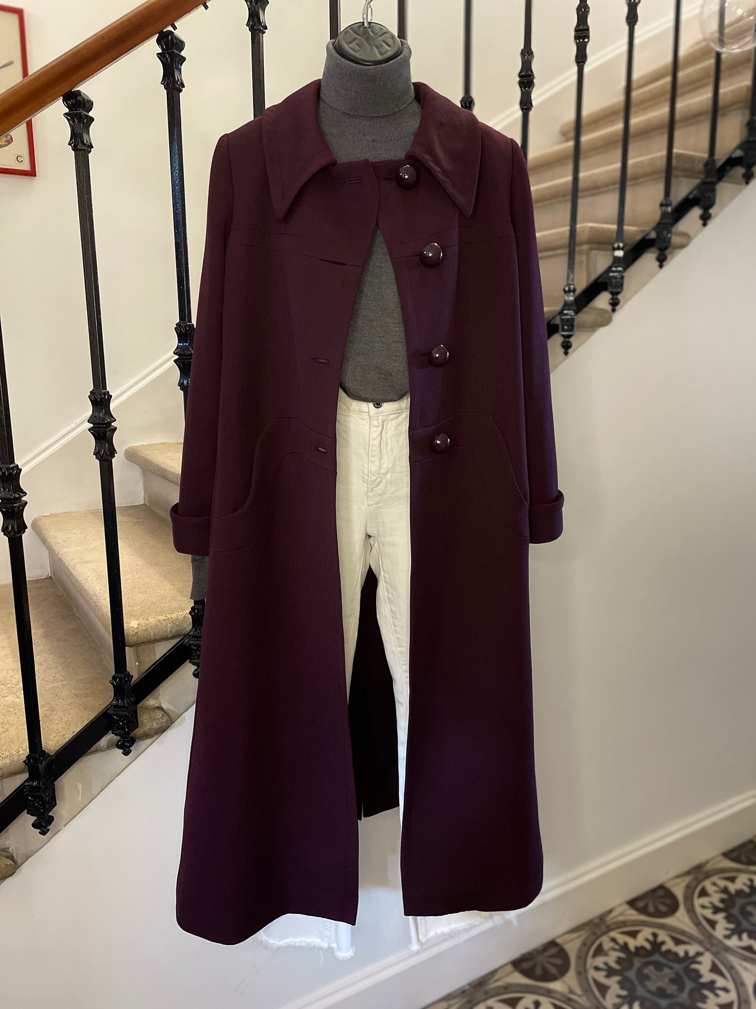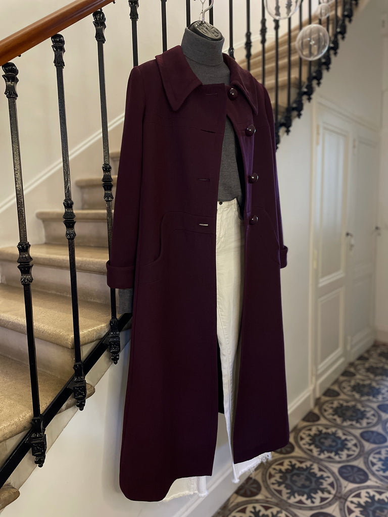 Manteau long de couleur bordeaux, en laine au tissage finement côtelé et surpiqûres ton sur ton. Coupe très légèrement évasée et légèrement plus long à l’avant. Grand col plat en pointe sur l’avant et en arrondi sur l’arrière. Fermeture par gros boutons ronds bordeaux, emblématiques de la maison, 2 poches passepoilées avec découpe, également emblématique. Poignets avec revers fixes et grande fente d’aisance au dos. Doublé.
