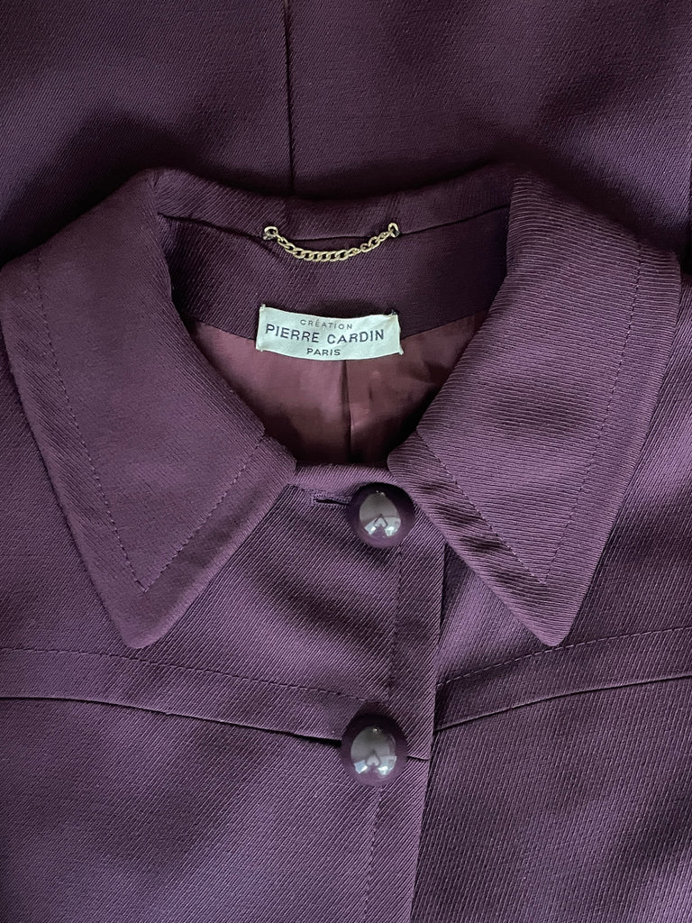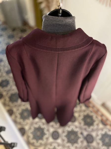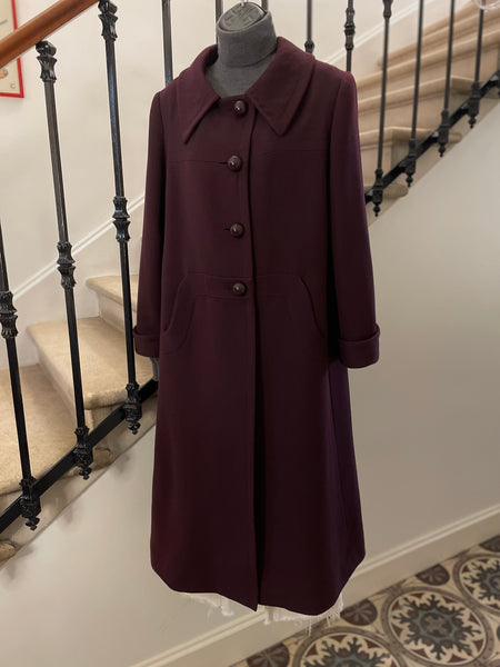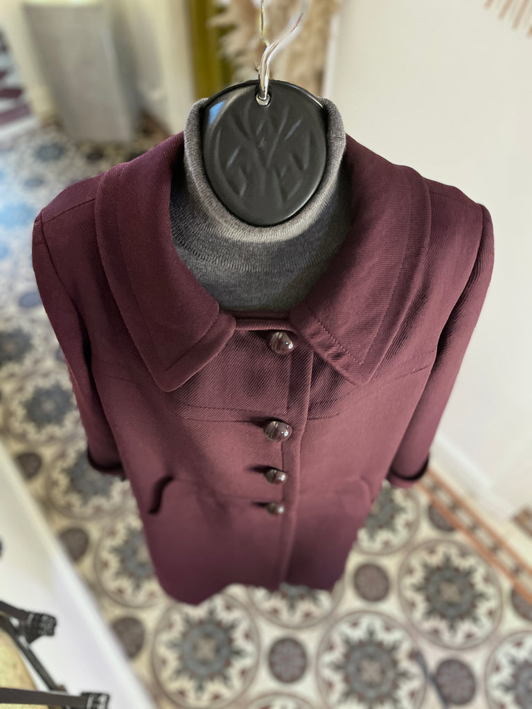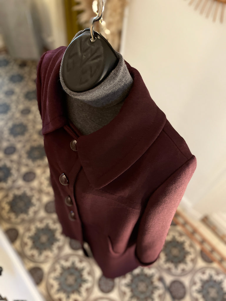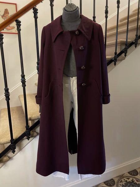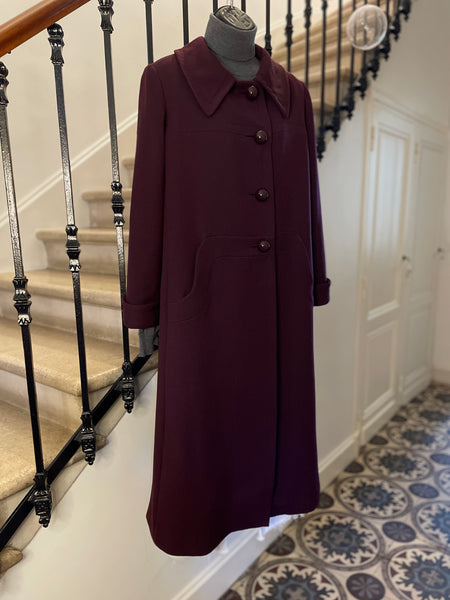 Manteau long de couleur bordeaux, en laine au tissage finement côtelé et surpiqûres ton sur ton. Coupe très légèrement évasée et légèrement plus long à l’avant. Grand col plat en pointe sur l’avant et en arrondi sur l’arrière. Fermeture par gros boutons ronds bordeaux, emblématiques de la maison, 2 poches passepoilées avec découpe, également emblématique. Poignets avec revers fixes et grande fente d’aisance au dos. Doublé.