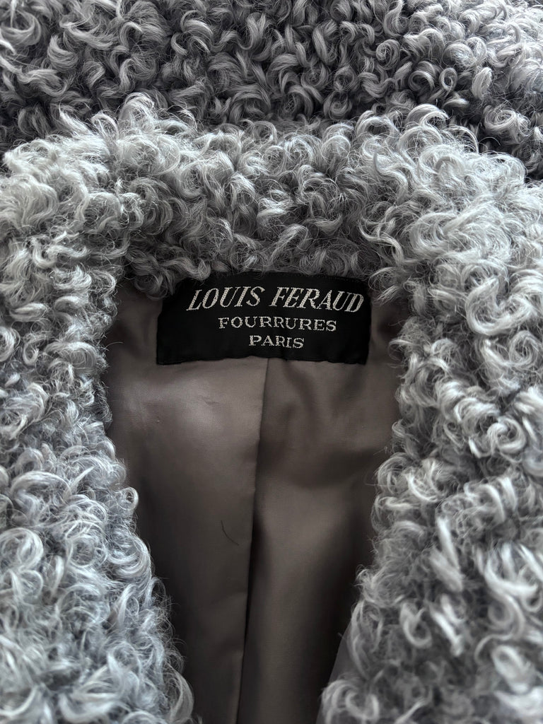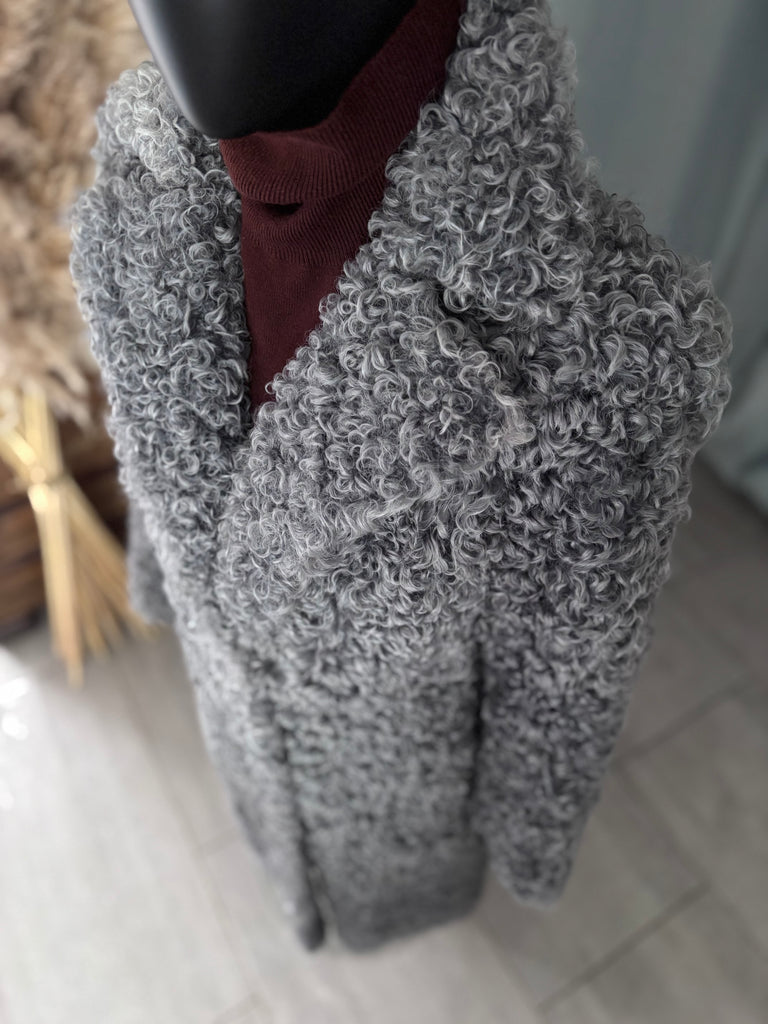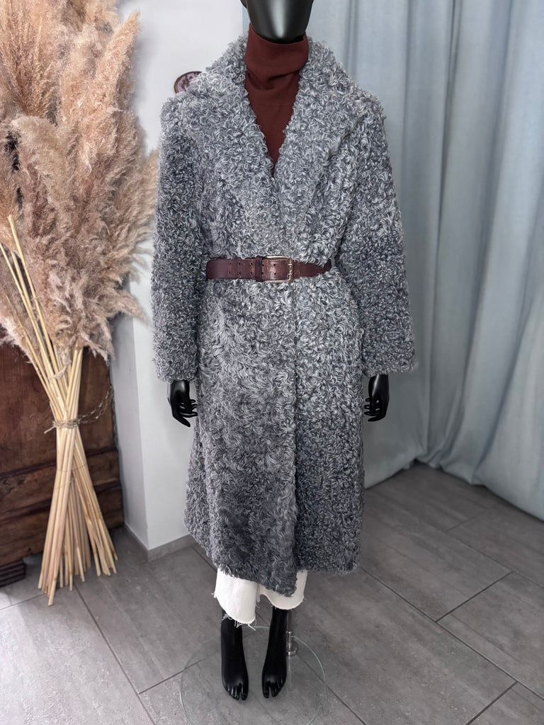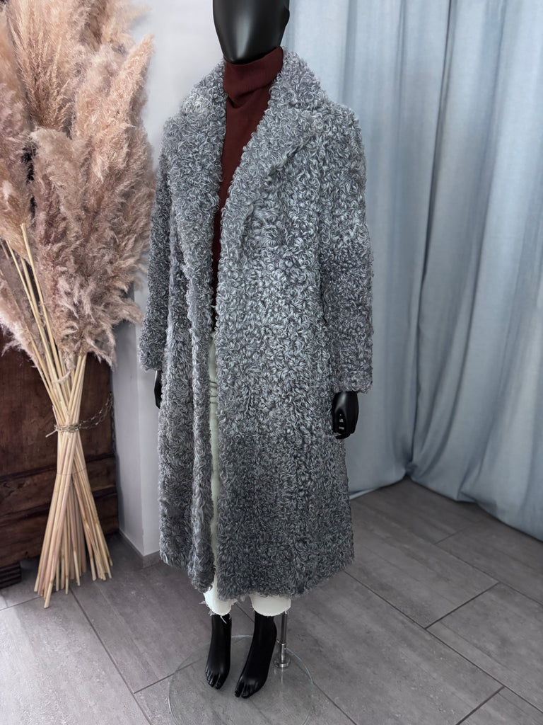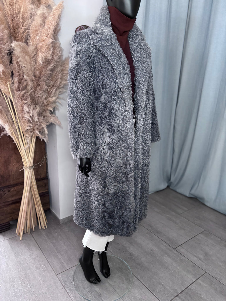 Manteau long en peau lainée bouclée de couleur bleu-gris. Coupe très légèrement ajustée, grand revers, fermeture croisée par liens intérieur et crochet extérieur. 2 poches latérales et 2 passants en fils. Doublé.