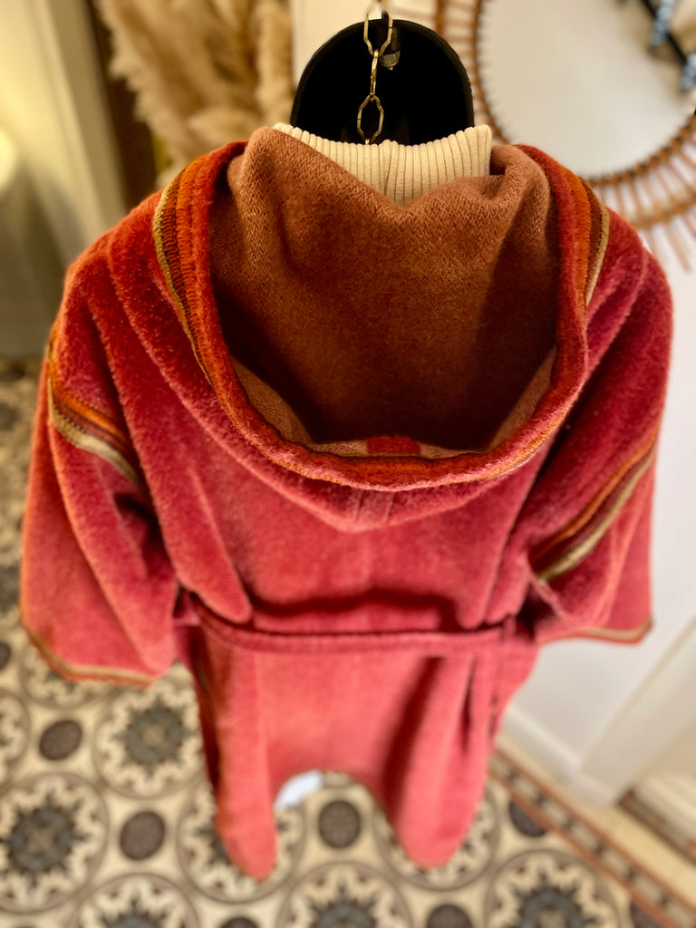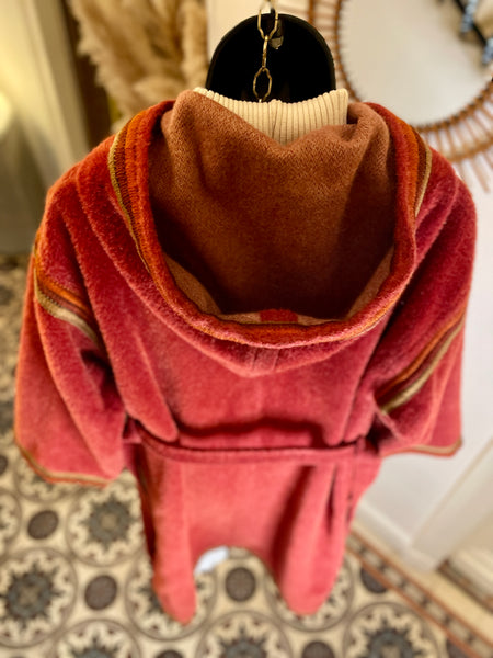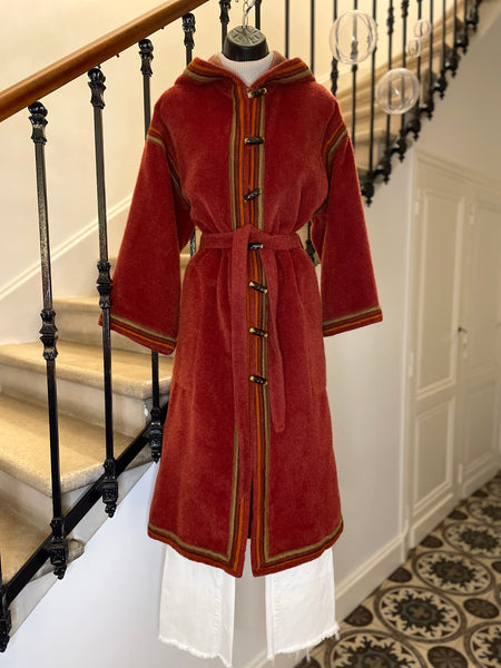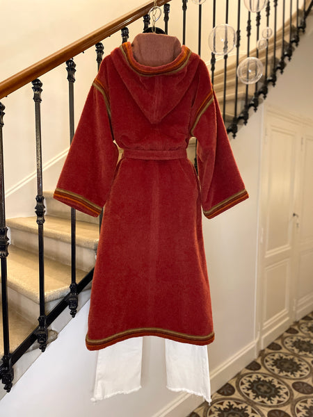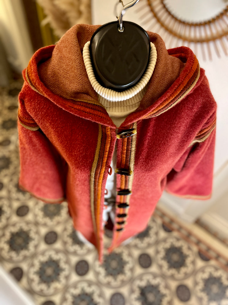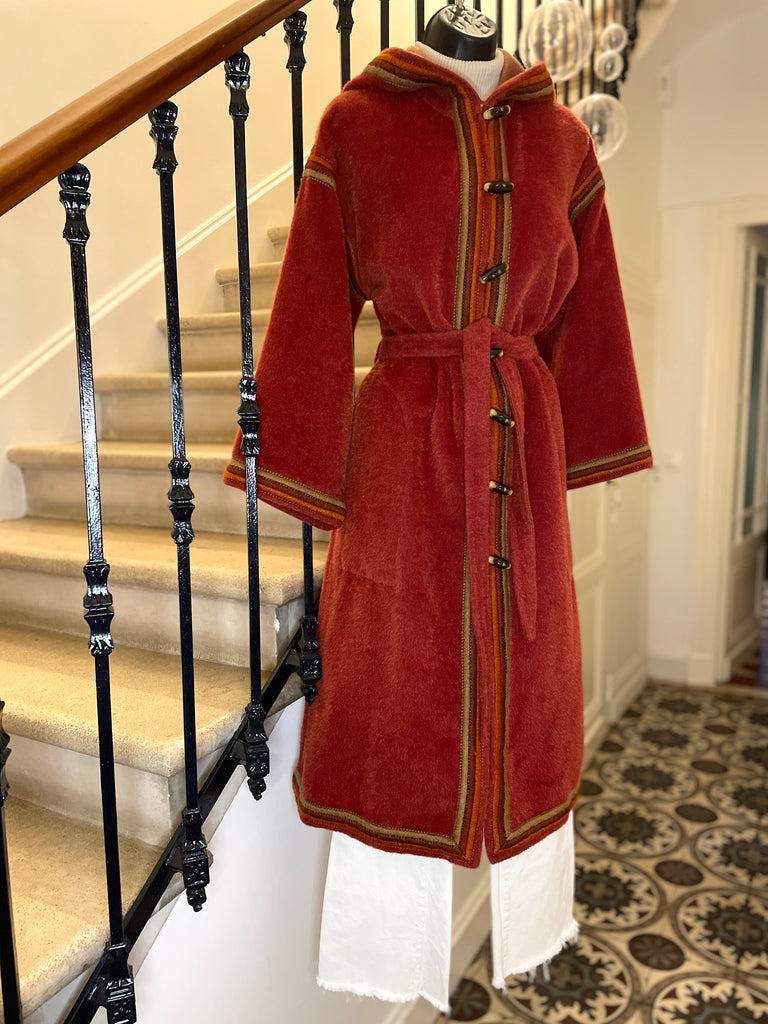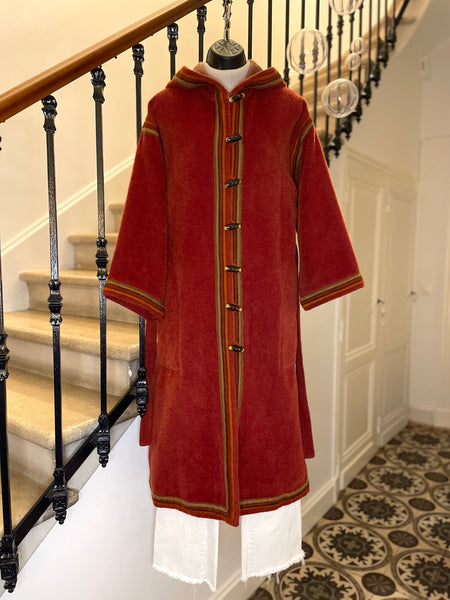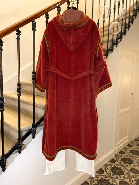 Manteau d’inspiration djellaba en moelleux arraché de Piacenza (maison specialisée en fibres de lama, cachemire et de chameau), de couleur terracotta avec ganse tressée de 3 couleurs (terracotta, orange et taupe). Coupe droite légèrement oversize avec épaules basses et manches larges, fermeture à simple boutonnage avec grands boutons allongés façon écaille. 2 grandes poches plaquées et grande capuche en pointe.