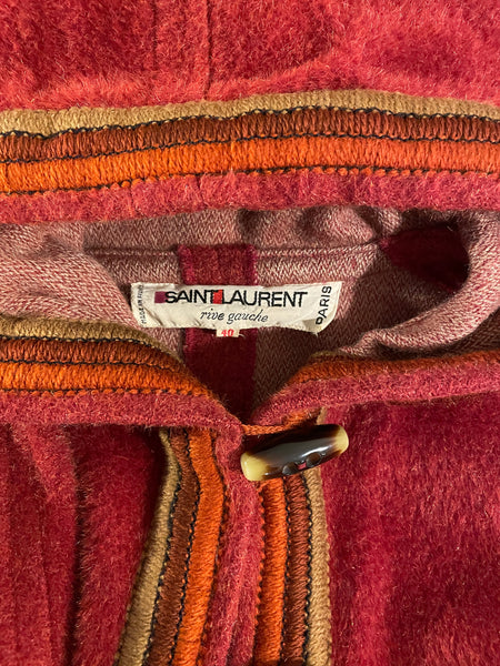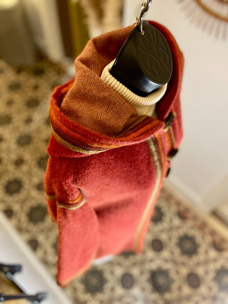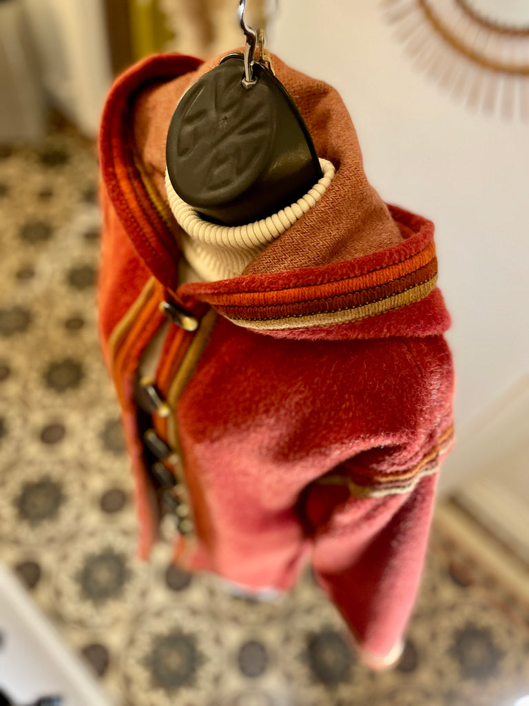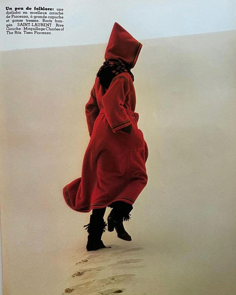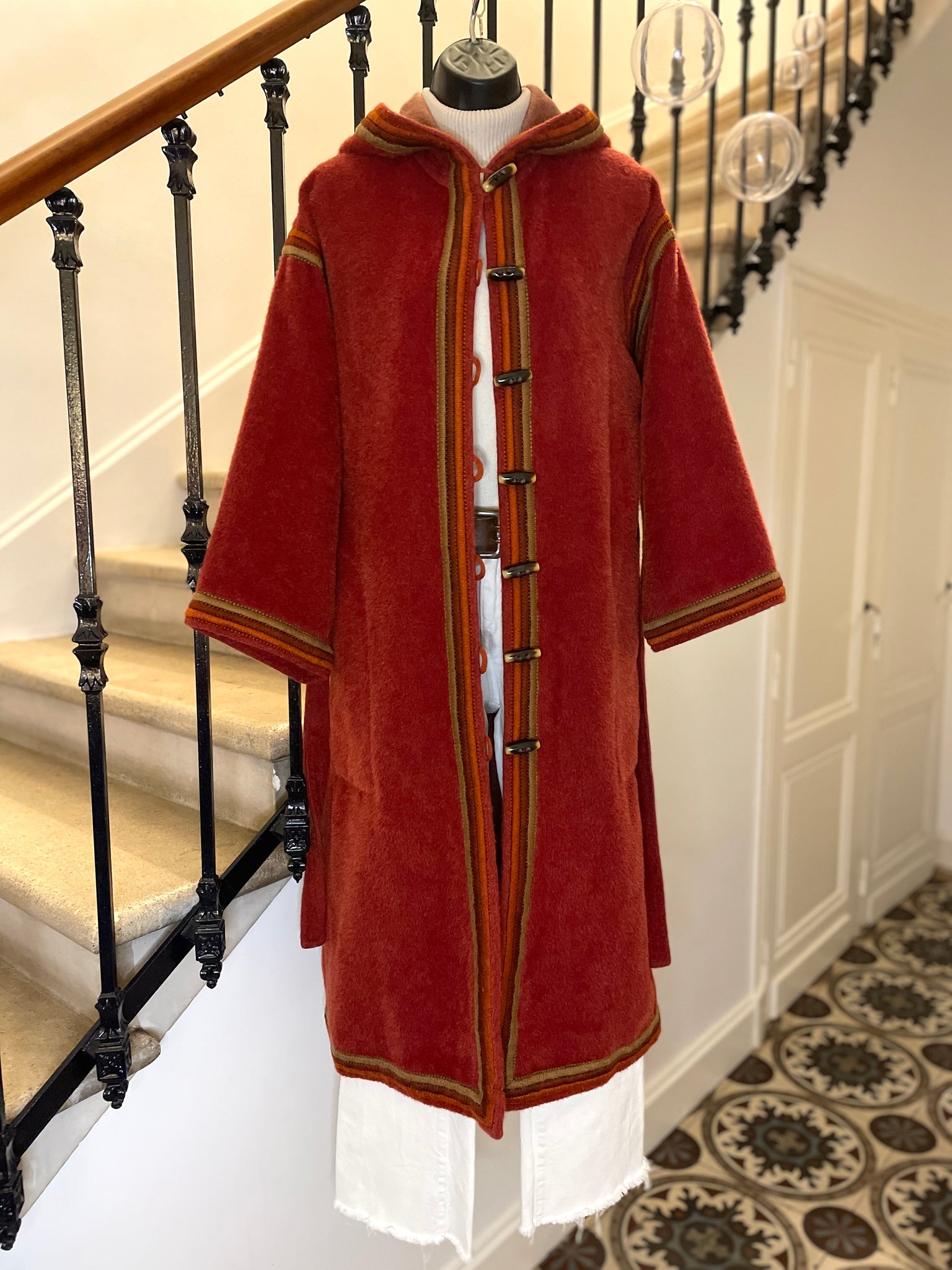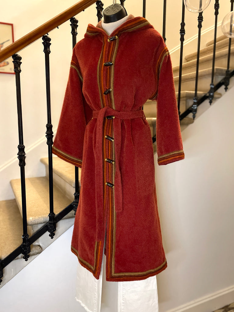 Manteau d’inspiration djellaba en moelleux arraché de Piacenza (maison specialisée en fibres de lama, cachemire et de chameau), de couleur terracotta avec ganse tressée de 3 couleurs (terracotta, orange et taupe). Coupe droite légèrement oversize avec épaules basses et manches larges, fermeture à simple boutonnage avec grands boutons allongés façon écaille. 2 grandes poches plaquées et grande capuche en pointe.
