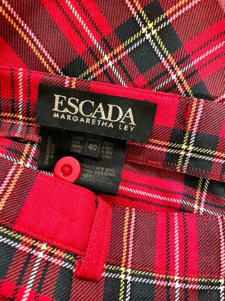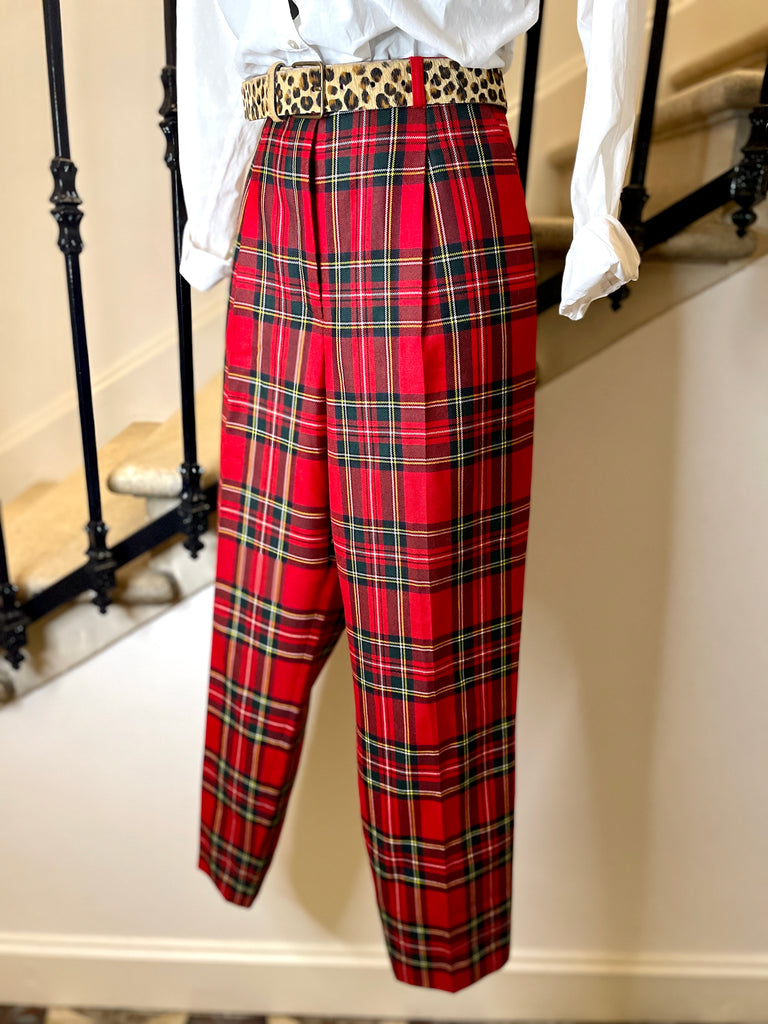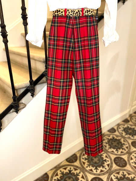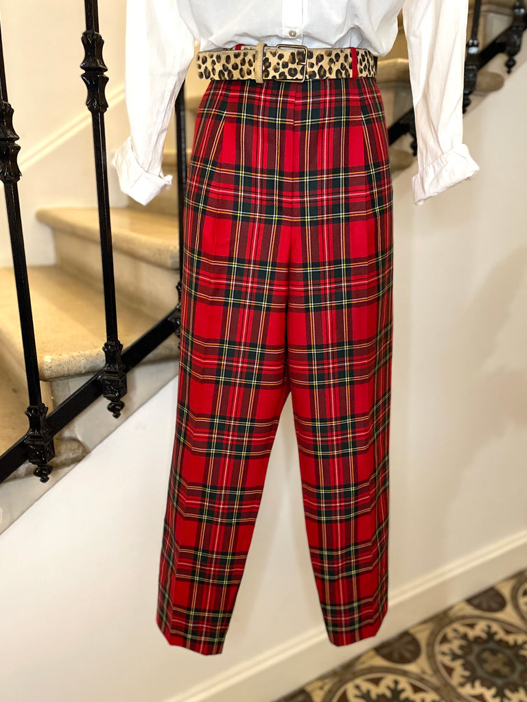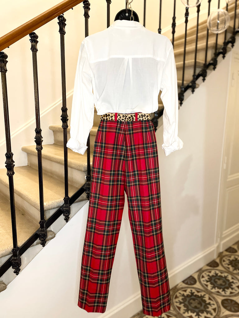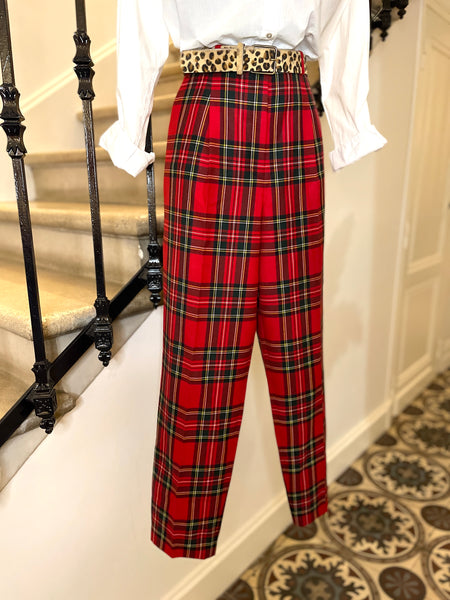 Pantalon en laine à l’imprimé écossais dans des couleurs rouge, noir, blanc et jaune. Coupe taille haute légèrement cigarette avec jeu de plis à la taille. 2 poches latérales.
