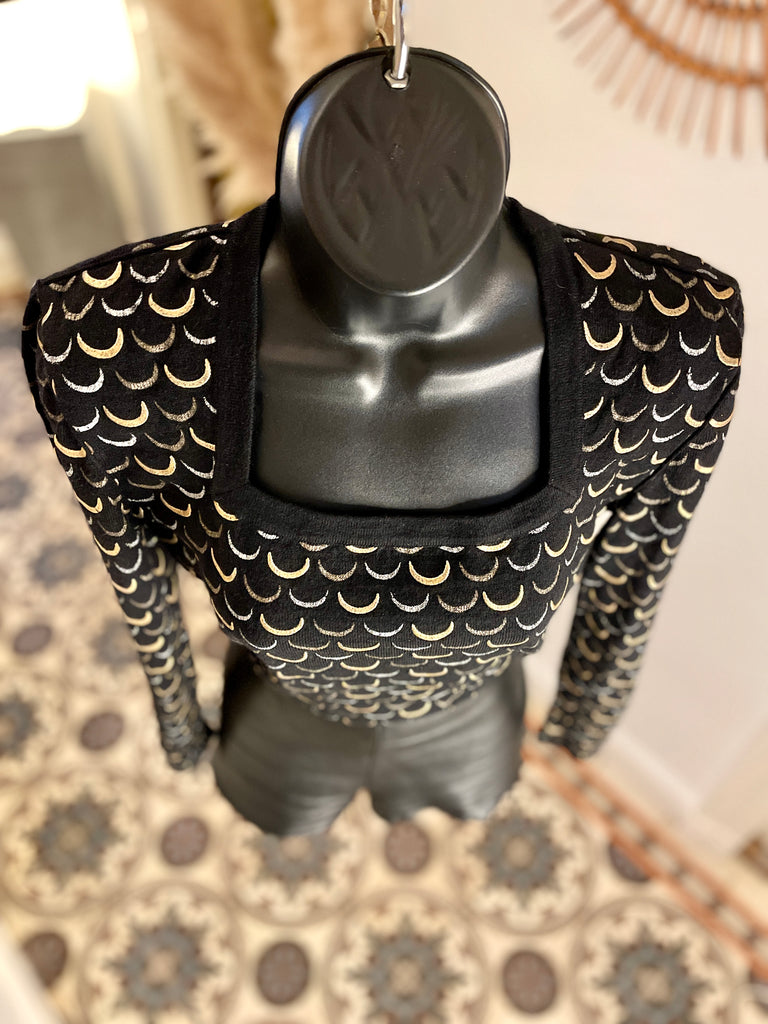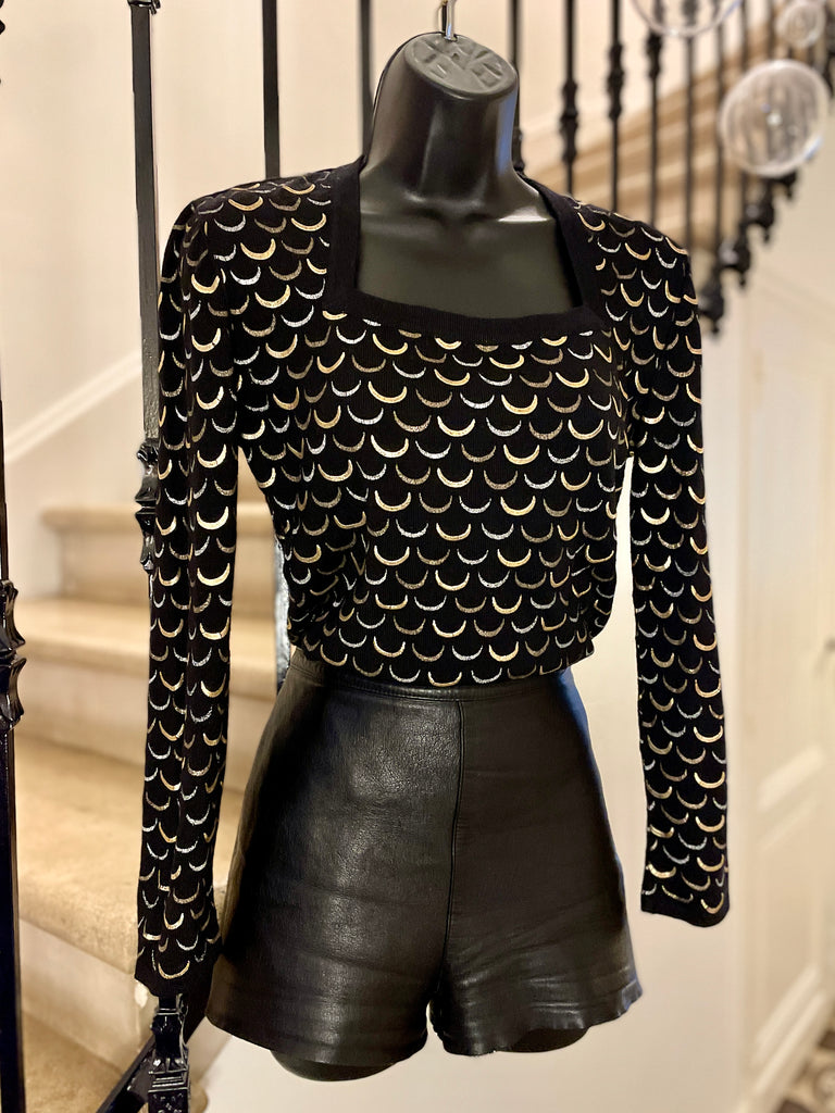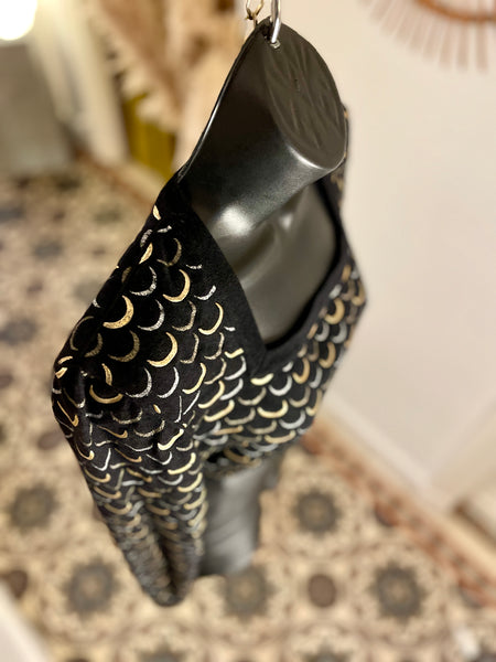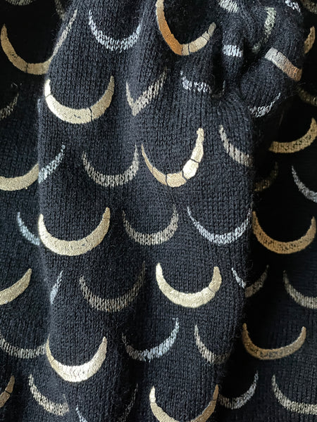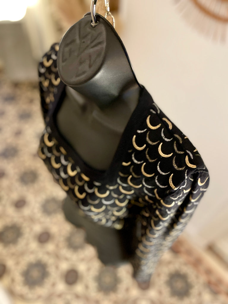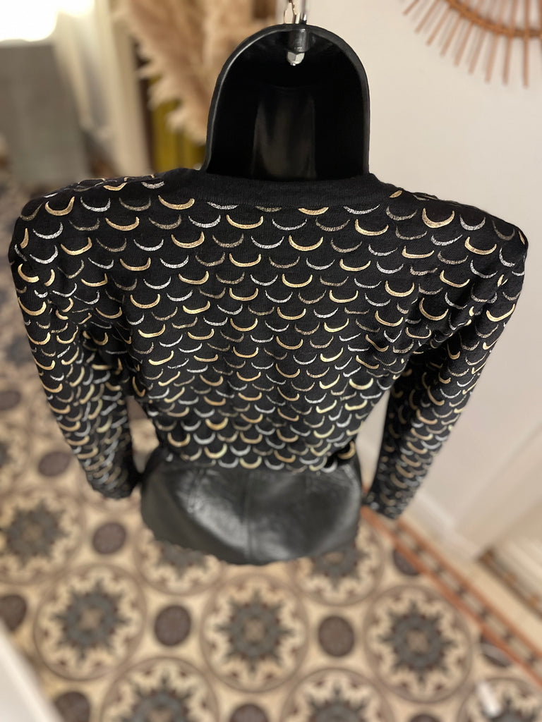 Pull en laine de couleur noire decoré d’écailles (de sirène;) de couleurs doré (2 textures/teintes) et argenté. Coupe ajustée avec décolleté carré.