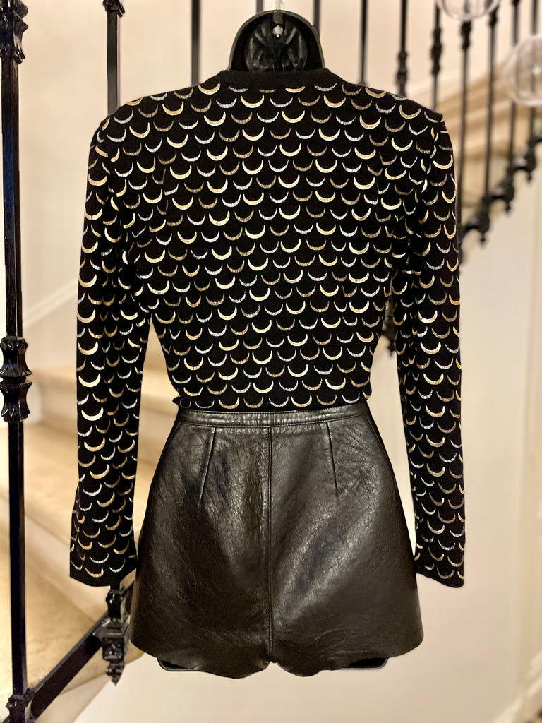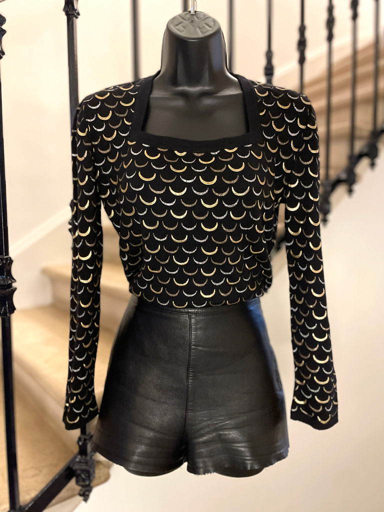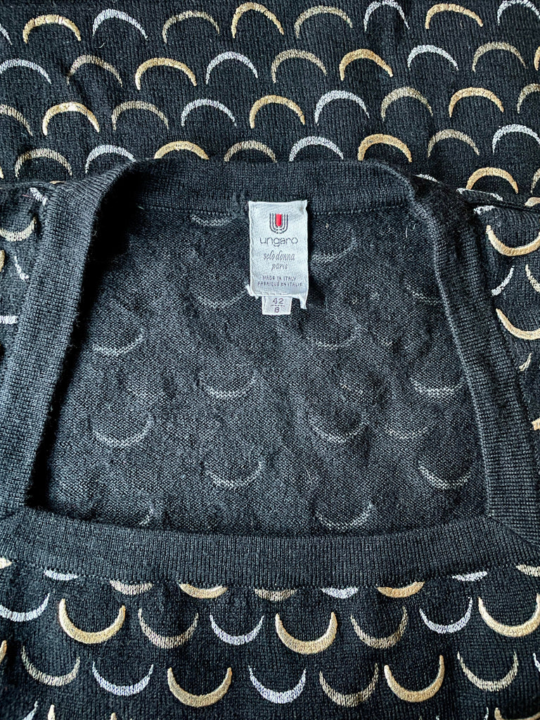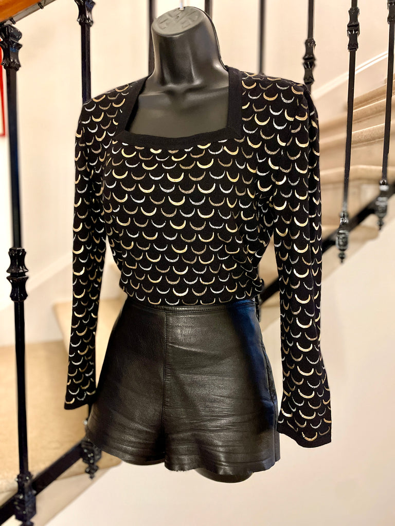 Pull en laine de couleur noire decoré d’écailles (de sirène;) de couleurs doré (2 textures/teintes) et argenté. Coupe ajustée avec décolleté carré.