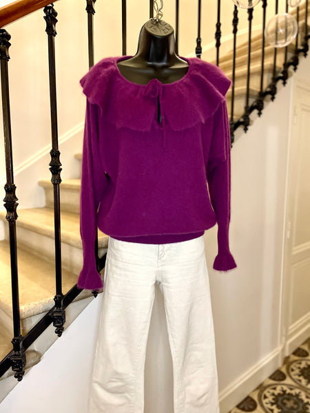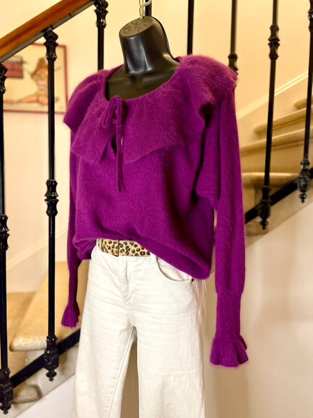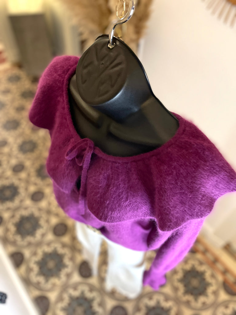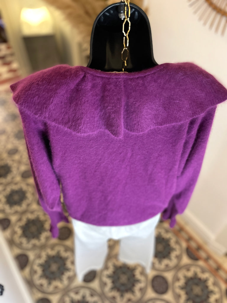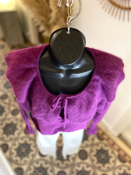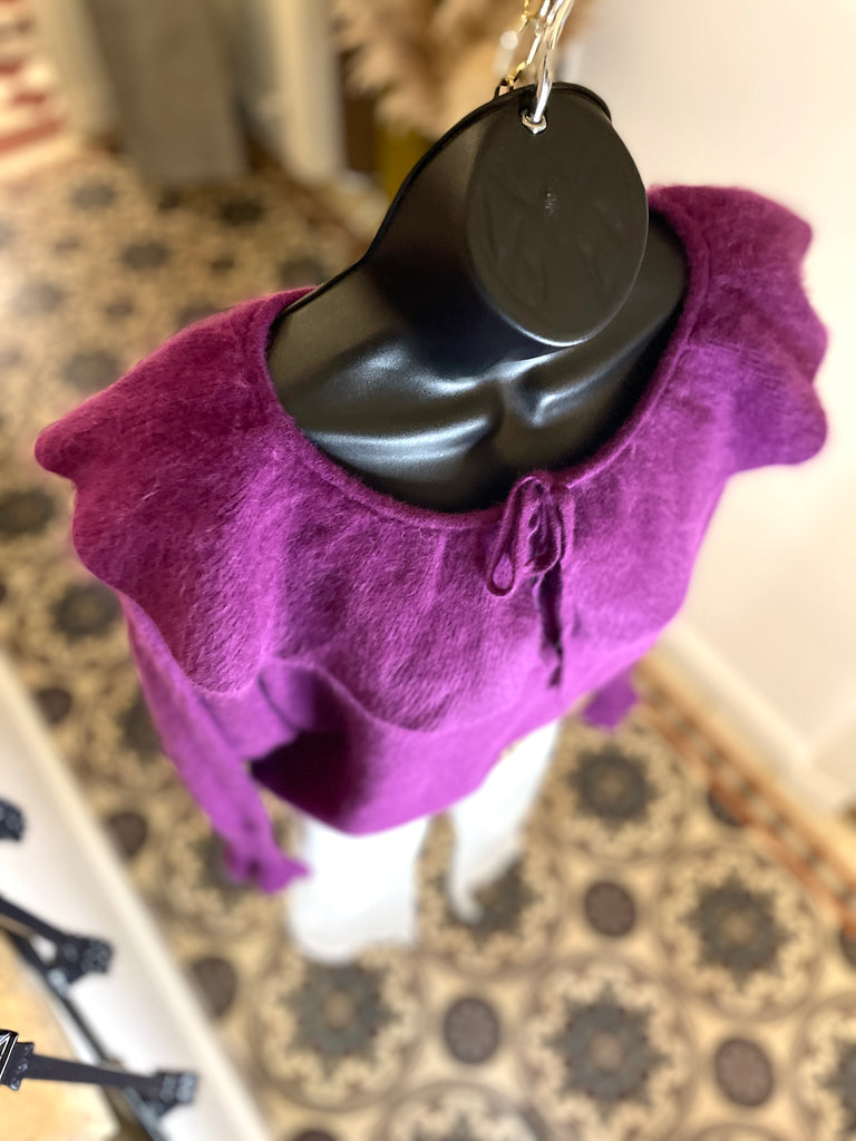 Pull en laine mélangée de couleur prune. Encolure dégagée avec un large volant fermé par nouettes. Emmanchures légèrement chauve-souris et longue manchettes resserrées et terminées par un volant. Resserré à la taille.