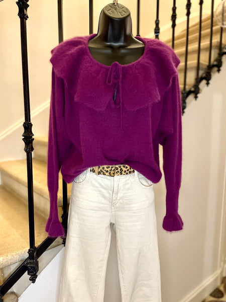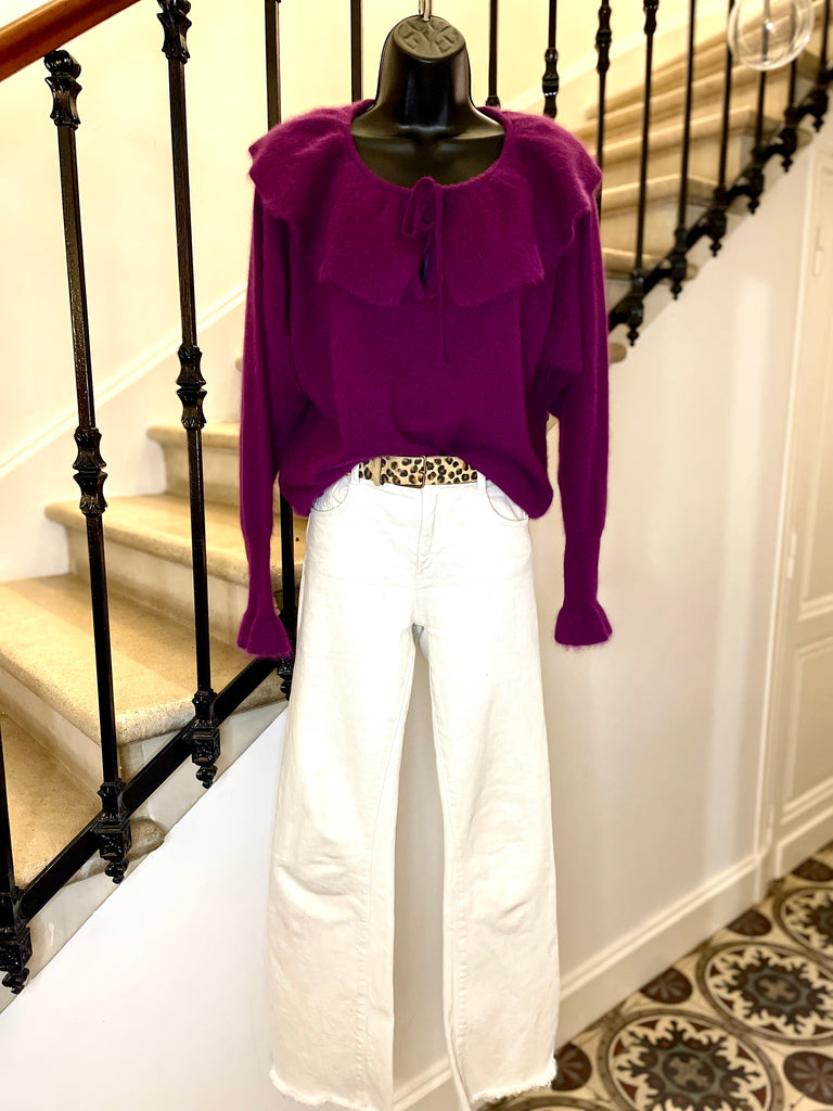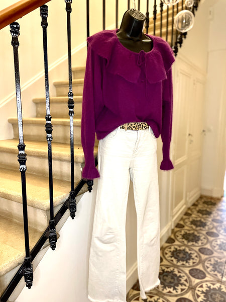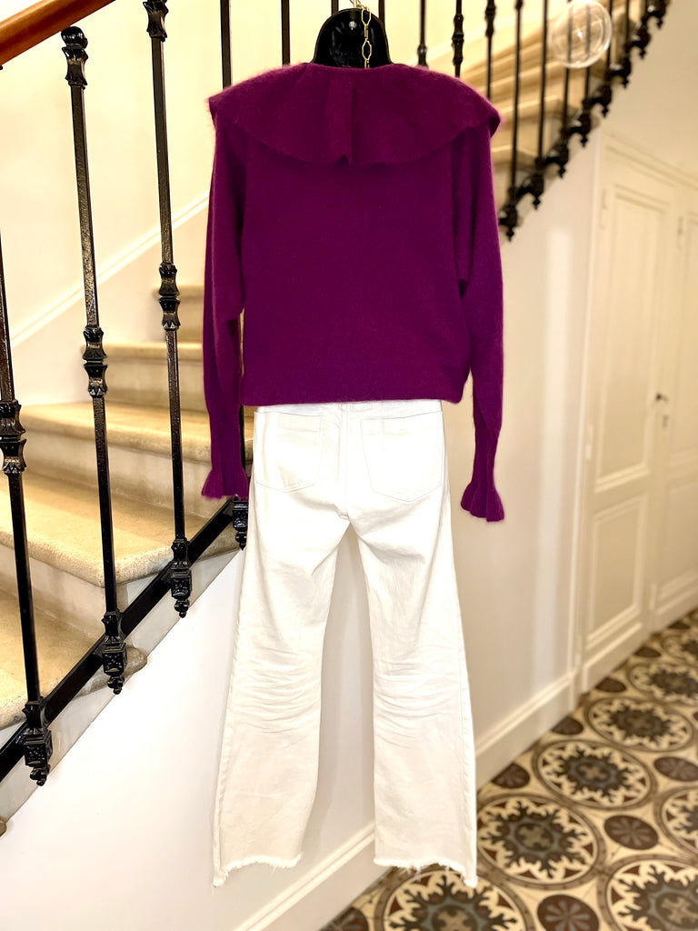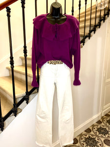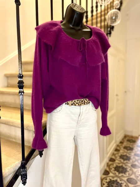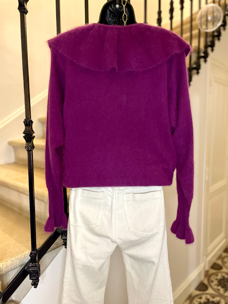 Pull en laine mélangée de couleur prune. Encolure dégagée avec un large volant fermé par nouettes. Emmanchures légèrement chauve-souris et longue manchettes resserrées et terminées par un volant. Resserré à la taille.