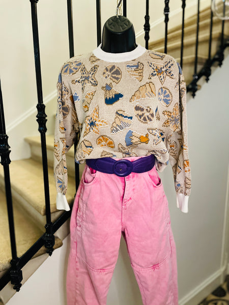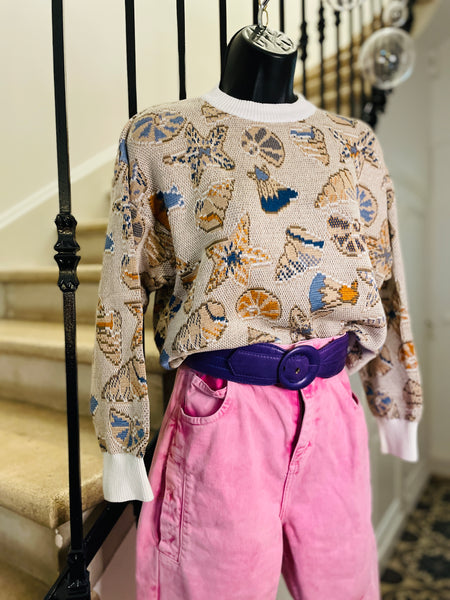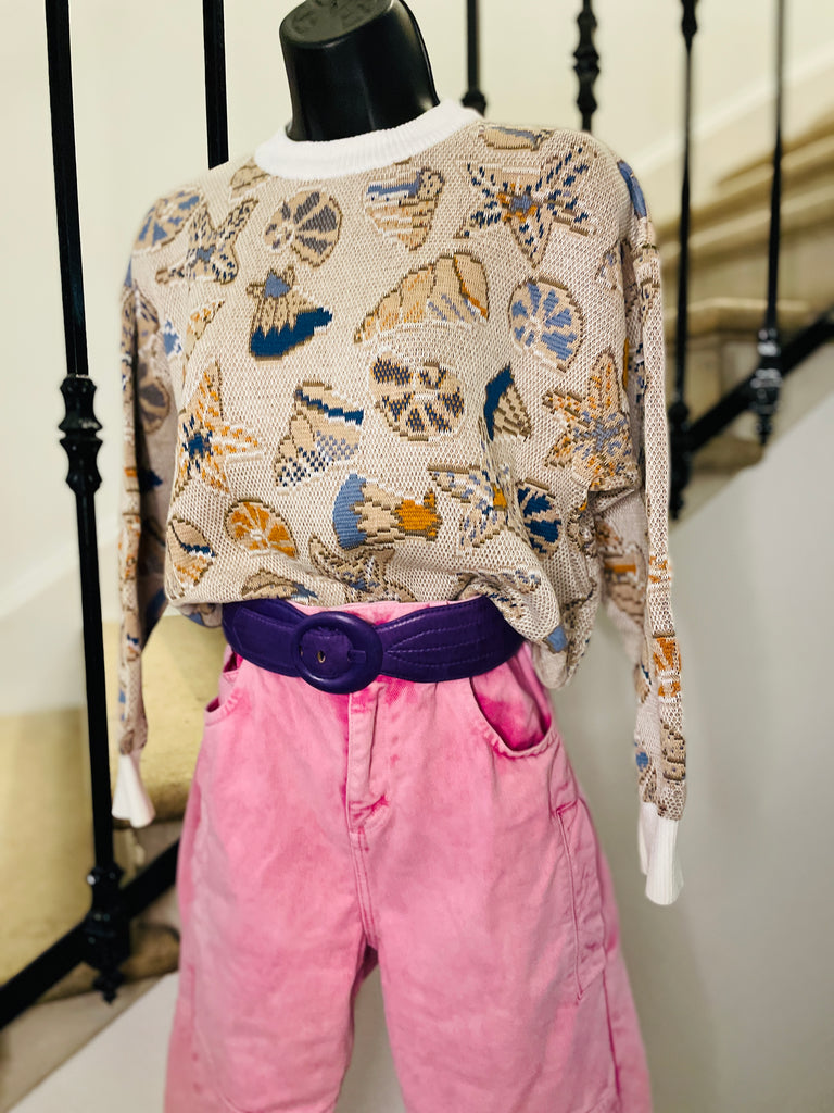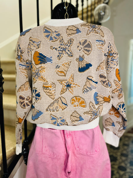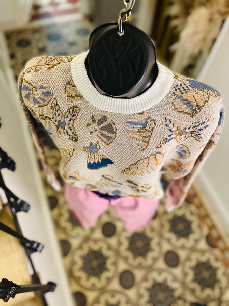 Pull court en coton à l'imprimé coquillages. Col et poignets et ceinture blanc. Coupe crop-oversize.