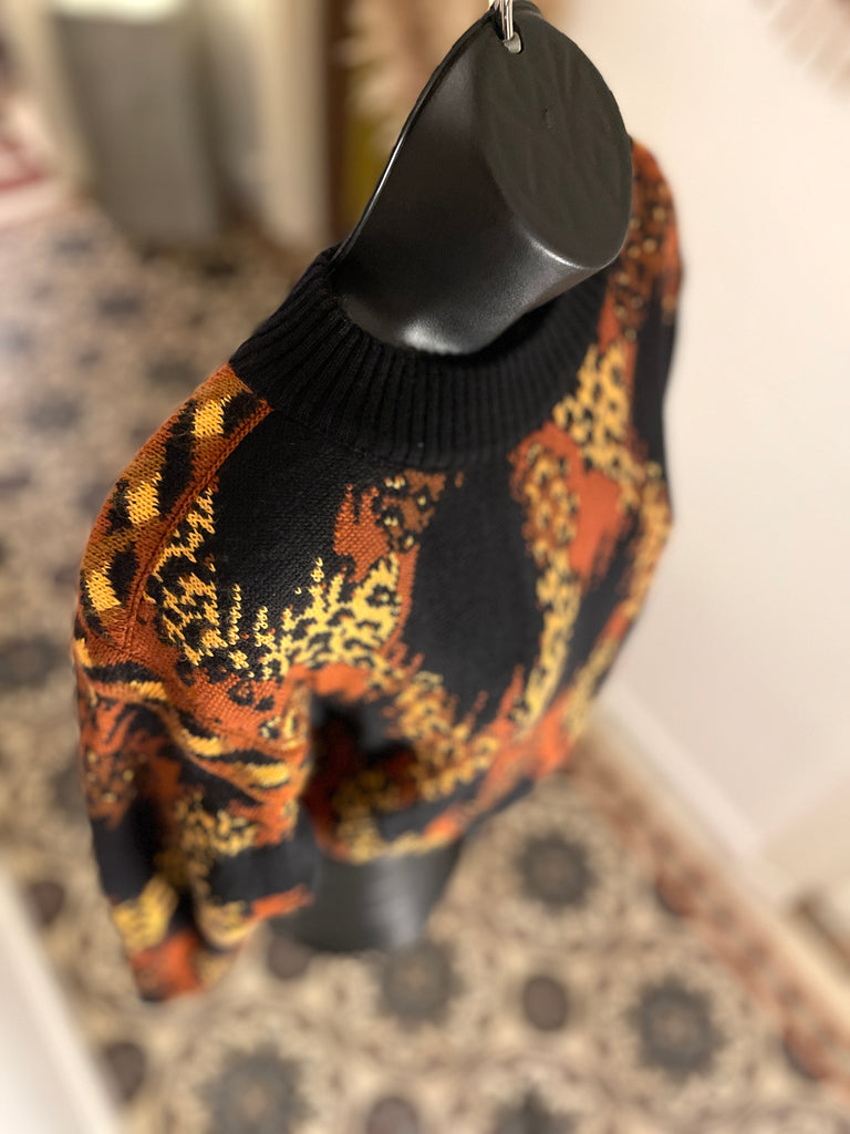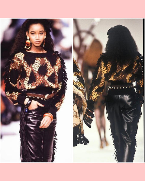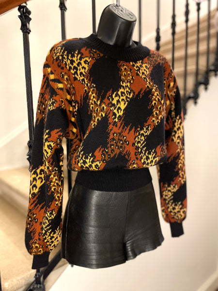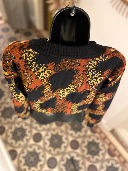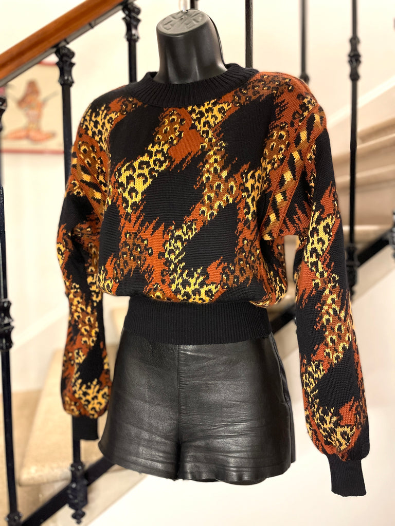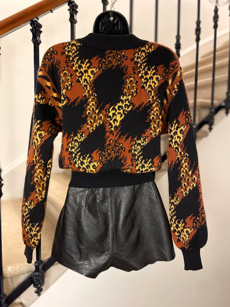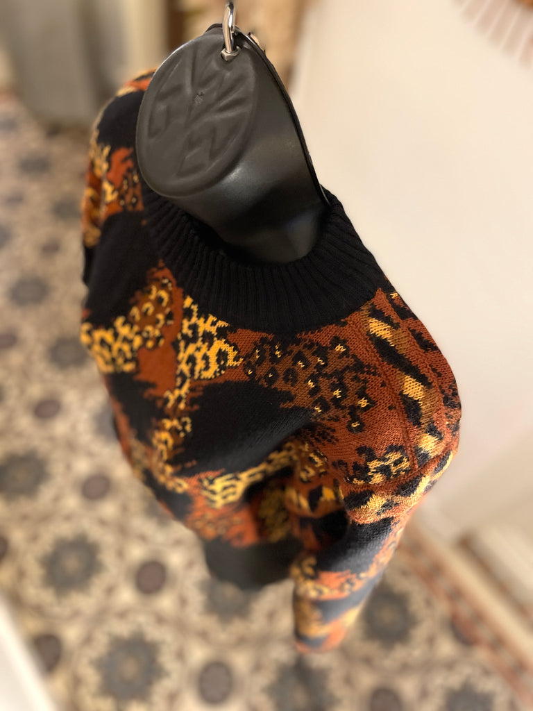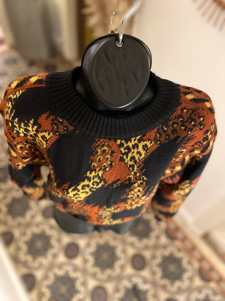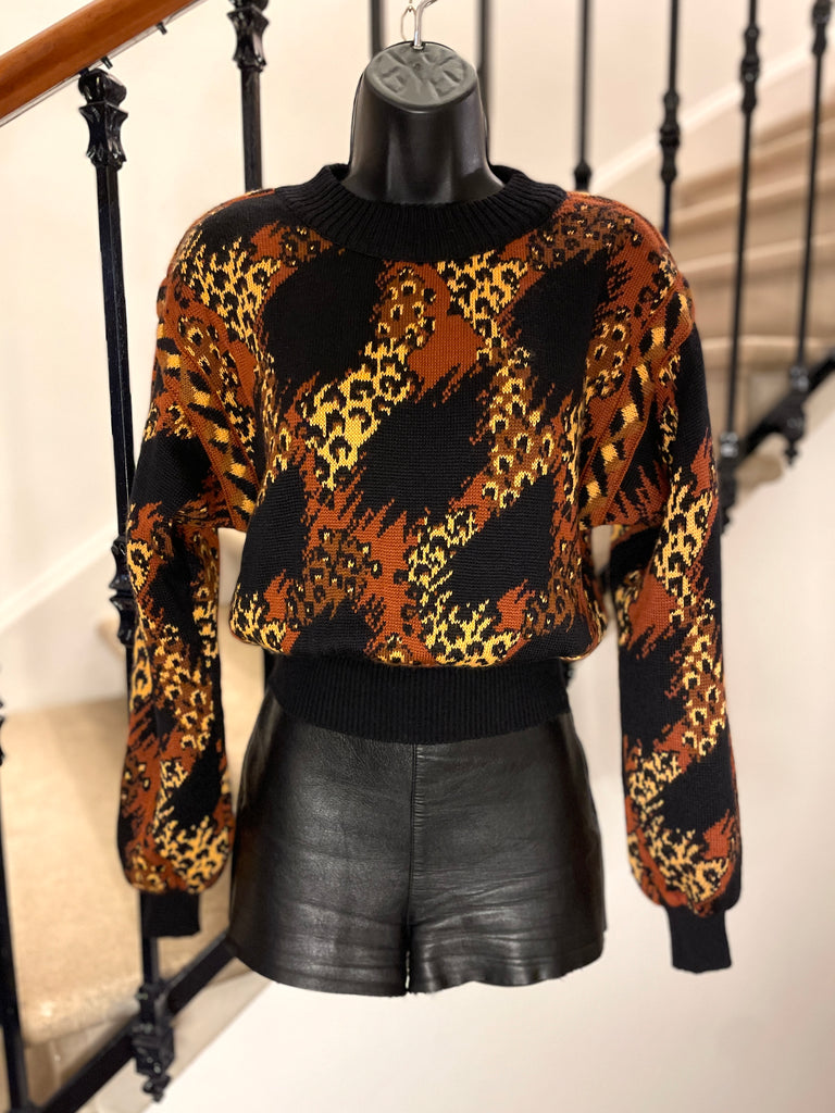 Pull court à l’imprimé Léopard emblématique de la collection Hiver 90-91 dans des couleurs camel, moutarde, marron et noir. Encolure ronde, épaules basses et manches façon chauve-souris, poignets et ceinture resserrés.