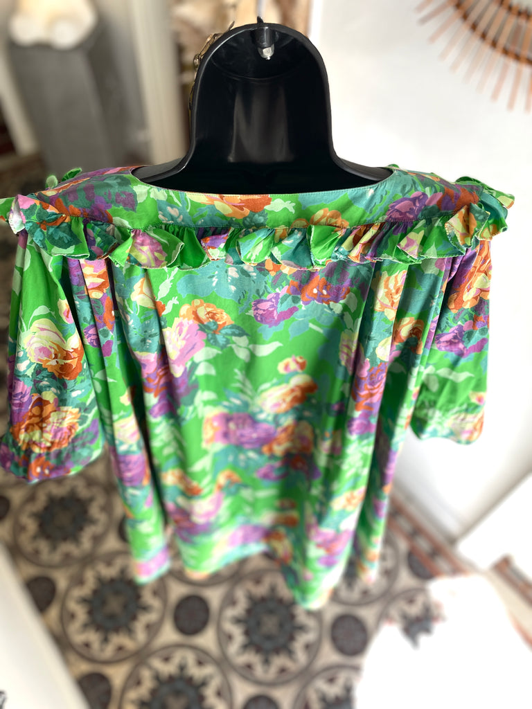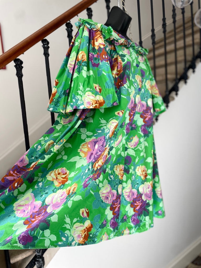 Robe en coton épais à l’imprimé floral violet, rose et orange sur fond vert. Coupe très ample avec jeu de plis, encolure légèrement dégagée, à la façon d’une encolure bateau, et bordée d’un volant. Fermeture par 4 boutons violets, manches très évasées avec renfort pour créer un léger effet volanté. 2 poches dans le biais. Non doublée.