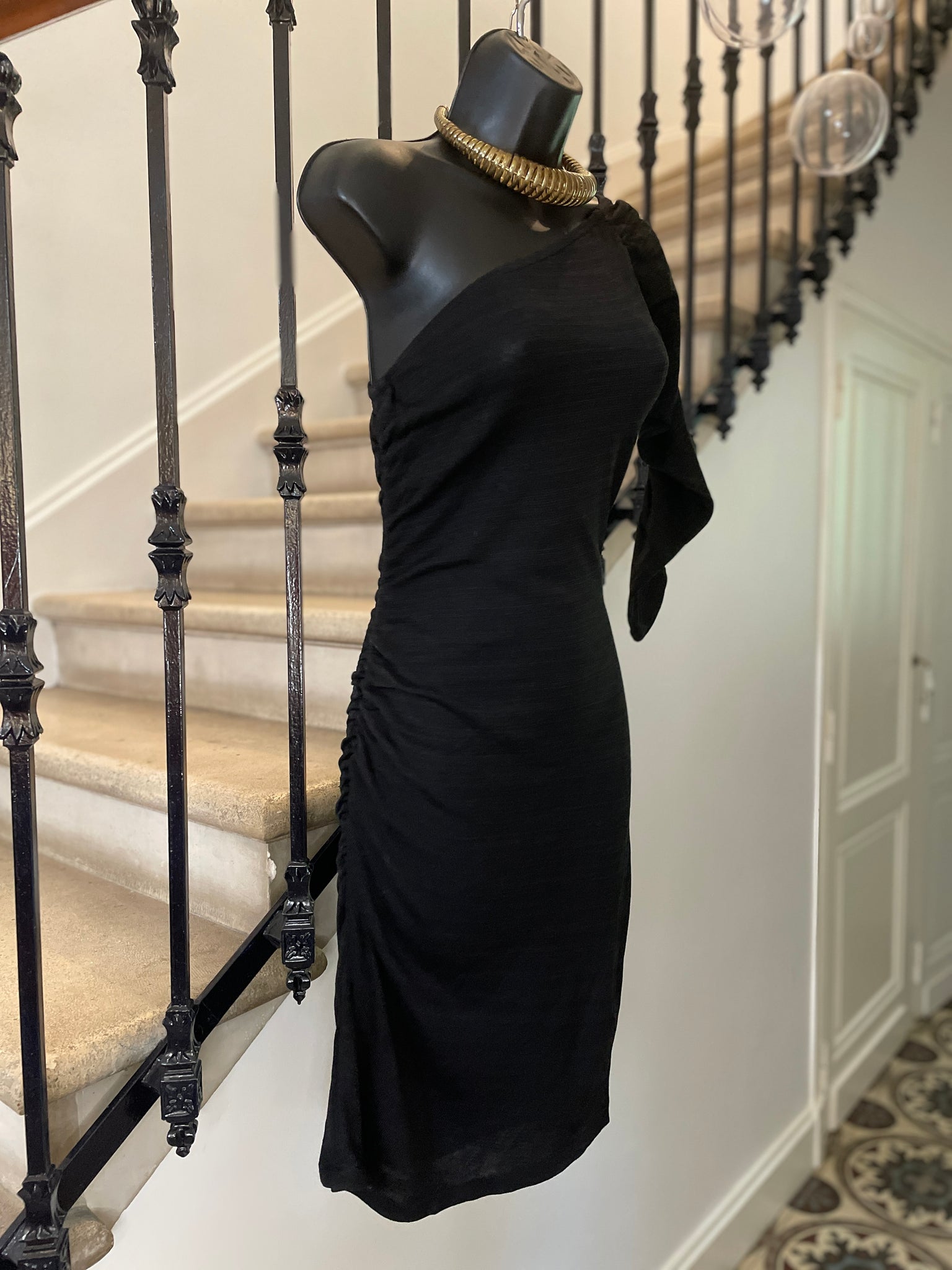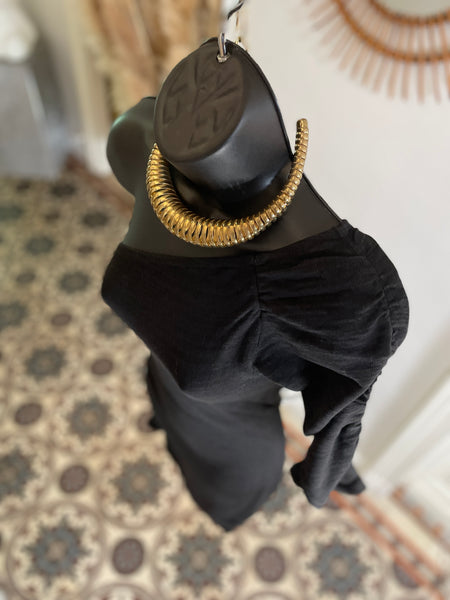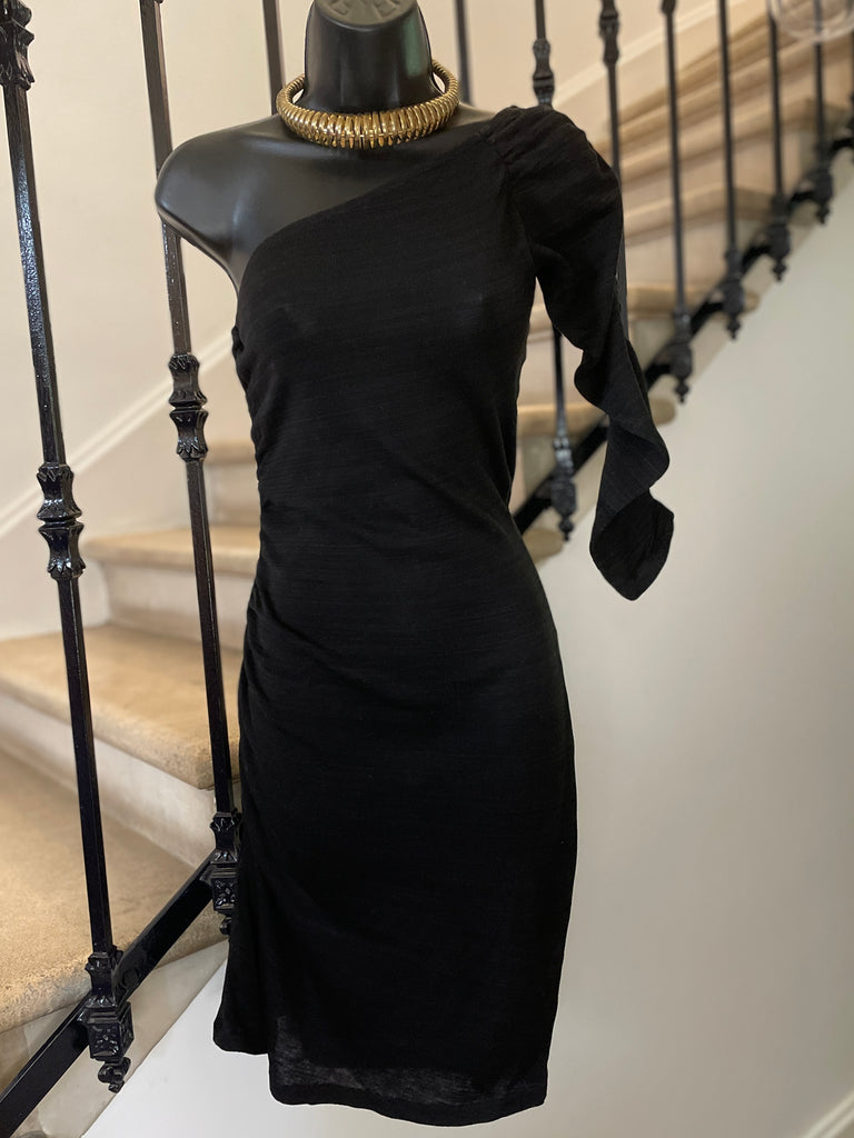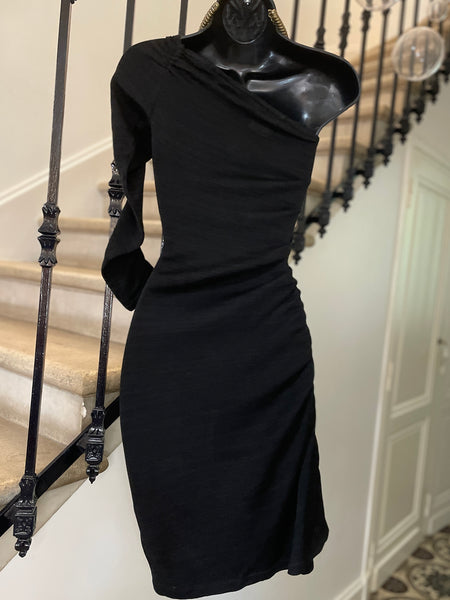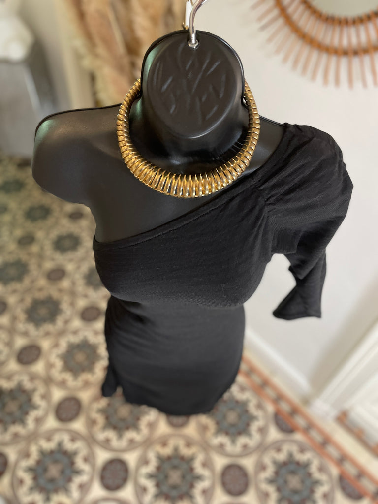 Robe en fil d’Ecosse (tissage très fin) de couleur noire. Coupe ajustée et asymétrique avec une épaule dénudée et une manche 3/4 plissée par un elastique tout comme le côté droit de la robe. Encolure en biais elastiquée.