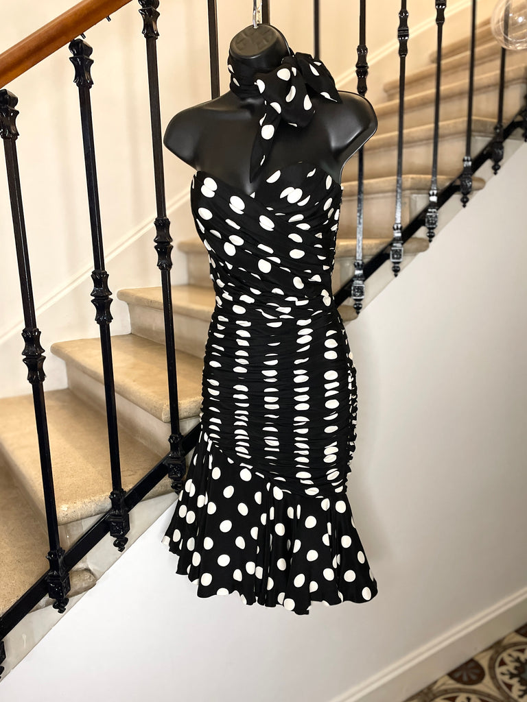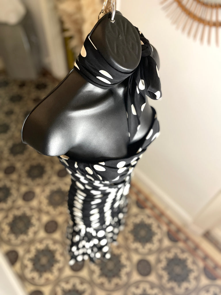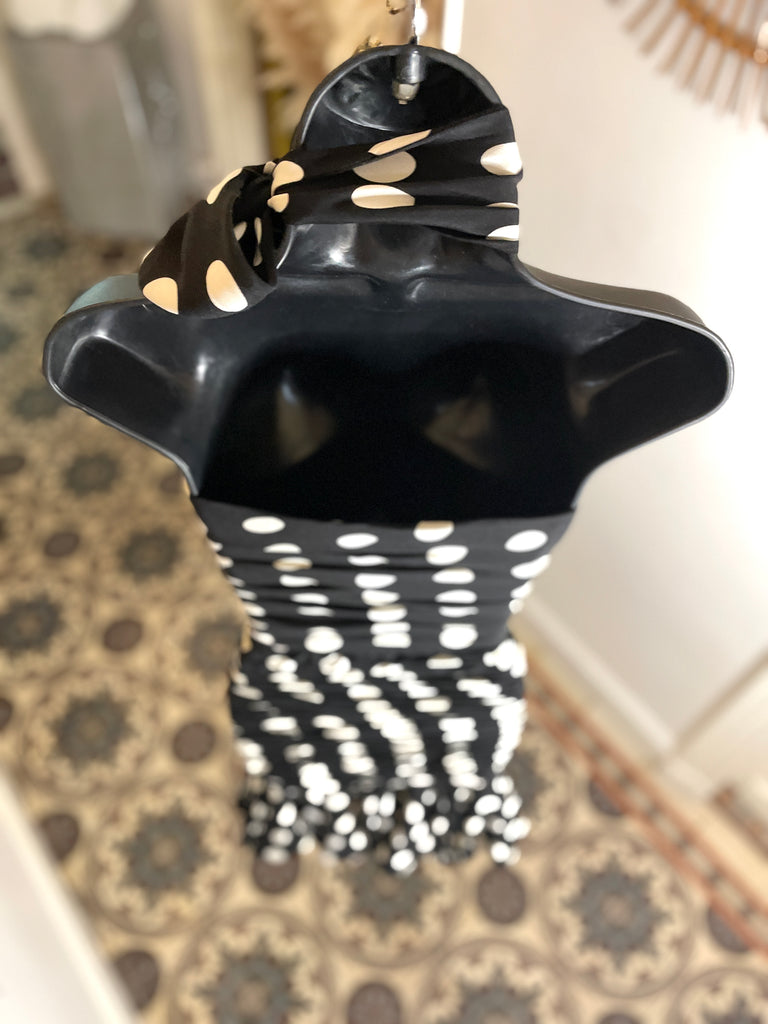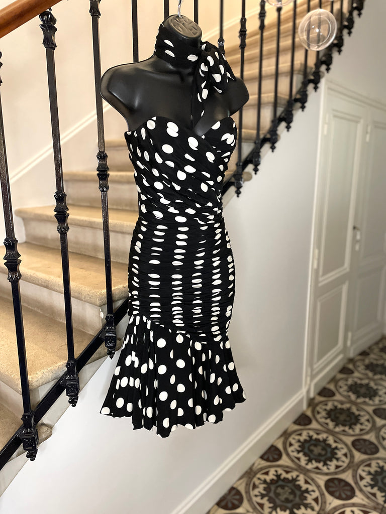 Robe bustier et fourreau à l’imprimé pois blanc sur fond noir avec foulard assorti. Décolleté en cœur, buste avec baleines et fermeture latérale pas zip masqué et petit crochet. Sublime jeu de plis du buste au bas des hanches, large volant asymétrique sur le bas, doublé d’un volant satiné et terminé par une bande de tulle brodé. Entièrement doublée.