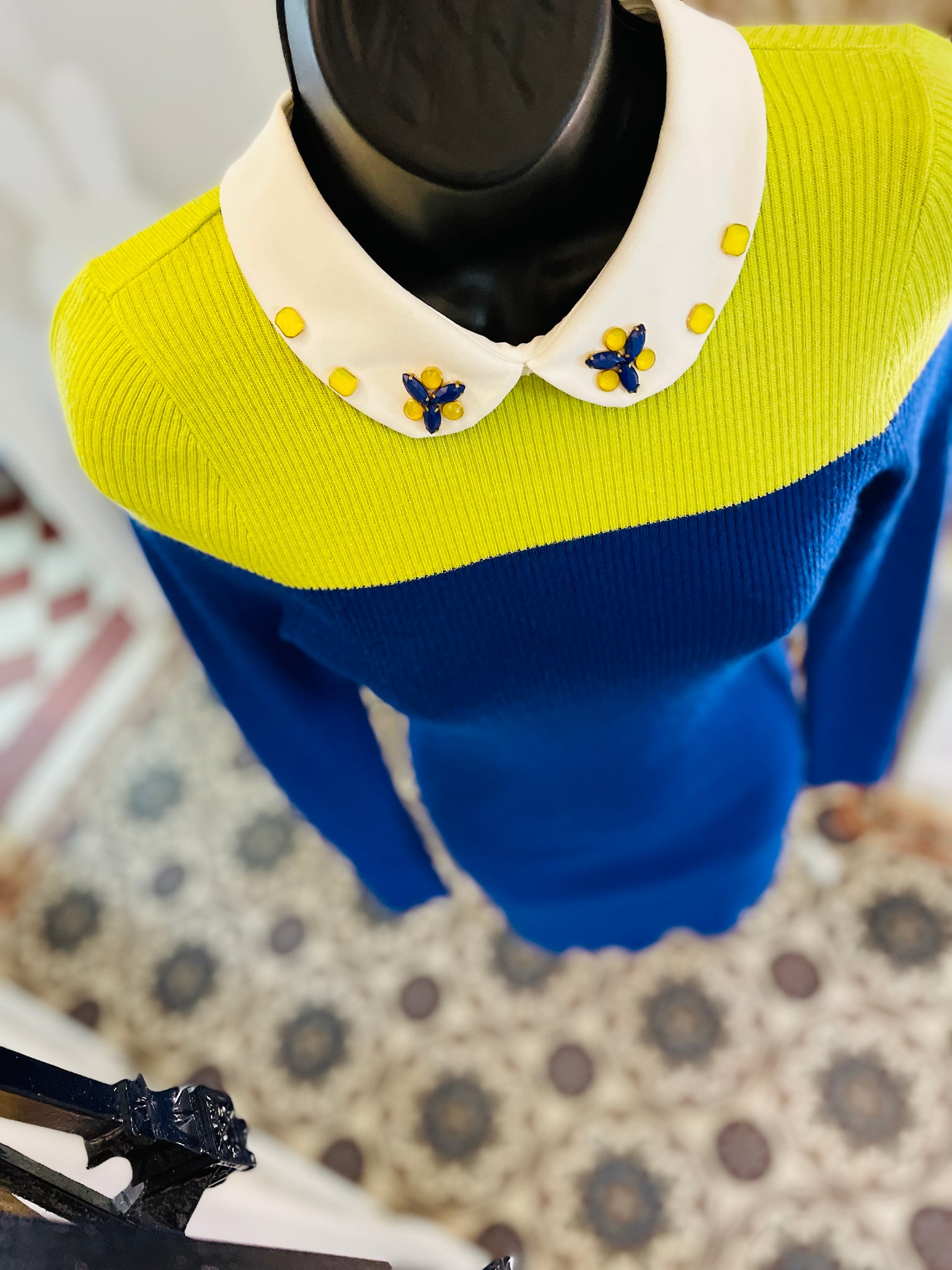 Robe en laine bicolore (vert anis et bleu roi). Très joli col Claudine décoré de petites pierres fantaisie jaunes et bleues . Fermeture dans le dos par un petit bouton blanc.