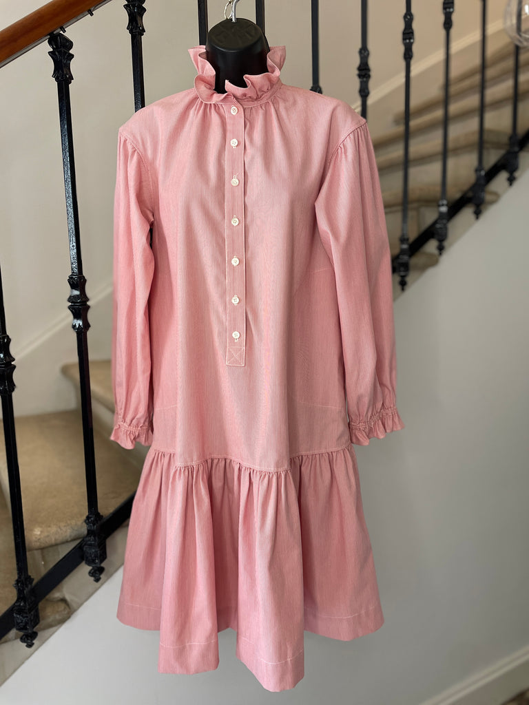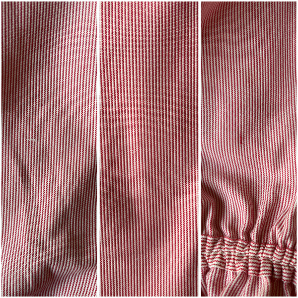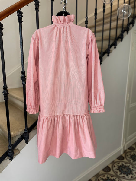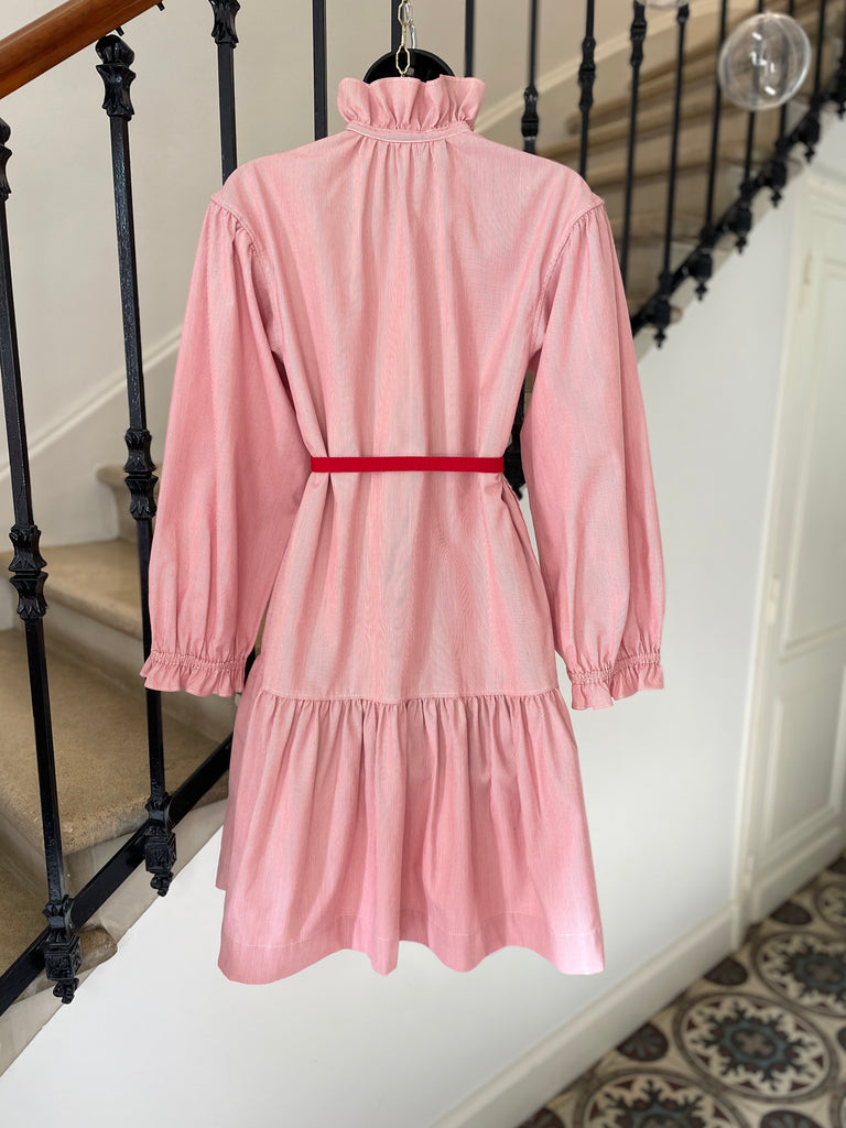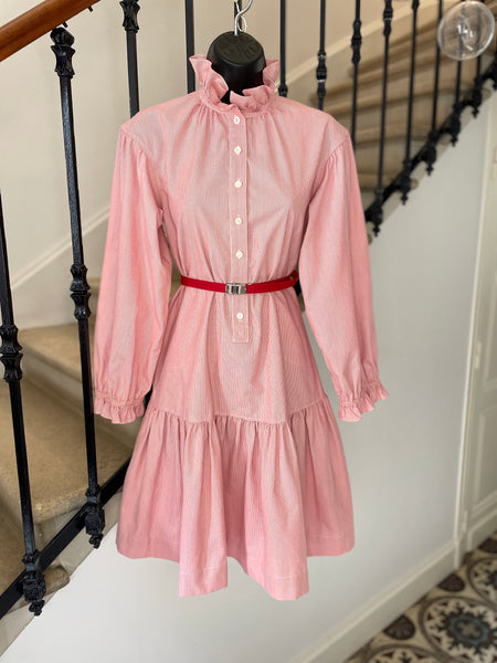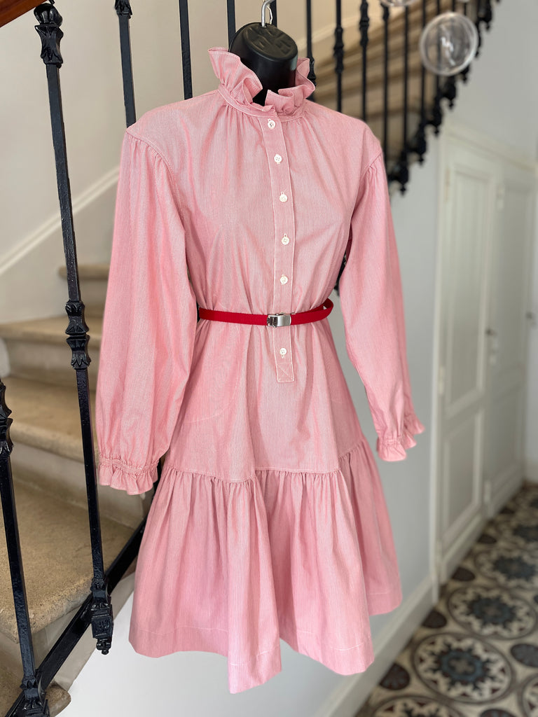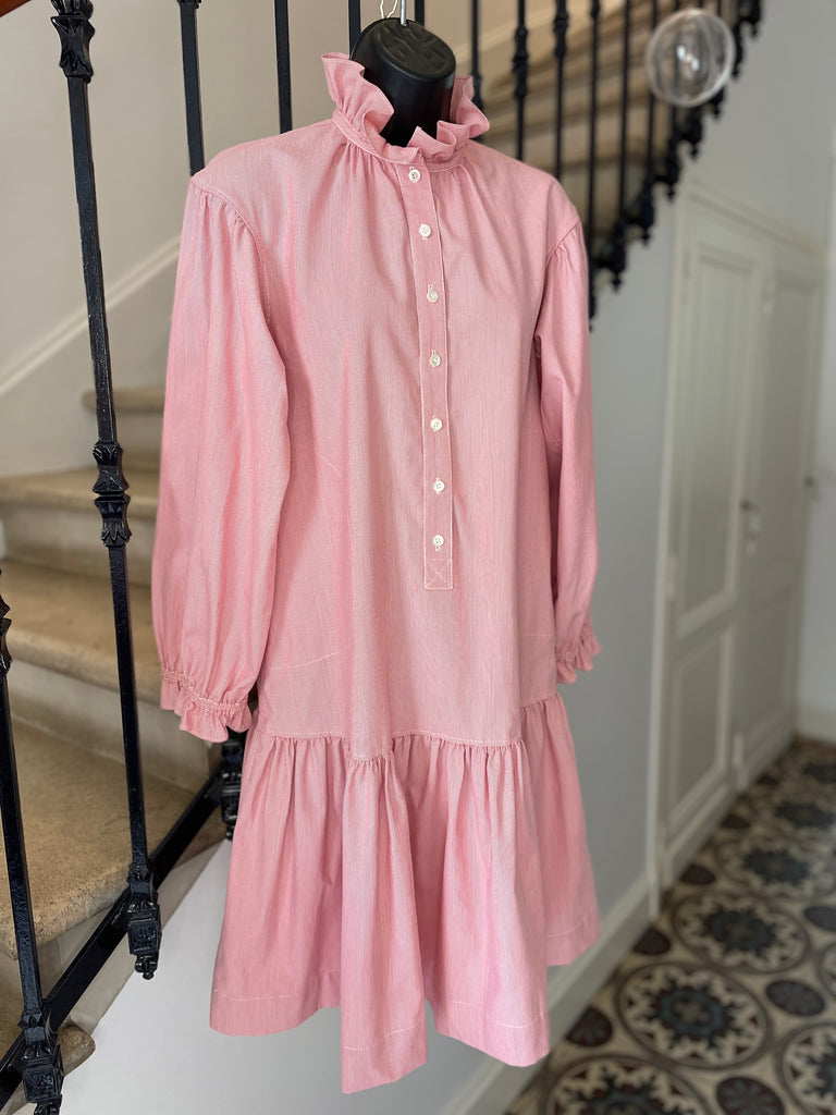 Robe en coton épais finement rayé rouge et blanc. Coupe ample légèrement évasée, épaules basses et volant sur le bas. Col et poignets avec volant (non élastique) et fermeture par simple boutonnage. 2 grandes poches latérales. Non doublée.