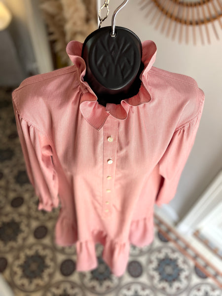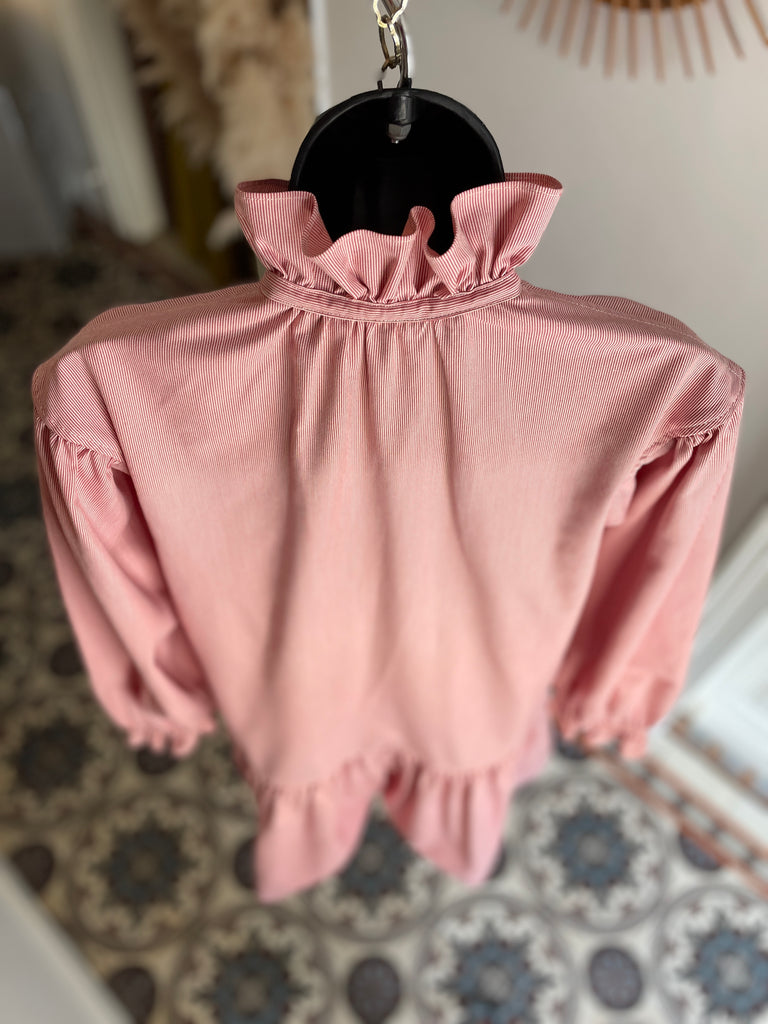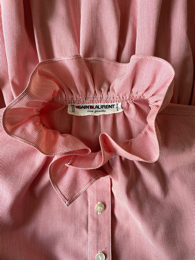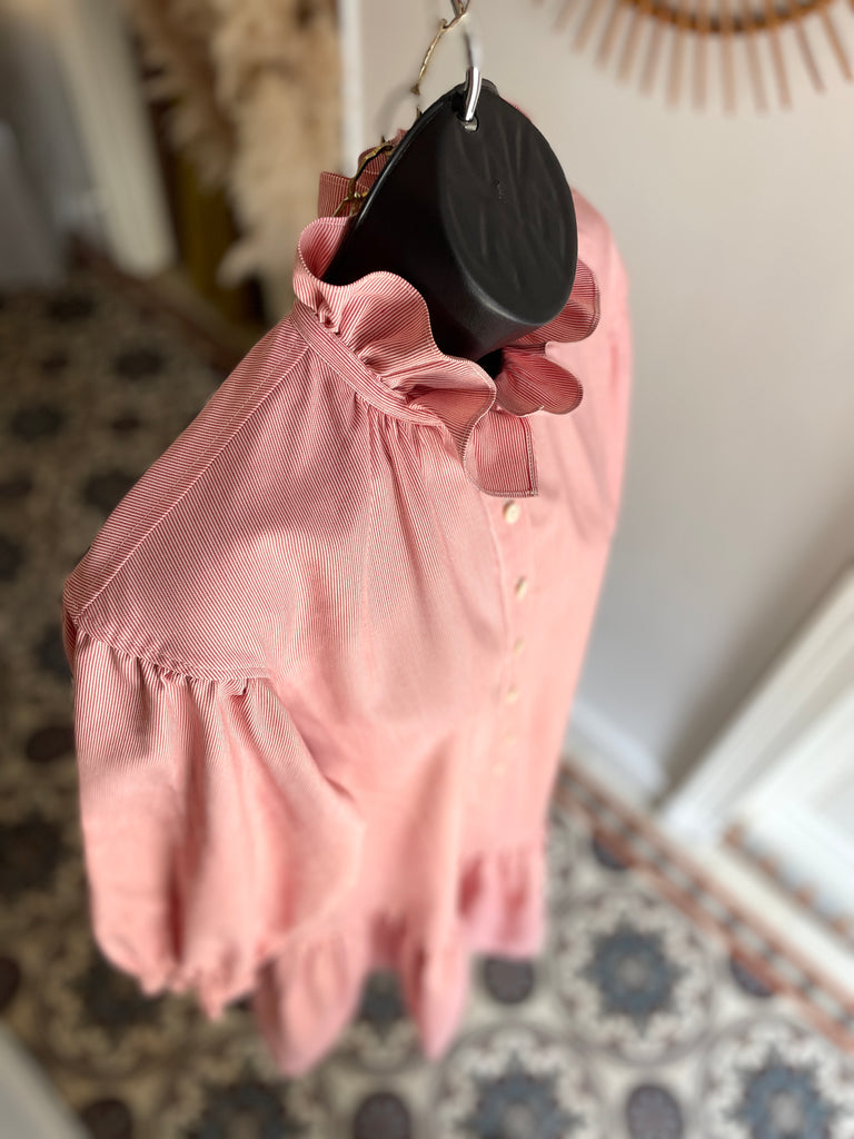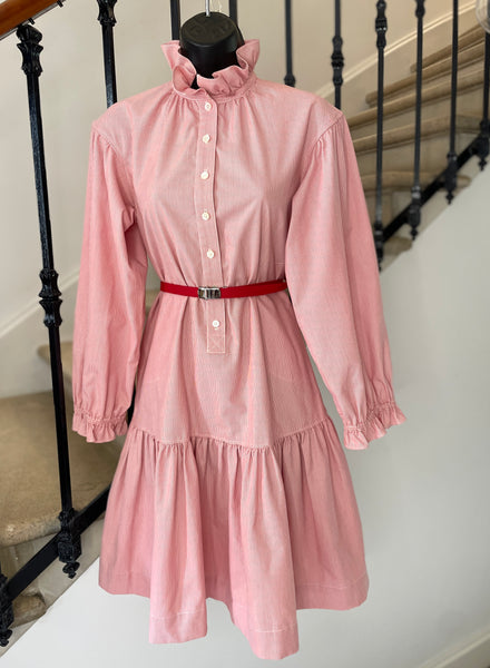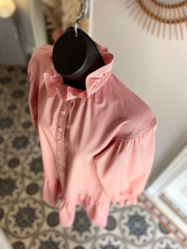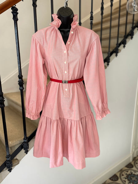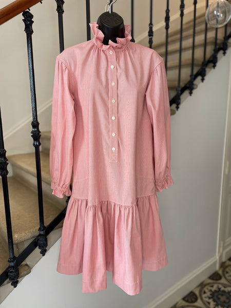Robe en coton épais finement rayé rouge et blanc. Coupe ample légèrement évasée, épaules basses et volant sur le bas. Col et poignets avec volant (non élastique) et fermeture par simple boutonnage. 2 grandes poches latérales. Non doublée.