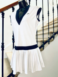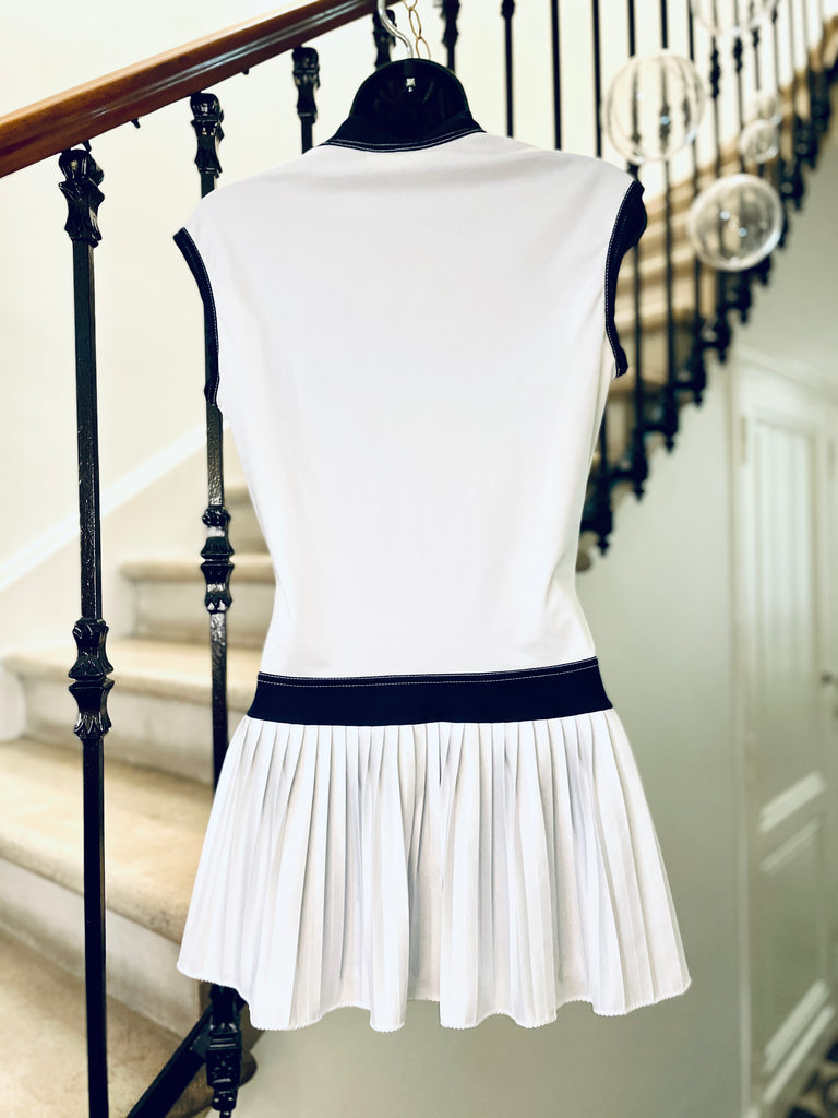 Mini robe en matière synthétique blanche et bleue. Encolure en V. Partie jupe plissée.
