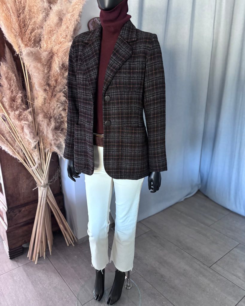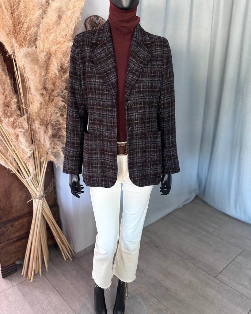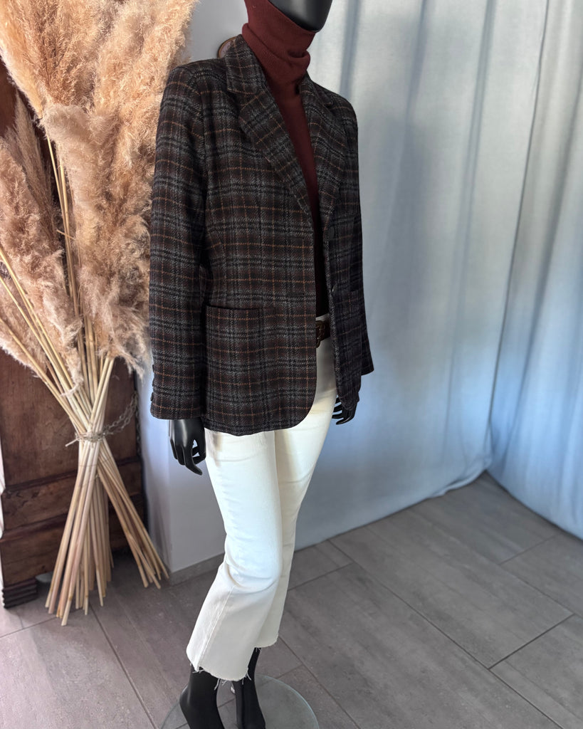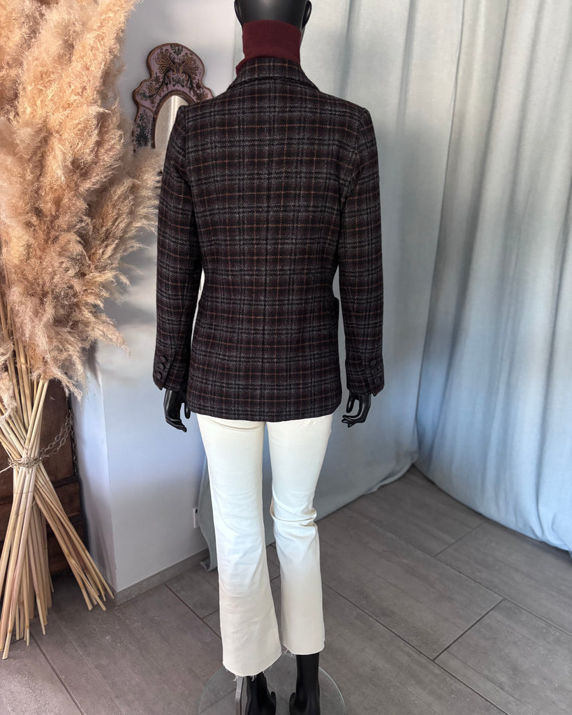 Veste en laine au motif tartan dans des couleurs gris, noir, marron et camel. Coupe lĂ©gĂšrement ajustĂ©e avec Ă©paulettes et fermeture par 2 boutons texturĂ©s façon bois. 1 pochette et 2 grandes poches plaquĂ©es et poignets terminĂ©s par 3 boutons dĂ©coratifs. DoublĂ©e.Â