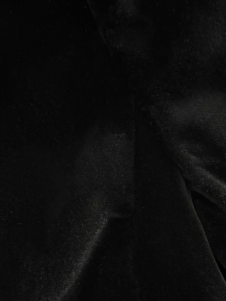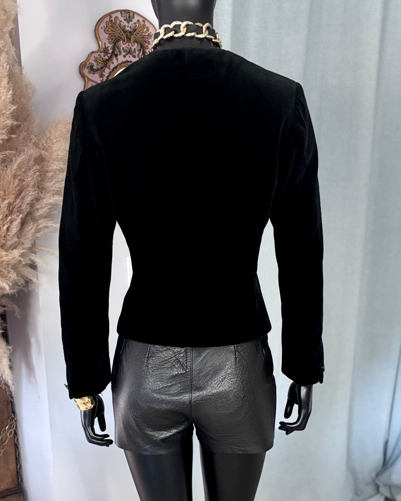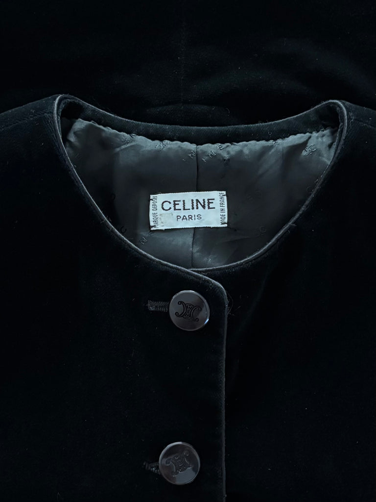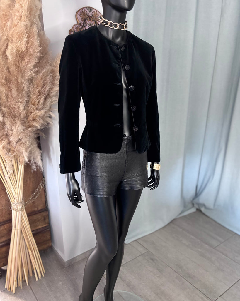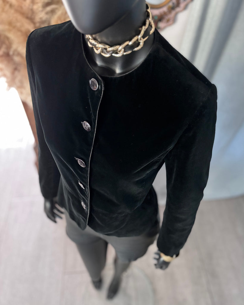 Veste en velours ras de couleur noire bordée d’un fin galon soyeux. Coupe ajustée, resserrée à la taille avec découpe façon basques, encolure ronde et haute et fermeture par boutons noir avec monogramme Triomphe. Manches 7/8 et poignets terminés par un bouton décoratif. Doublure siglée et monogrammée.