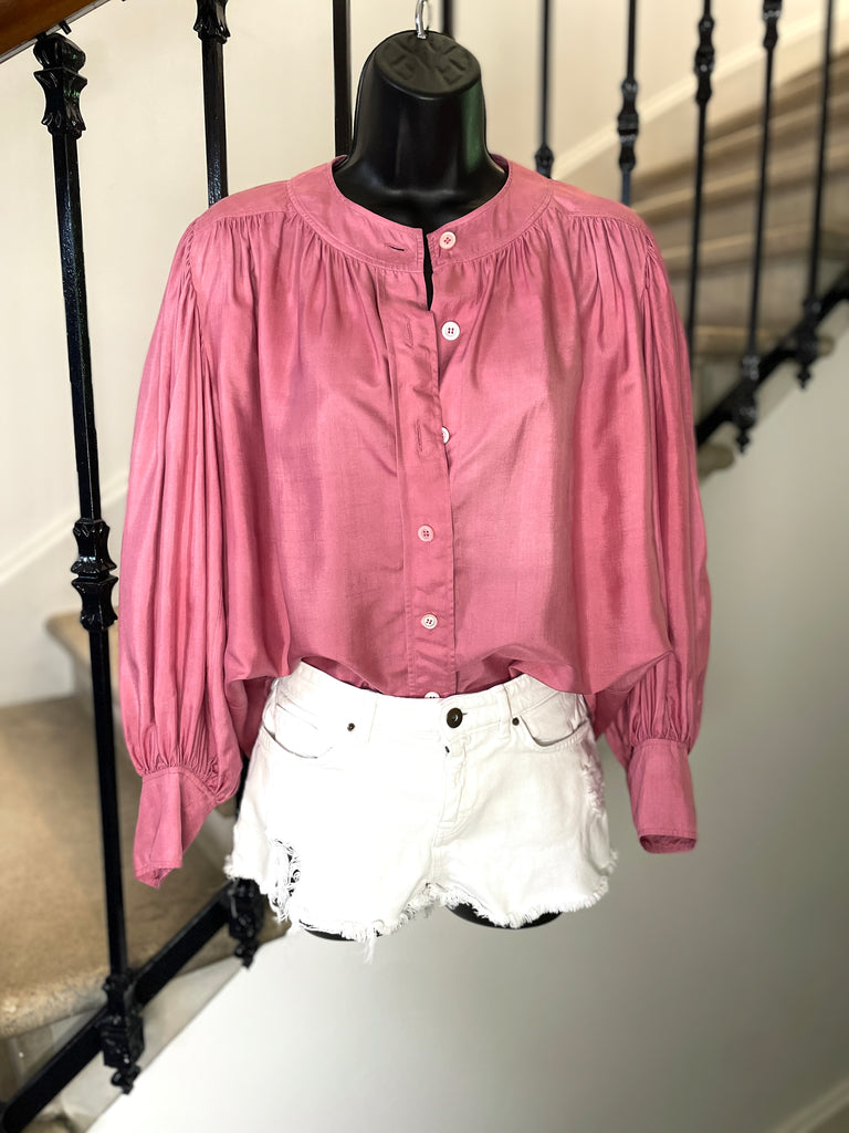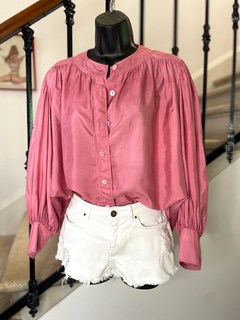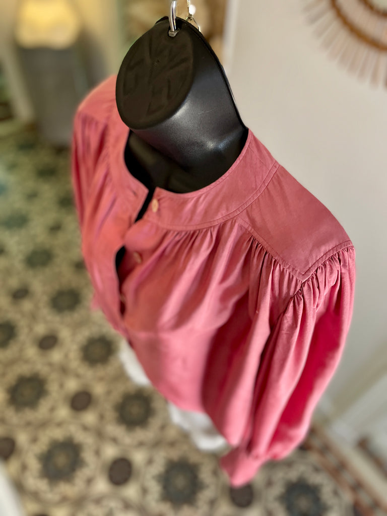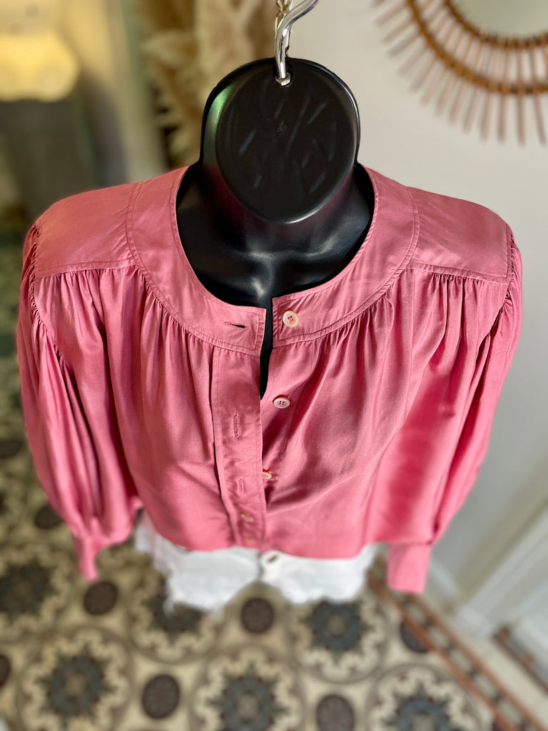 Chemisier en soie de couleur vieux rose acidulé. Coupe ample, encolure ronde, jeu de plis aux épaules et dans le dos, manches bouffantes avec larges poignets. Fermeture par simple boutonnage.