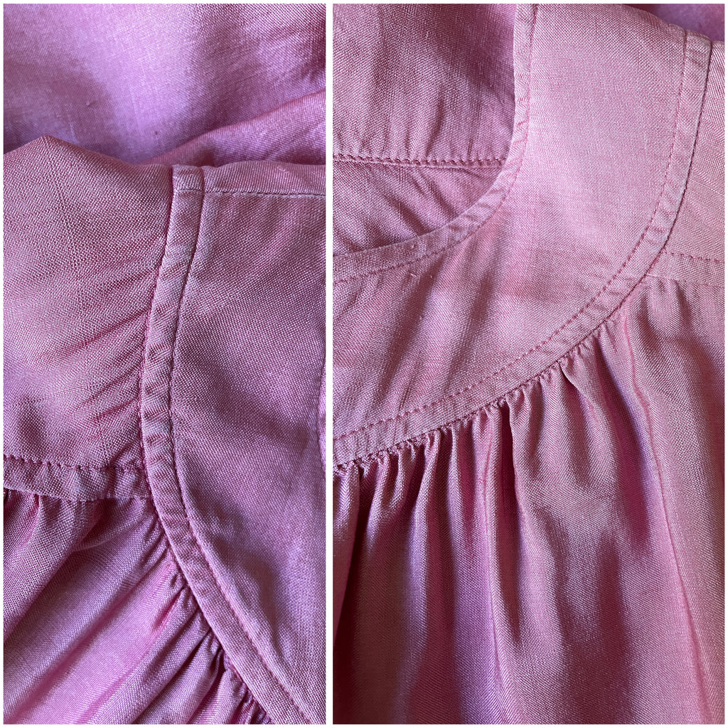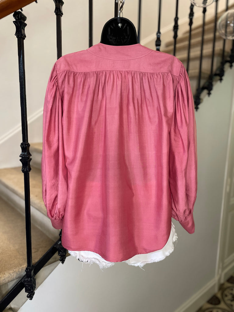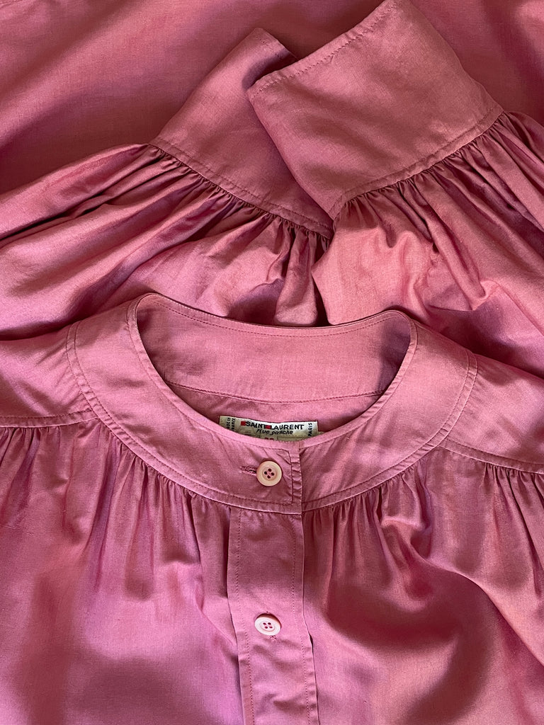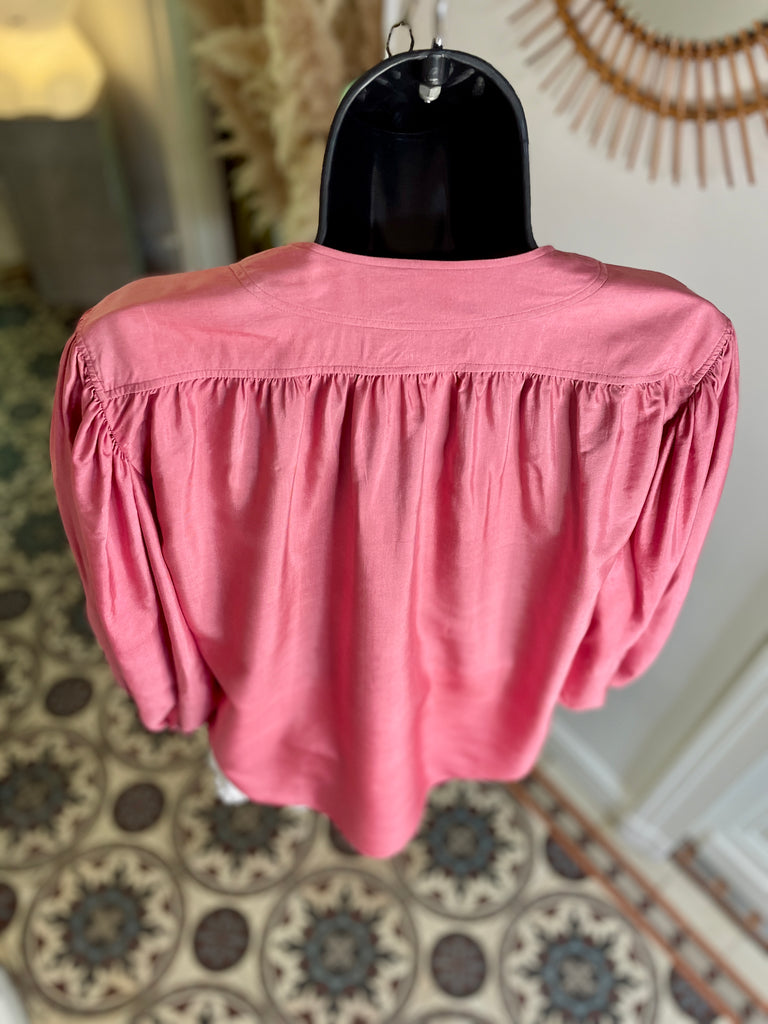 Chemisier en soie de couleur vieux rose acidulé. Coupe ample, encolure ronde, jeu de plis aux épaules et dans le dos, manches bouffantes avec larges poignets. Fermeture par simple boutonnage.