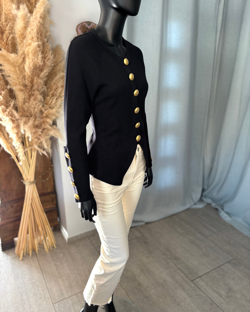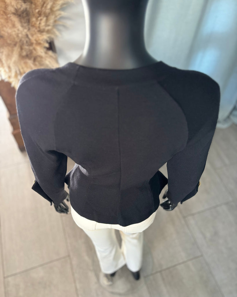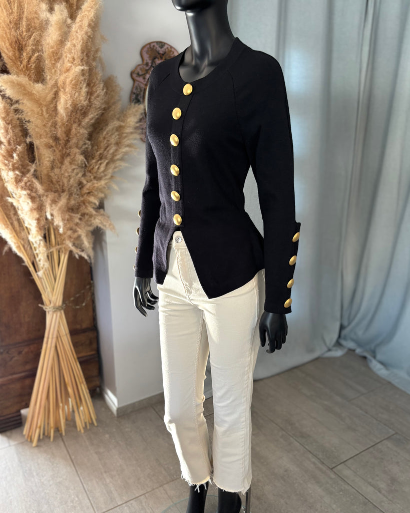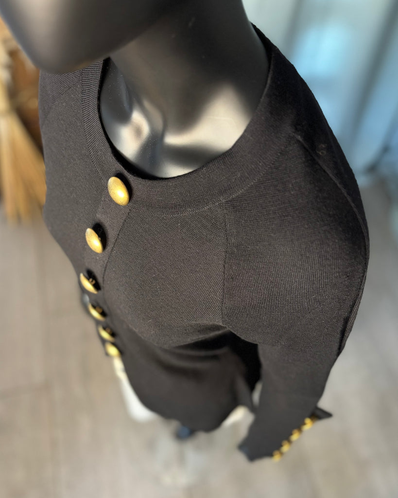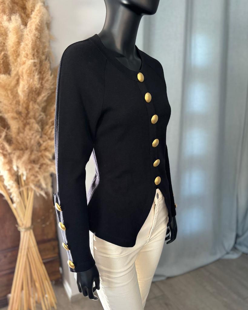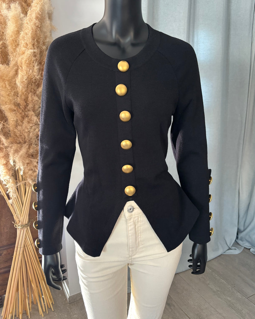 Pull en laine noire. Coupe ajustée à la taille avec découpe en pointe à l’avant et droite à l’arrière. Encolure ronde, gros boutons dorés effet polissé décoratifs. Manches raglan avec épaules légèrement marquées et poignets avec découpe et gros boutons décoratifs.